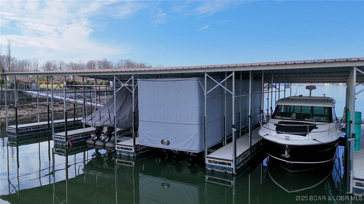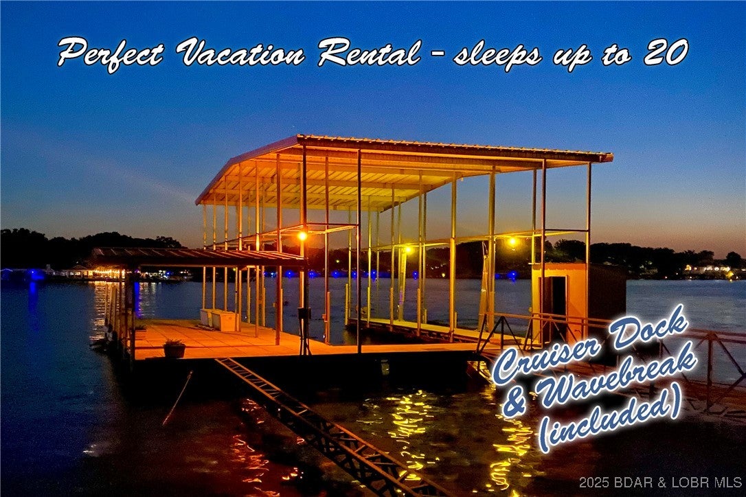7-BD 5.5 BA Custom One Owner Home with Hand-Hewn Wood Accents, Deep Water and AMAZING DOCK INCLUDED! Landscapping is lush and includes a water feature that leads to the custom 4 well dock w/ hangout space, diving board and high jump latter, not to mention the 18x55 boat slip. This dock would cost 250,000 to recreate! In One of the best DEEP WATER coves at the lake!This home blends warm rustic charm w/ modern comforts, wood details, warm wood floors, and grand fireplace greet you. Spacious kitchen, Thermador Appliances, granite, rich cabinetry, and ample prep space w/ island, gas stove is a chefs dream. The deck space off the main and lower level allows for gathering year round with room to relax and gather, whether youre soaking in the views or enjoying a quiet morning coffee. Upstairs offers 3 BRs of guest space (one with ensuite bath) and a bunk room where kids and cousins will make memories to last a lifetime! Lower family room has box beam ceiling, stone details, custom bar area and 3 more guest rooms! Memberships available Jack Nicklaus Signature golf course, the Club at Porto Cima is a private club with seven waterfront holes overlooking the beautiful Lake of the Ozarks.