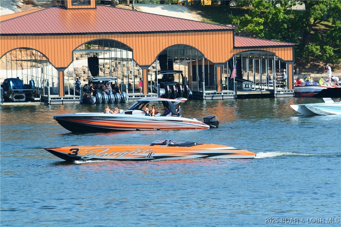 Beautiful custom-built home on the 24MM of the Osage, with cove protection and quick access to the main channel! Ideally located near Margaritaville and many of the Lakes favorite spots, this 6-bedroom, 5.5-bath property is designed with lake living and entertaining in mind. The open floor plan features vaulted ceilings and expansive windows that fill the home with natural light and stunning views. The spacious kitchen is equipped with high-end appliances, a pot filler, granite countertops, a large island, and a separate formal dining roomperfect for hosting family and friends. Incredible finishes throughout, including custom details, stylish fixtures, and tiled walk-in showers. Downstairs, a large great room with wet bar offers plenty of space for gatherings, along with ample storage and walkout access to the private pool. Covered concrete decks provide outdoor living space rain or shine, while the oversized two-car garage with golf cart door makes lake life easy.A brand-new dock with 12x34, 10x26, and 12x12 slips to fit all your boating needs.Combining quality construction, a great location, and plenty of resort-style amenities, this home is a true Lake of the Ozarks retreat.