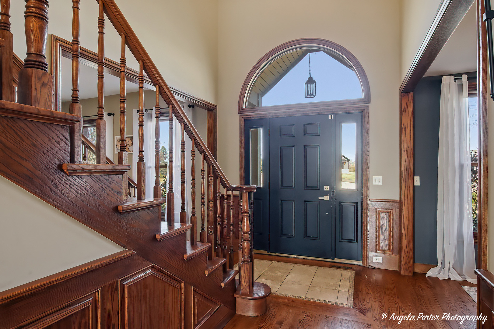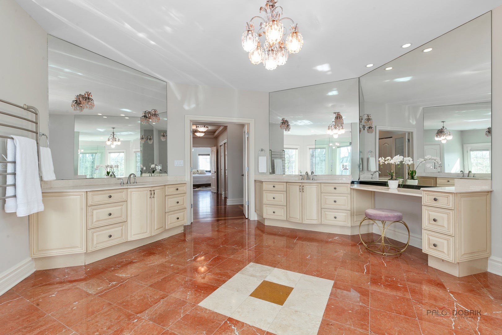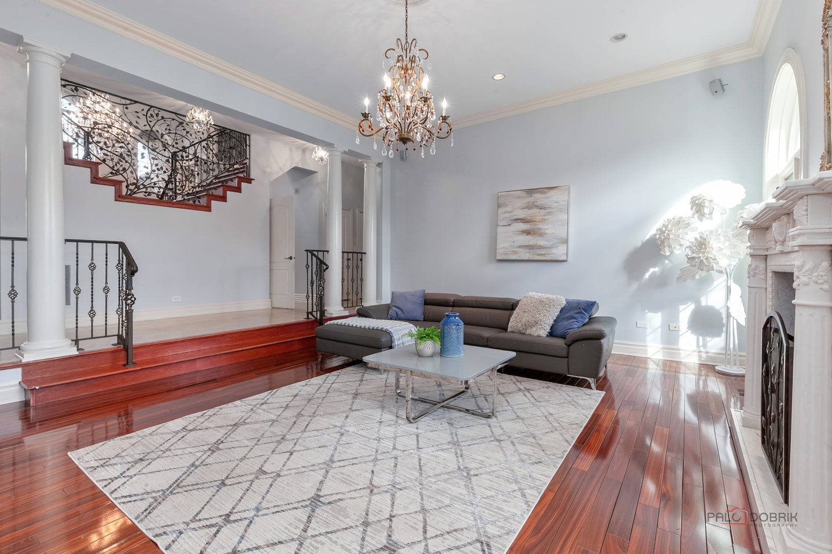 Welcome to this exceptional 61 bedroom, 6-bathroom corner-lot residence in prestigious Lincolnshire, proudly served by award-winning Adlai E. Stevenson High School and Laura B. Sprague School. A dramatic two-story foyer with a grand chandelier ceiling and elegant wrought-iron staircase creates a breathtaking first impression, complemented by full marble flooring throughout the main level.