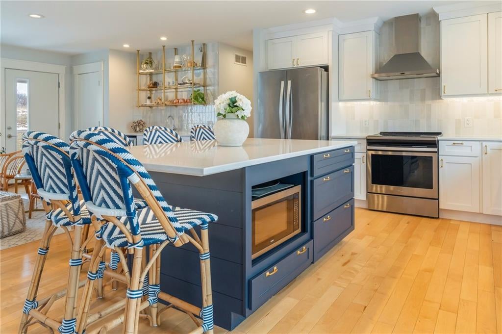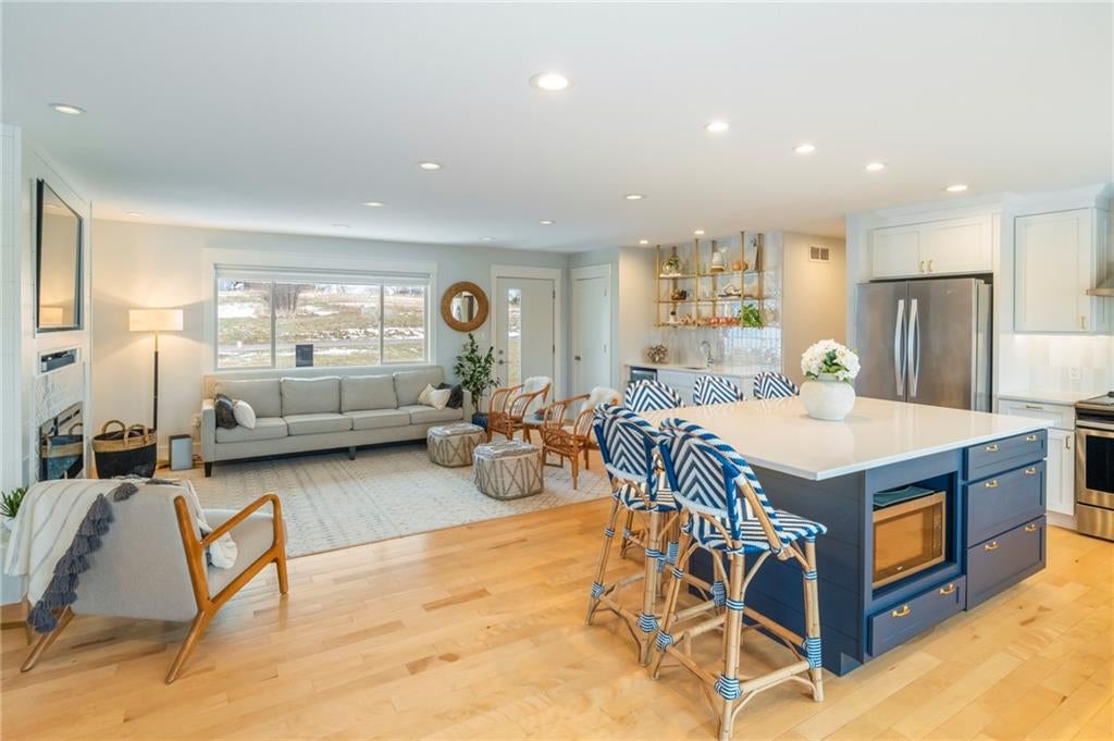 Magazine-Worthy Waterfront Living! Welcome to this stunning turn-key waterfront retreat where craftsmanship and thoughtful design shine in every detail. From the rich reclaimed oak floors to the beautifully crafted walnut cabinetry, this home blends elegance with warmth, creating a grand yet inviting atmosphere.