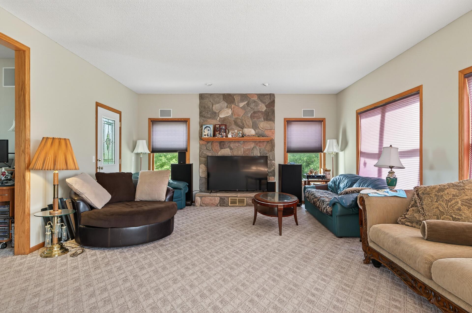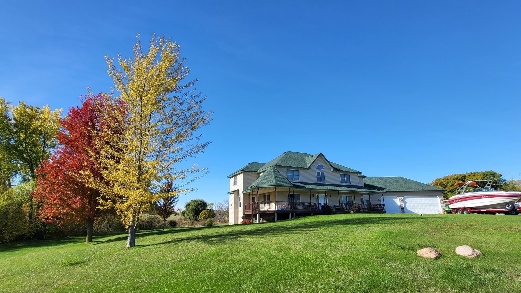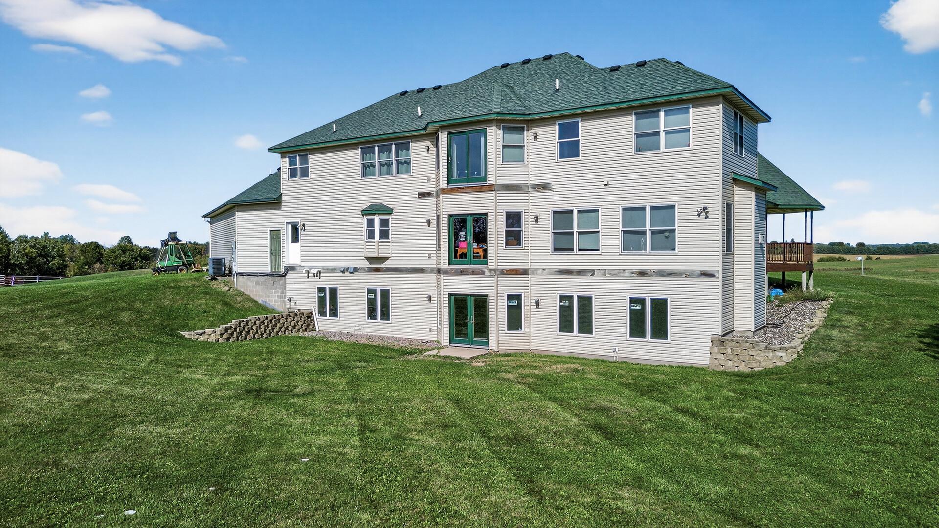 Welcome to 19155 263rd St, an exceptional custom-built home situated on 2.5 private acres along the St. Croix River in the prestigious St. Croix Bluffs neighborhood. This unique estate features a stunning floor-to-ceiling stone fireplace and impressive towering ceilings, along with cherrywood custom cabinets and tigerwood hardwood floors.