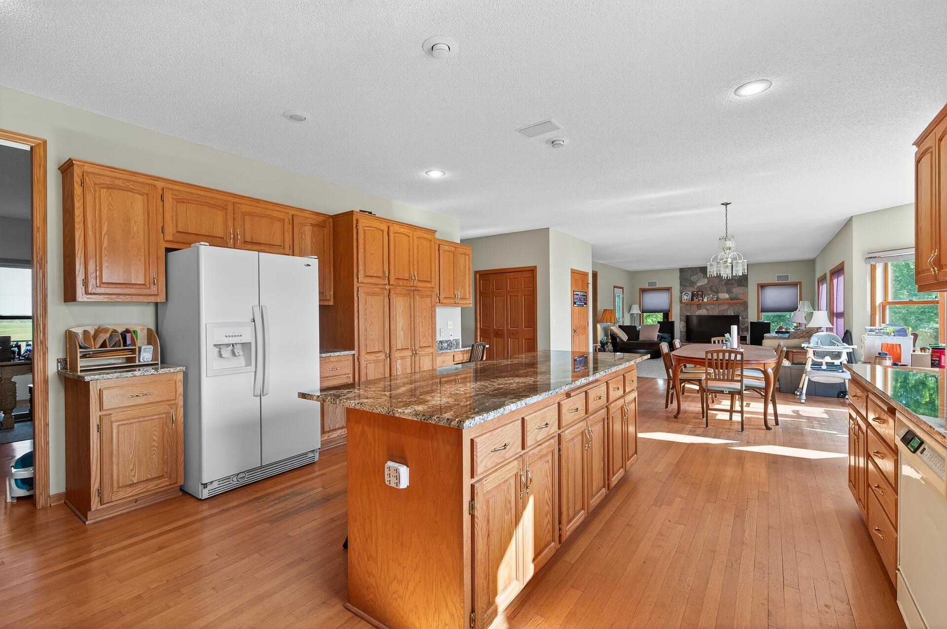This impressive 5-bedroom, 4-bathroom rambler sits on a serene, wooded 2.5-acre lot, offering the perfect blend of luxury, comfort, and everyday ease. Thoughtfully designed for main-level living with a walkout lower level and generous indooroutdoor spaces, the home delivers both quiet retreat and standout areas for entertaining. The main level welcomes you with high ceilings, rich Brazilian Cherry flooring, and a bright, open layout ideal for gathering. At the heart of the home, the gourmet kitchen anchors the space with its large island, quality finishes, high-end appliances, and effortless flow to the dining area and deck for easy indooroutdoor living. A warm and inviting living room features a vaulted ceiling and stone-surround fireplace, while a four-season sunroom adds a cozy year-round escape. The main-level primary suite offers a true haven with a fireplace, walk-in closet, and spa-inspired ensuite with heated floors. Additional rooms on this level provide flexible options for bedrooms, office space, or hobby use, all supported by smart home features and designated mudroom and laundry areas. The walkout lower level expands the living space with a large family room and home theater, recreation area, wet bar, sauna, two bathrooms and three additional bedrooms-perfect for guests or hobbies. Outside, the fully fenced backyard, deck, patio, and beautiful landscaping create an inviting extension of the home. A heated, insulated workshop and EV-ready 3-car garage enhance everyday functionality, while recent mechanical updates add peace of mind. Elegant, comfortable, and designed for effortless living, this home is a true retreat ready to enjoy.