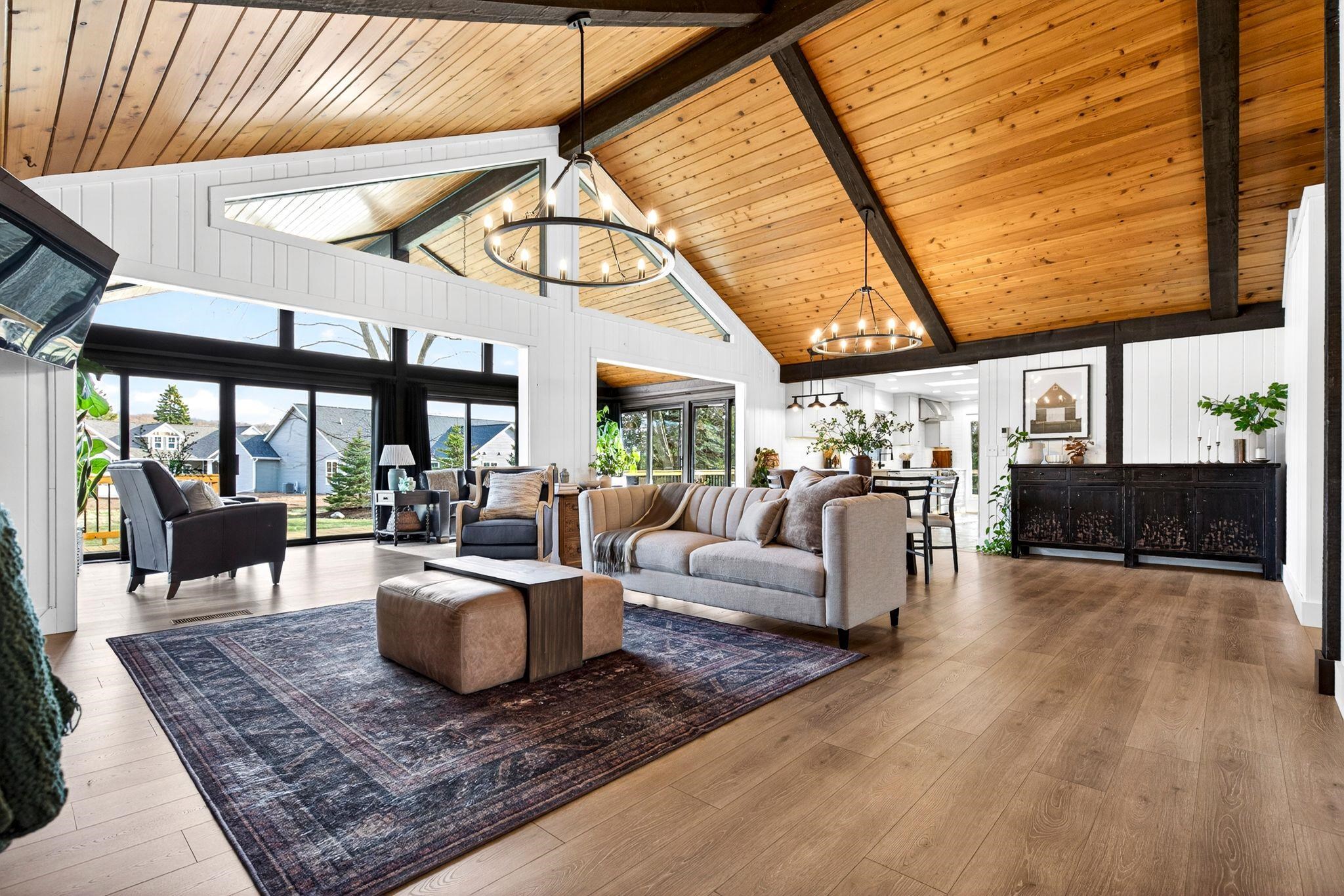 Welcome to this extraordinarily custom-built 2025 lakefront home on Legend Lake, offering 100 ft of sandy frontage. This stylish 5-bd, 3-ba year-round retreat features an open-concept design with floor-to-ceiling windows & a stunning gas fireplace showcasing panoramic lake views. Enjoy the heated 3-season room with vertical track window system for extended outdoor living. Set on .60 wooded acres at the end of a quiet road, the property offers privacy and serenity. An oversized garage fits vehicles and a boat, plus convenient first-floor laundry. Luxury, comfort, and lake life perfectly combined. Schedule your showing today & you can be settled into this home and taking in all it has to offer in time to enjoy spring and summer!