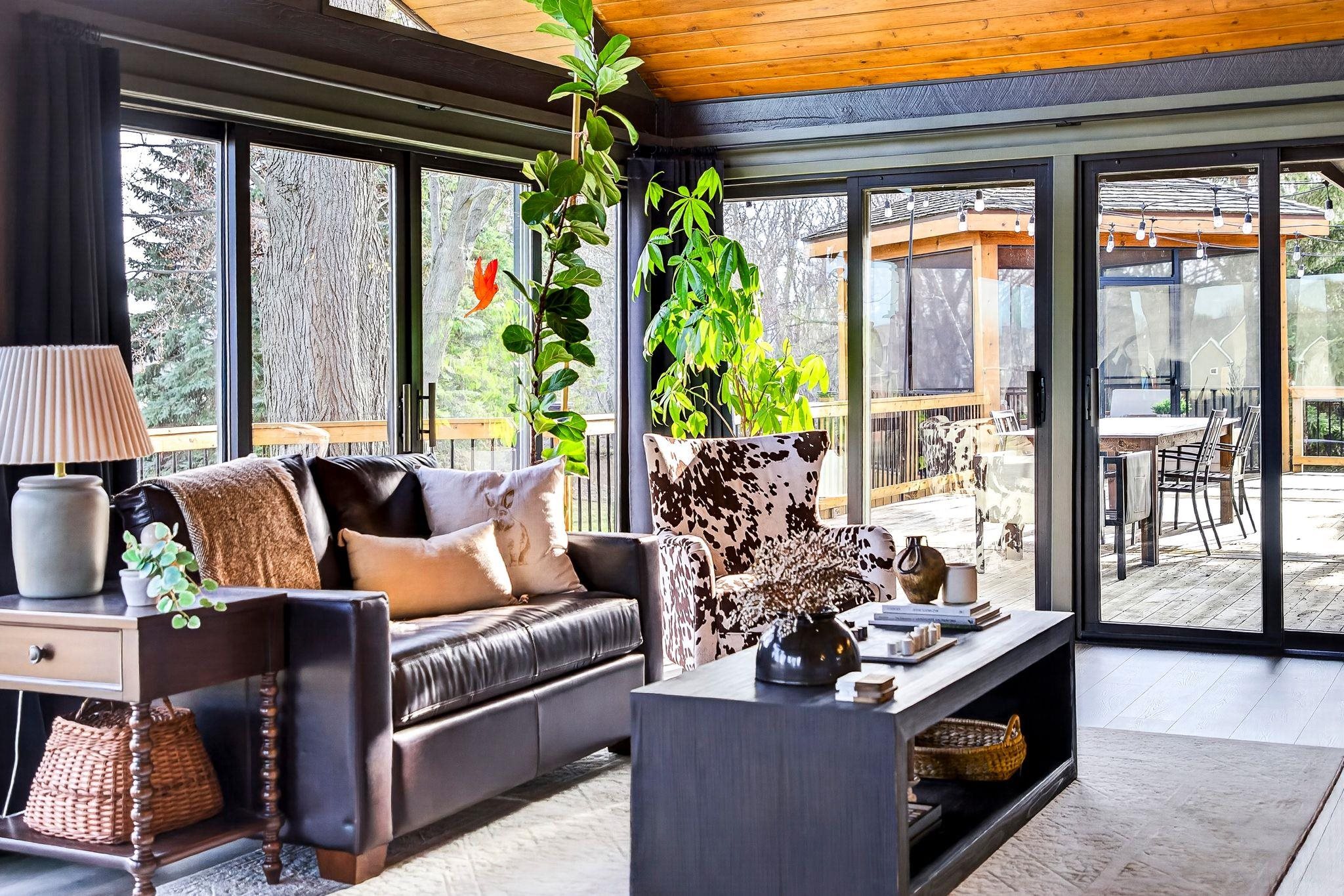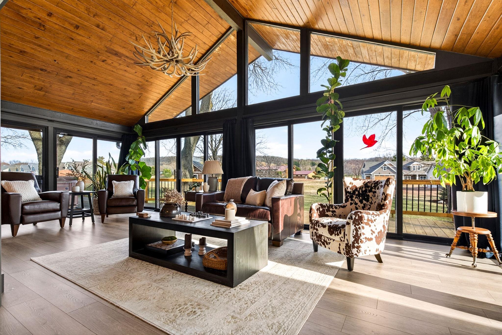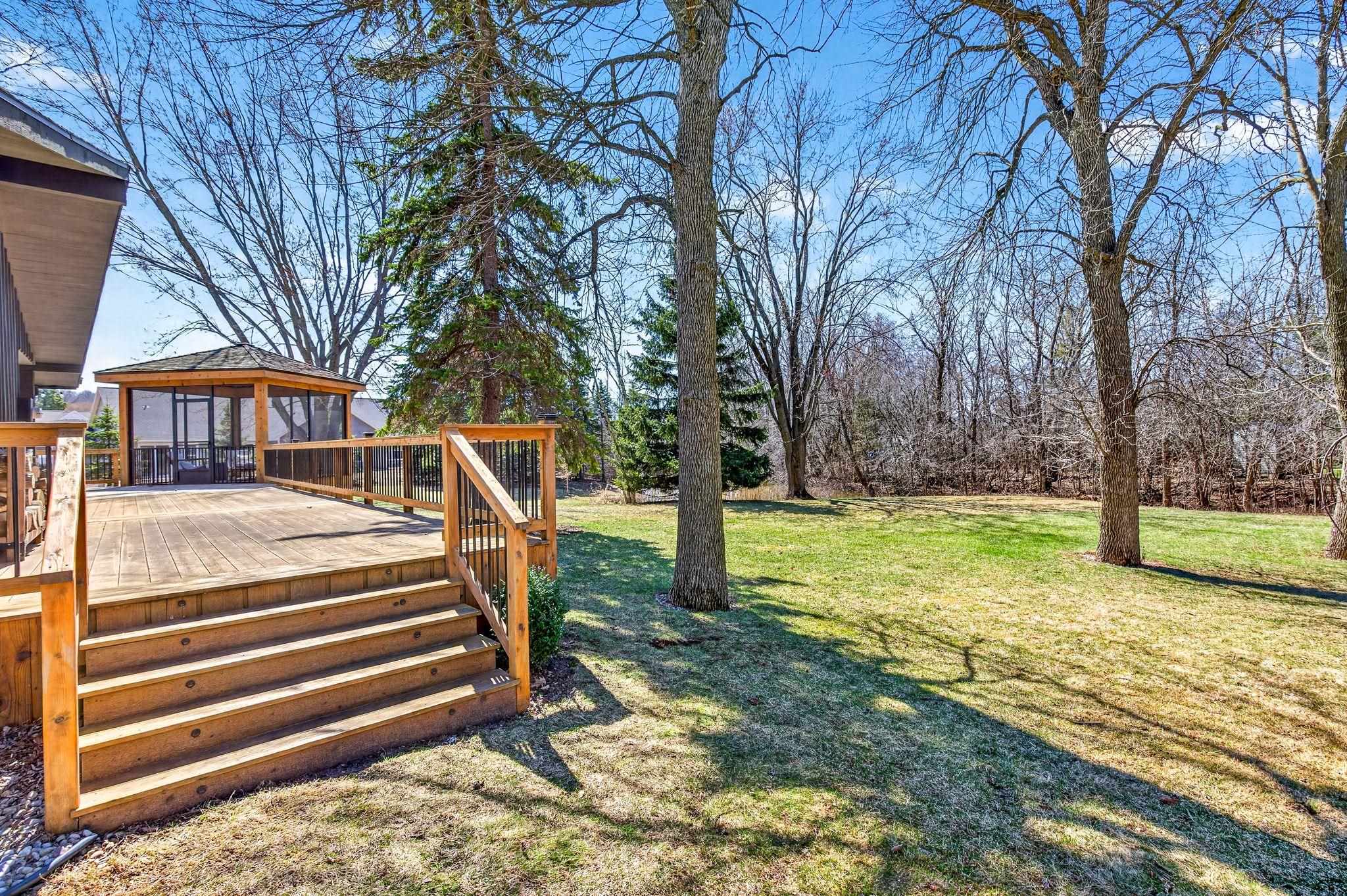 Exquisite quality and refined design define this stunning 5 bedroom modern residence, ideally located within walking distance to Centennial Centre Marketplace. Nestled in the sought-after Woodfield Prairie neighborhood, residents enjoy access to a community pool, offering effortless resort-style living. Professionally landscaped grounds with an in-ground sprinkler system frame a private, wooded backyard and an inviting three-season room perfect for year-round relaxation. The finished lower level is an entertainer's dream, featuring a spacious gathering area, dedicated fitness space, and expansive daylight windows that fill the home with natural light. A rare blend of luxury, privacy, and convenience in a premier location.