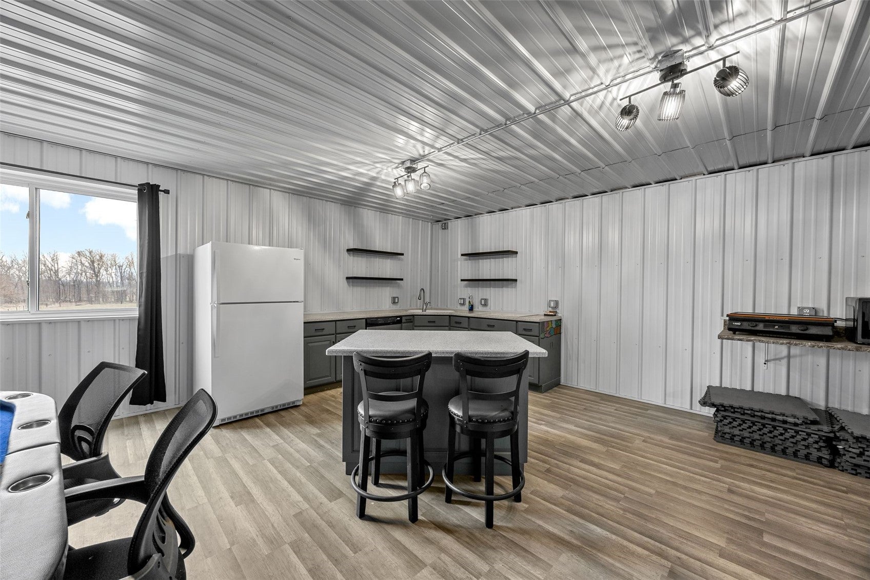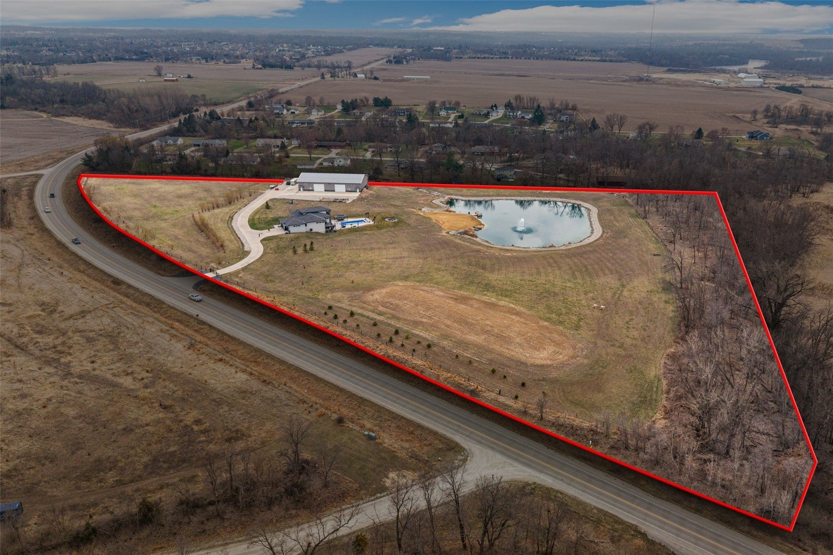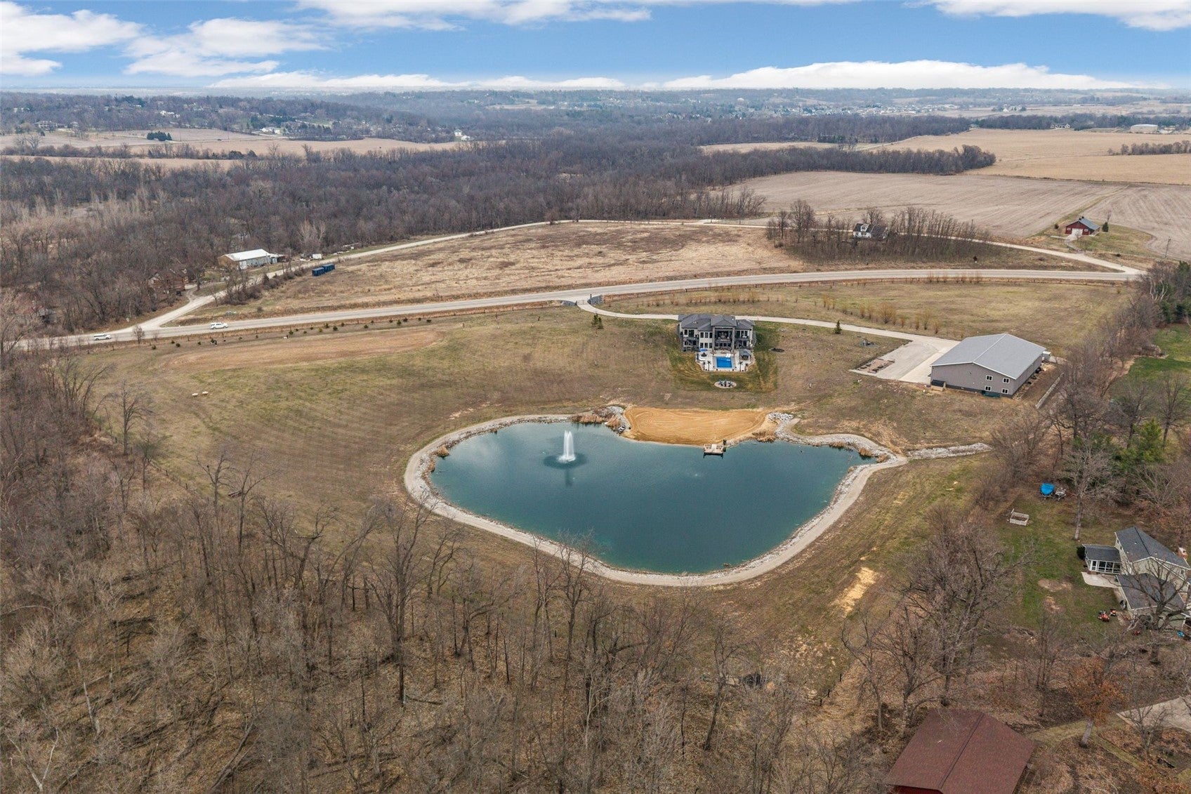 NOW THIS IS LIVING. Secluded. Scenic. Unforgettable. Welcome to 17 acres of pure privacy, where a wooded backdrop, a fully stocked pond, and jaw-dropping sunsets become your everyday view. This 4,587 finished square foot modern masterpiece was architecturally designed to bring the outdoors inevery line, every window, every finish intentionally crafted to showcase the beauty surrounding you. No shortcuts hereonly top-tier materials, elevated design, and undeniable pride of ownership throughout. Entertain like never before.The great room flows seamlessly onto a covered deck through massive floor-to-ceiling doors, creating a true indoor-outdoor experience. A remote-controlled phantom screen system transforms the space in seconds, while two separate staircases lead you down to your private backyard oasis. And what an oasis it is- a walkout lower level with a sleek wet bar, an in-ground pool built for summer, and beach-front access to your own stocked pond. No HOA. No restrictions. Just freedomminutes from city amenities. And then theres the shopA massive 72 x 120 commercial-grade building that takes this property to another level: Two 14X20 and one 14X24 overhead doors, Radiant heat & floor drains, second floor living space, and golf simulator setup. Whether its business, hobbies, or the ultimate hangoutthis space delivers. The 2.5-acre pond is the crown jewel25 feet deep with a polyvinyl liner, fully stocked, featuring a beach entry, rock surround, and a stunning LED-lit fountain that brings it to life at night. Private. Luxurious. One-of-a-kind. This isnt just a homeits a lifestyle.