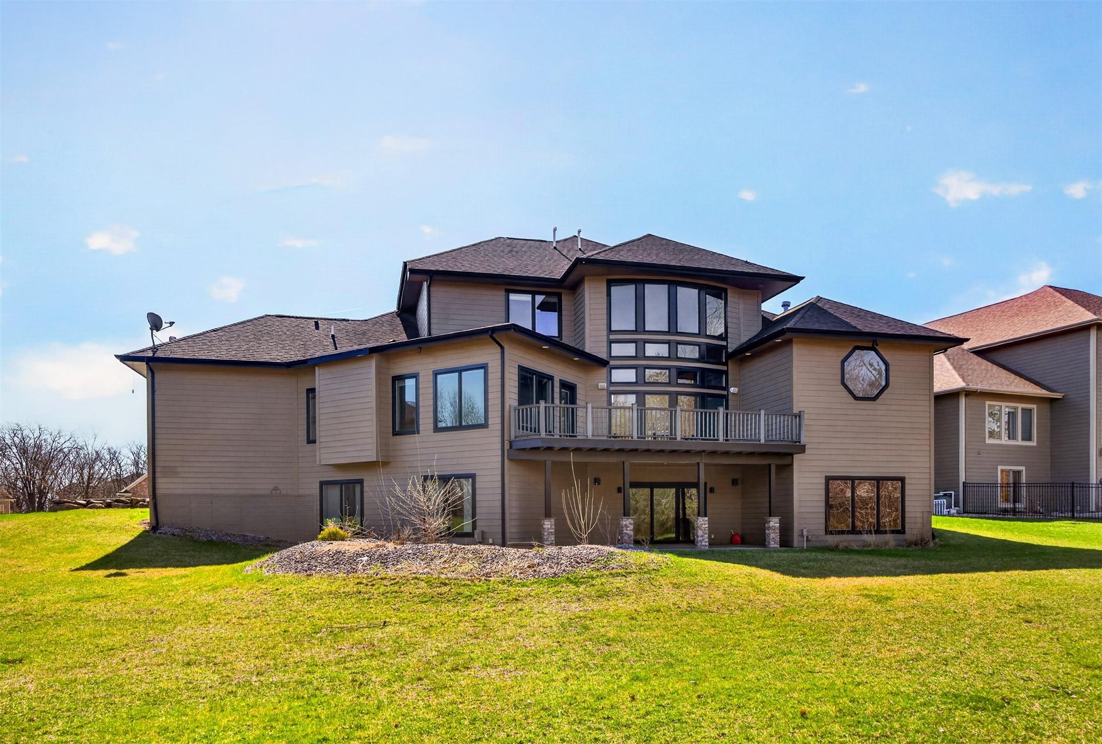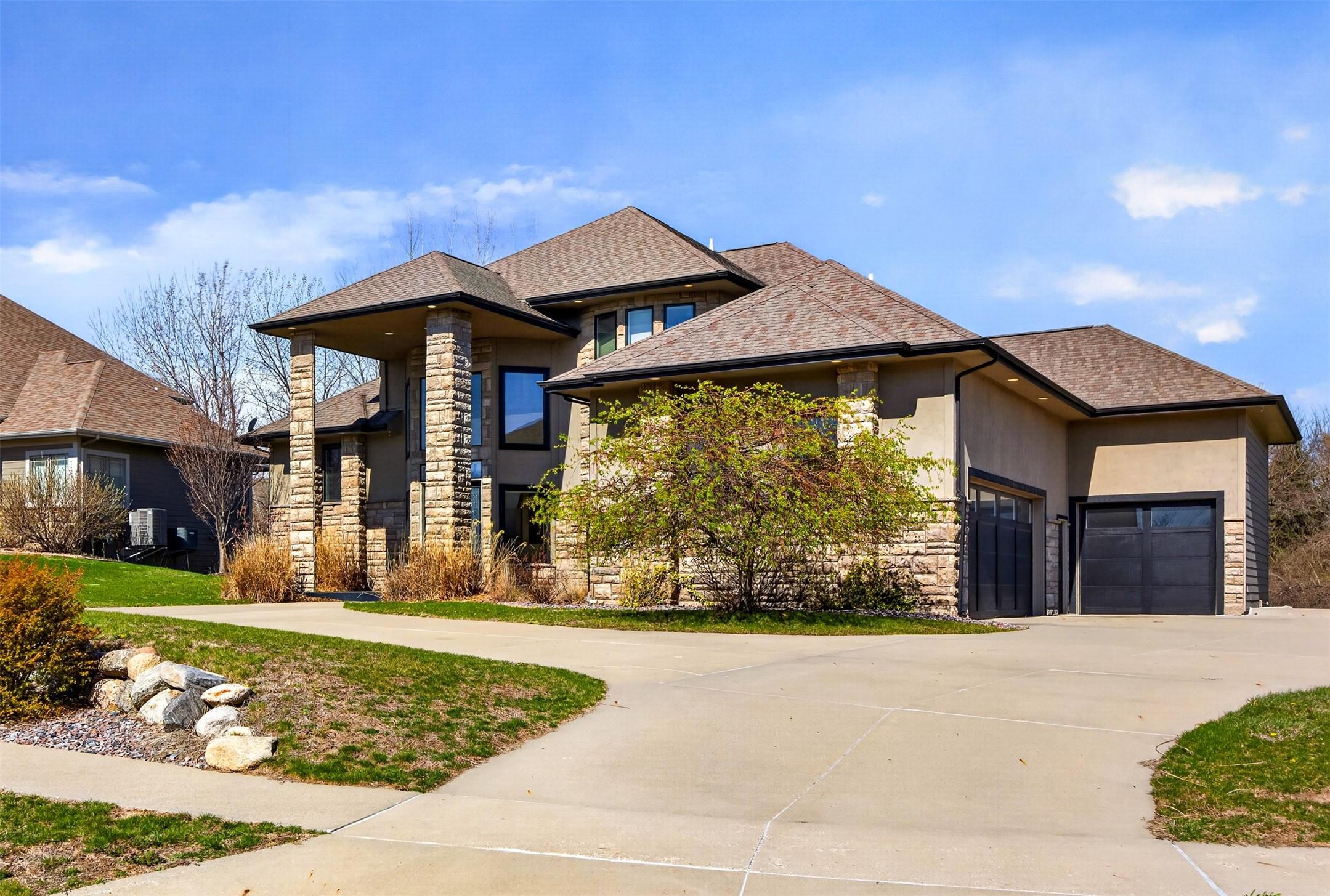 Located in the desirable Verona Hills neighborhood, this architecturally distinctive home offers exceptional space, style, and value with direct access to the Little Walnut Creek Trail and quick connectivity throughout the metro. The interior is defined by a dramatic exposed center staircase - leave it open for architectural impact or enclose it to create gallery-style art walls for a truly custom feel. A soaring two-story great room features a statement stone fireplace and a wall of built-in niches. The kitchen is both stylish and functional, offering abundant cabinetry, generous prep space, and a unique built-in aquarium ready to be reimagined for creative use. An expansive dining area opens directly to the outdoor deck, ideal for everyday living and entertaining.The primary suite is a private retreat loaded with natural light, a spa-like bath featuring tile shower, freestanding soaking tub, fireplace wall, dual vanities, and an oversized walk-in closet with center island and secondary laundry. Two additional bedrooms upstairs share a Jack-and-Jill bath. The main level includes a second laundry and half bath.The walkout lower level expands the homes versatility with a built-in bar, theater room, gym, additional bedroom, two full baths, and a walk-in closet, plus access to the patio. Oversized three-car garage with storage and a rare half-circle driveway provide ample parking.Bank-owned property sold as-is. A compelling opportunity in a premier Clive location.