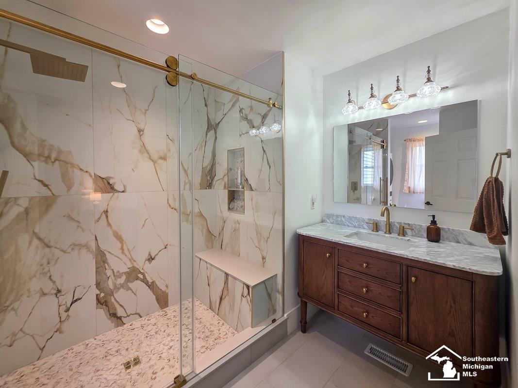 Gorgeous & very nicely updated 3 bedroom 2 1/2 bath brick ranch updated 2022 on a wide 75ft lot! Newer finished basement with family room with natural fireplace, basement kitchen, bonus room & updated full basement bath 2023, large living room with fireplace, updated kitchen with granite counters, breakfast bar, dining area, open floor plan, updated first floor half bath 2023, large bedroom sizes with custom closet shelving & special order doors, hardwood flooring, updated first floor full bath with skylight 2023, high ceiling, new roof 2023, large covered deck off back of home - could be converted into additional 240 sqft, 2 car garage, large covered front porch, great curb appeal, home is close to Dearborn Golf Course, along with many other shops & restaurants, Dearborn School District, Certificate of Occupancy ready, all data apx.