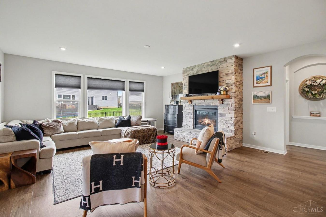 This exceptional modern luxury home is drenched in natural light and showcases over 4,300 square feet of sophisticated living space, including a beautifully finished lower-level recreation area, sitting on just over an acre. The open-concept main floor features soaring ceilings, expansive windows, and a striking gas fireplace that anchors the great room. The gourmet kitchen is a chefs dream with sleek cabinetry, a walk-in pantry, a gas cooktop, a Bosch wall oven and microwave, and a premium Frigidaire Professional side-by-side refrigerator and freezer. The first-floor primary suite offers a spa-like retreat with a dual vanity bath, freestanding soaking tub, oversized tile shower, private commode room, and custom walk-in closet. Electronic blinds on the first floor provide effortless comfort and privacy. Upstairs, two generous bedrooms, a full bath, and a versatile loft offer elegant additional living space. The lower level provides a stylish recreation area with endless possibilities and is plumbed for a third full bath. Step outside to a private resort-style backyard featuring an expansive covered patio, an in-ground heated fiberglass pool with sun deck and automatic cover, and lush professional landscaping with exquisite lighting. The exterior is enhanced by timeless hardscaping and gutter guards surrounding the home for easy maintenance. Additional amenities include a three-car side-entry garage, a fenced yard, an entire yard with an irrigation system for plush grass, a hot tub (negotiable), a custom mud hall with built-in bench seating, a designer laundry room with storage cabinetry, and a chic pocket office ideal for work or nursery use. The elevated powder room showcases designer wallpaper, adding a touch of sophistication, while two zoned HVAC systems ensure year-round comfort in this meticulously designed, high-end residence that perfectly blends modern elegance with luxurious everyday living. Reverse Osmosis Water System Included.