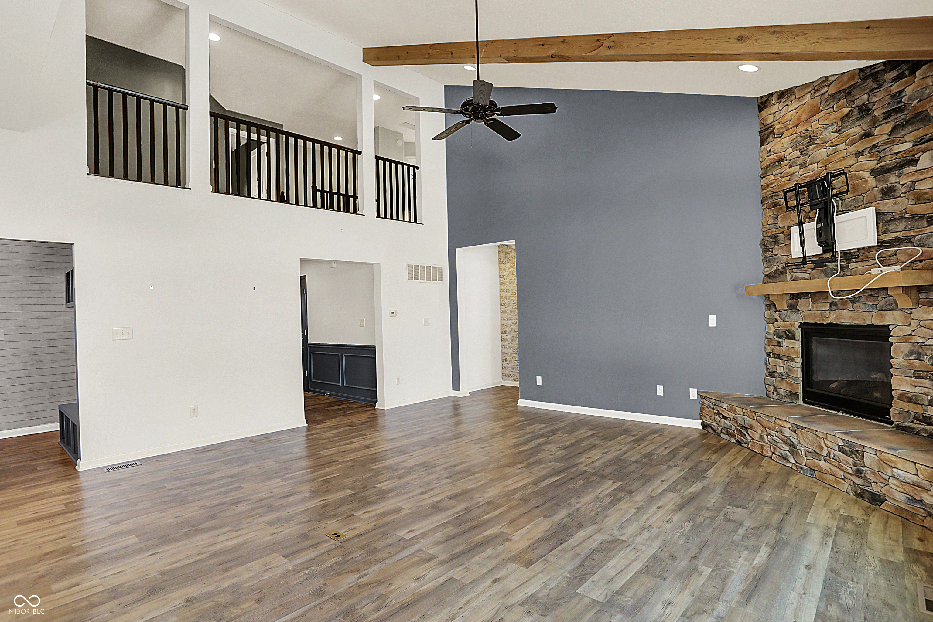 This stunning 5-bedroom, 4.5 bath home offers incredible views of Heritage Lake and an abundance of space for family and friends. The updated kitchen is truly the heart of the home-completely open to the dining room and great room-featuring an oversized island for meal prep and seating, plus ample cabinetry for storage. From the dining area, step out to the large screened-in porch, where you can enjoy lake activity and al fresco dining without the bother of bugs. The great room boasts vaulted ceilings and a dramatic floor-to-ceiling stone fireplace, creating a warm and inviting space with a touch of grandeur. The main-level primary suite is a private retreat with serene lakefront views and direct deck access-perfect for sipping your morning coffee while soaking in the calm waters. Upstairs, youll find two generously sized bunkrooms, each with their own full bathrooms-ideal for hosting large gatherings, where kids or guests can enjoy their own private spaces. The walkout basement expands your living and entertaining options with a second fireplace, a spacious recreation room perfect for a pool table or ping pong, built-in shelving, and a second screened porch overlooking the water. This level also includes two additional bedrooms, a full bathroom, and a laundry room. Outside, the gentle slope to the shoreline makes access easy and enjoyable. The expansive dock area includes two boat slips and plenty of space to relax by the water, fish, or launch into lake fun. This home has everything you need to enjoy lake life to the fullest-plenty of bedrooms, thoughtful gathering spaces, and some of the best views Heritage Lake has to offer.