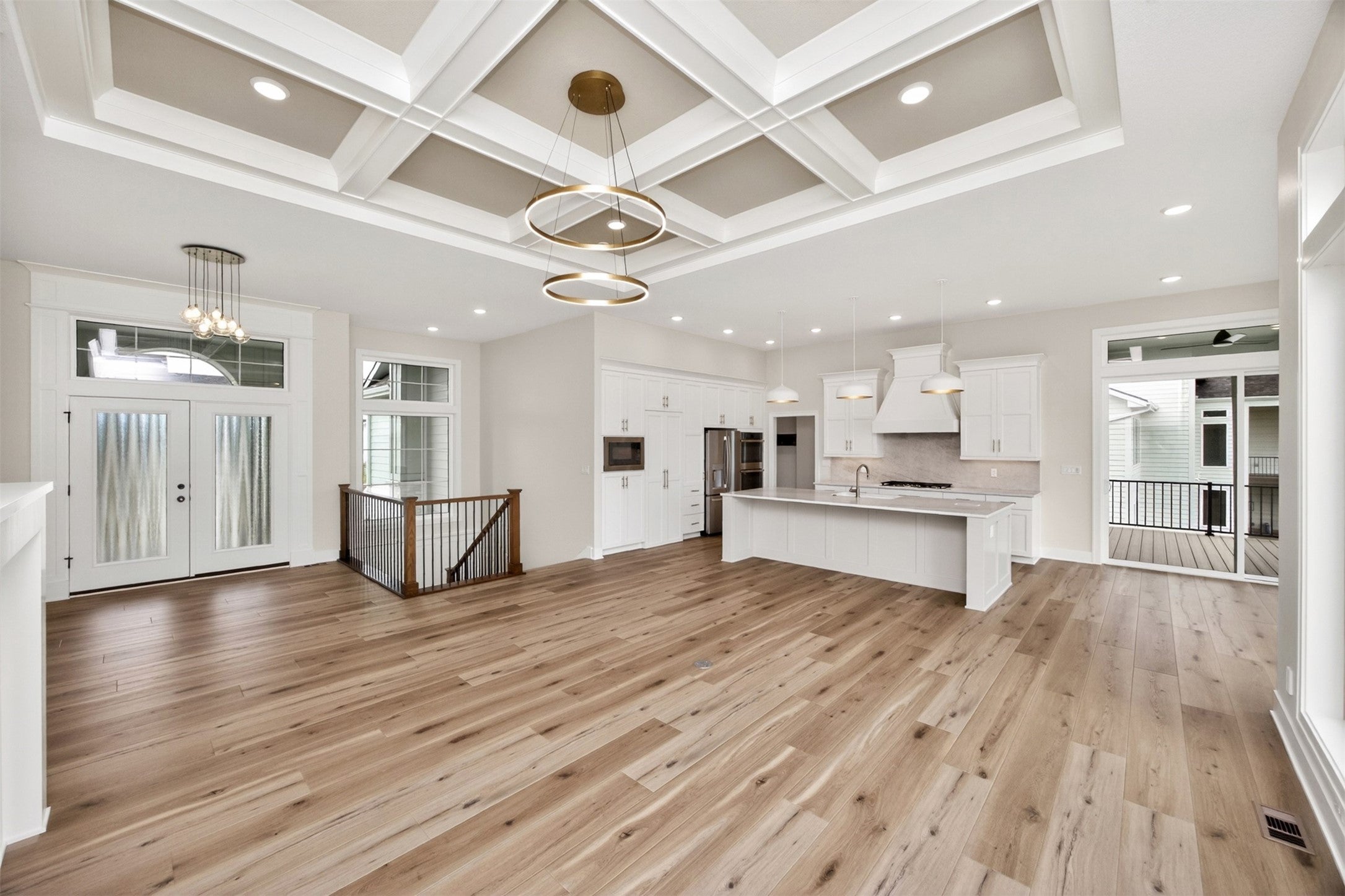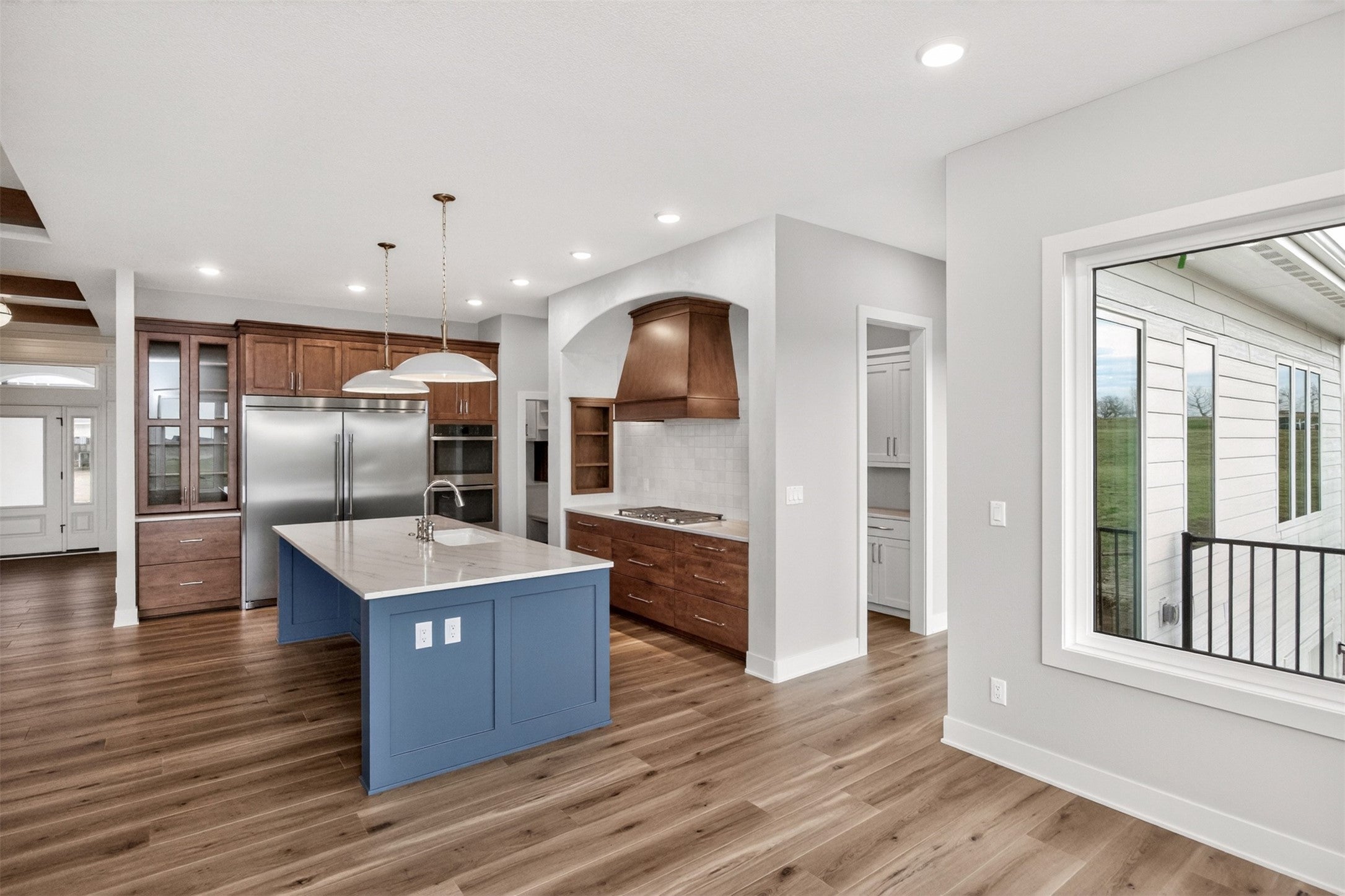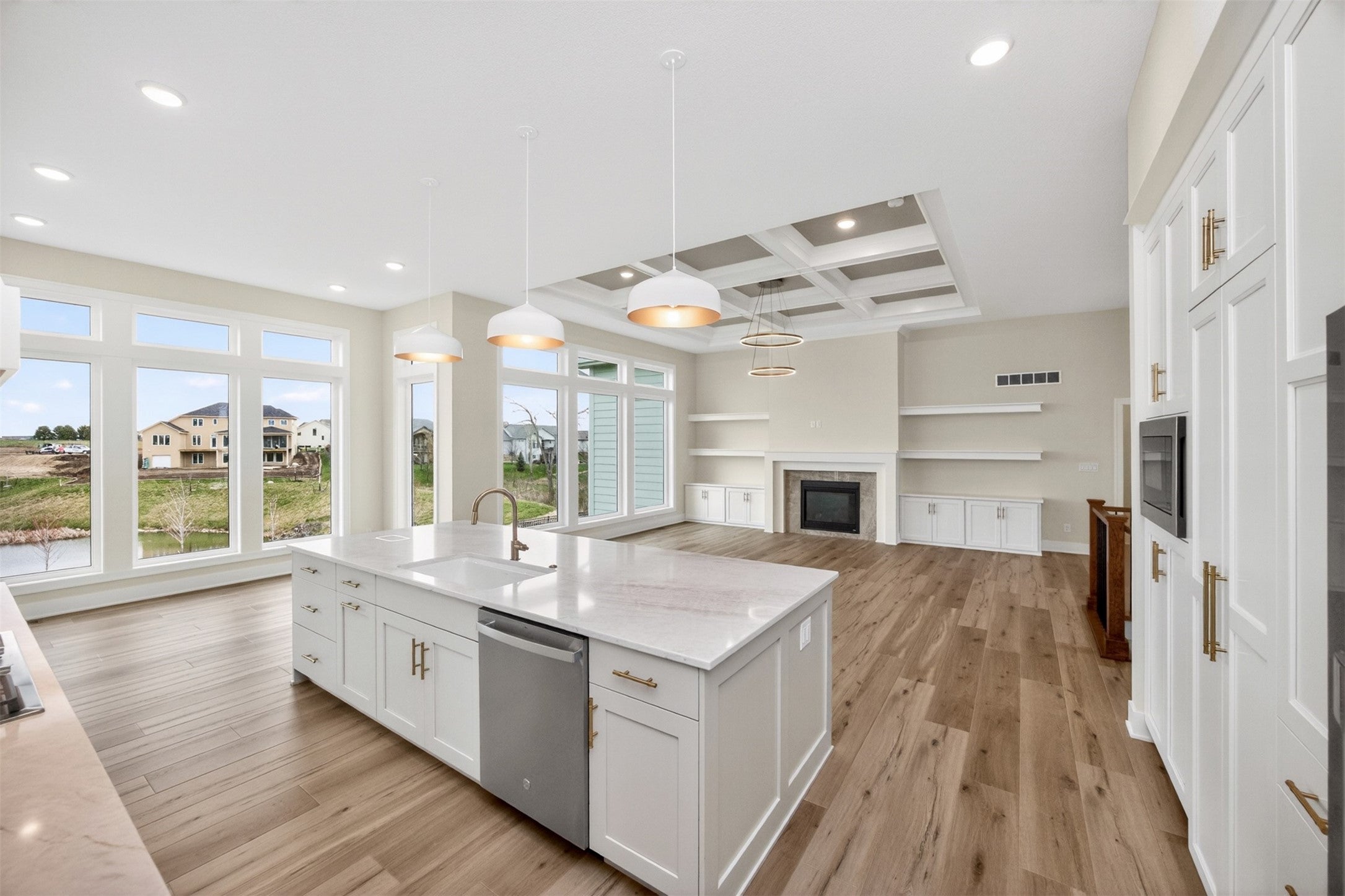 Exceptional new walkout ranch backing to a peaceful pond in the Acadia community, known for its consistent yet unique homes. This home features a spacious 3-car garage plus a John Deere garage. Large windows throughout capture pond views and bring in abundant natural light. The open kitchen and family room include a large granite island, wall ovens, walk-in pantry, and quality finishes.