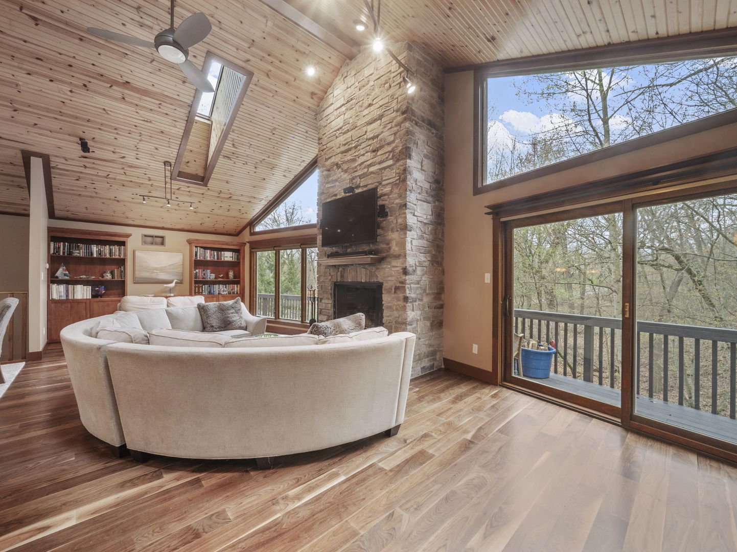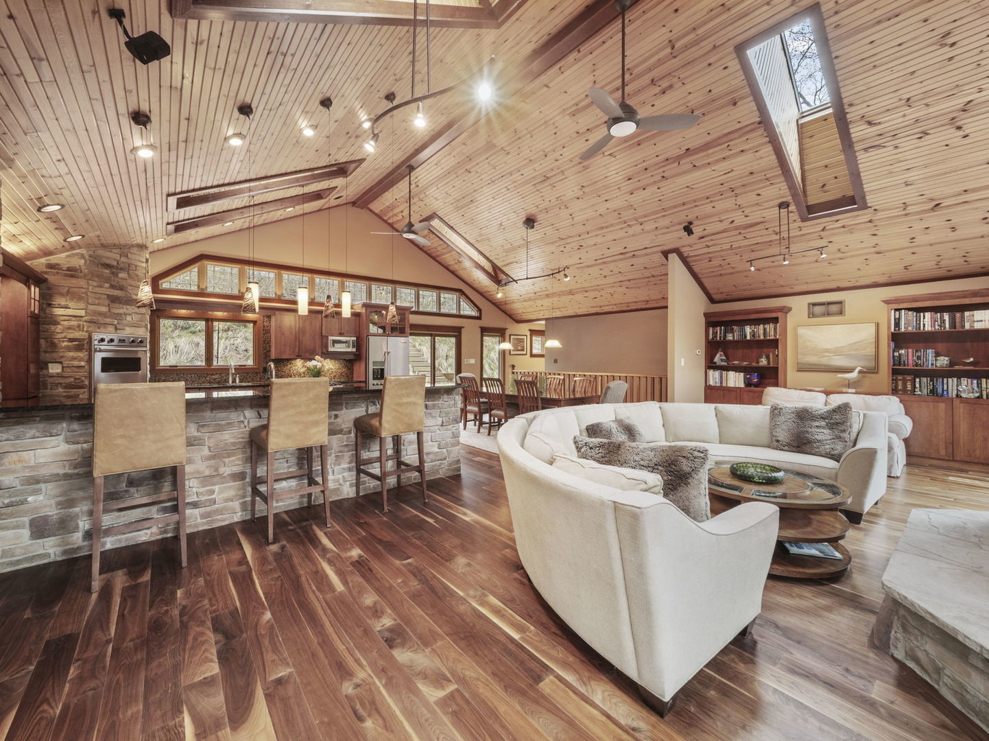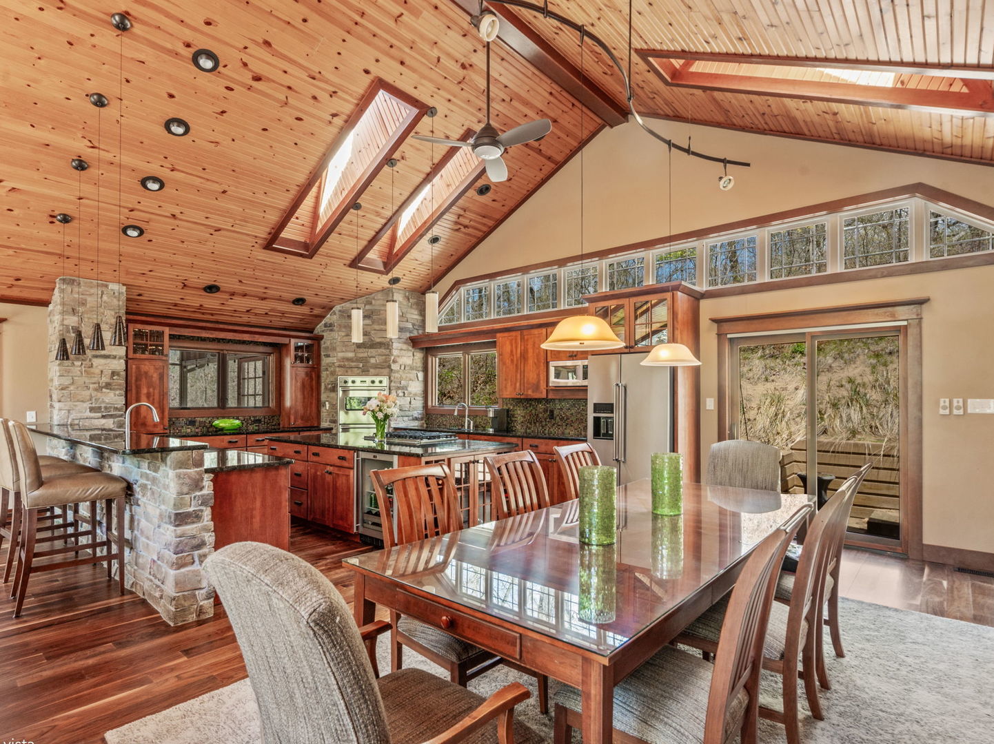 This 4BED/3.5BATH luxury home is set high against a dune, surrounded by native landscaping and undeveloped forest, offering exceptional privacy. Wraparound porches and balconies overlook a lush yard and private ravine. With 3,790 square feet of living space, this retreat features bright, open rooms with twelve-foot ceilings, tall windows, and skylights showcasing beautiful, unobstructed views. A dramatic entry with a custom walnut staircase leads to an expansive dining area accommodating twelve, while the great room opens to a screened porch perched above the scenic dune ravine. A dramatic cathedral height stone fireplace anchors the living, dining, and kitchen areas in a stunning great room with large skylights, a wall of windows, built-in bookshelves, a natural wood ceiling, and gorgeous wide plank premium walnut floors. A private 2nd-Floor Guest Suite with its own bath provides an ideal escape, and two nearby beaches with golf cart and car parking complete the coastal lifestyle!