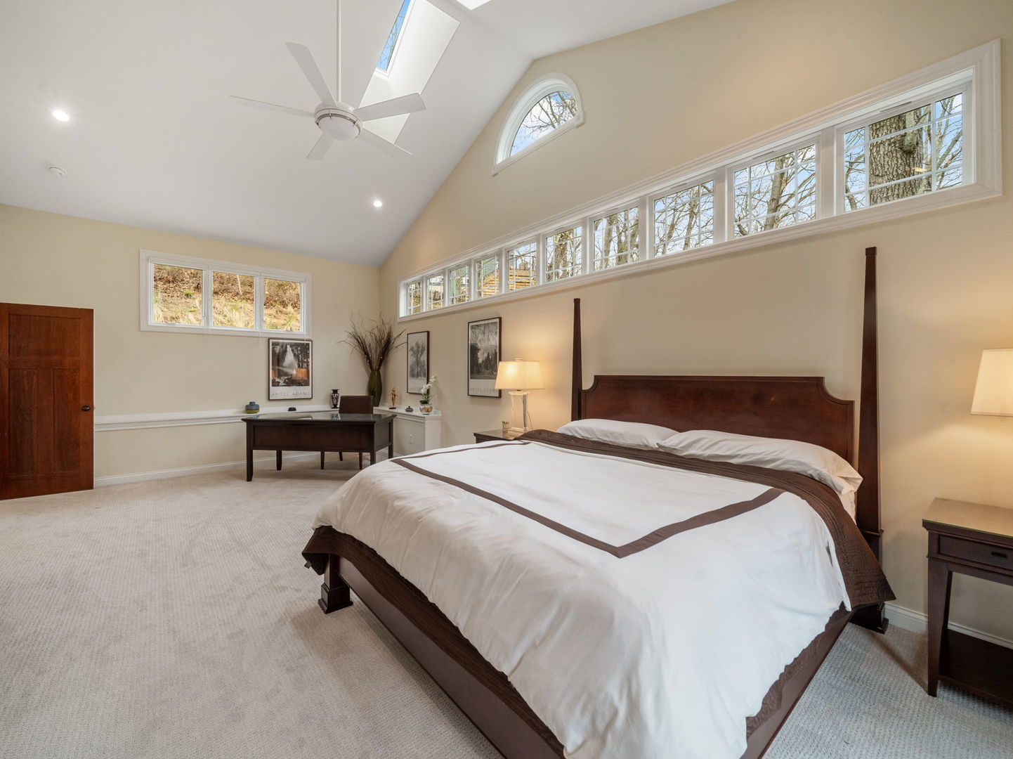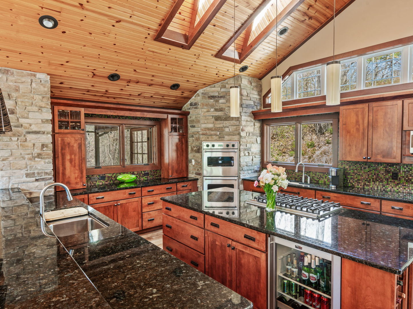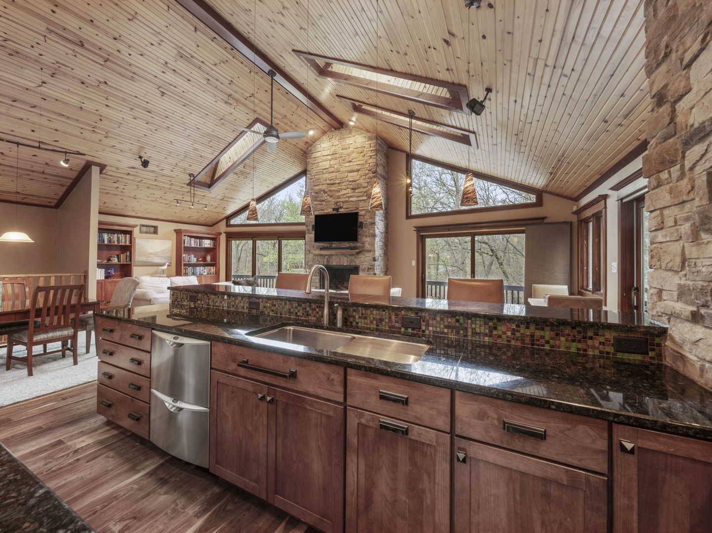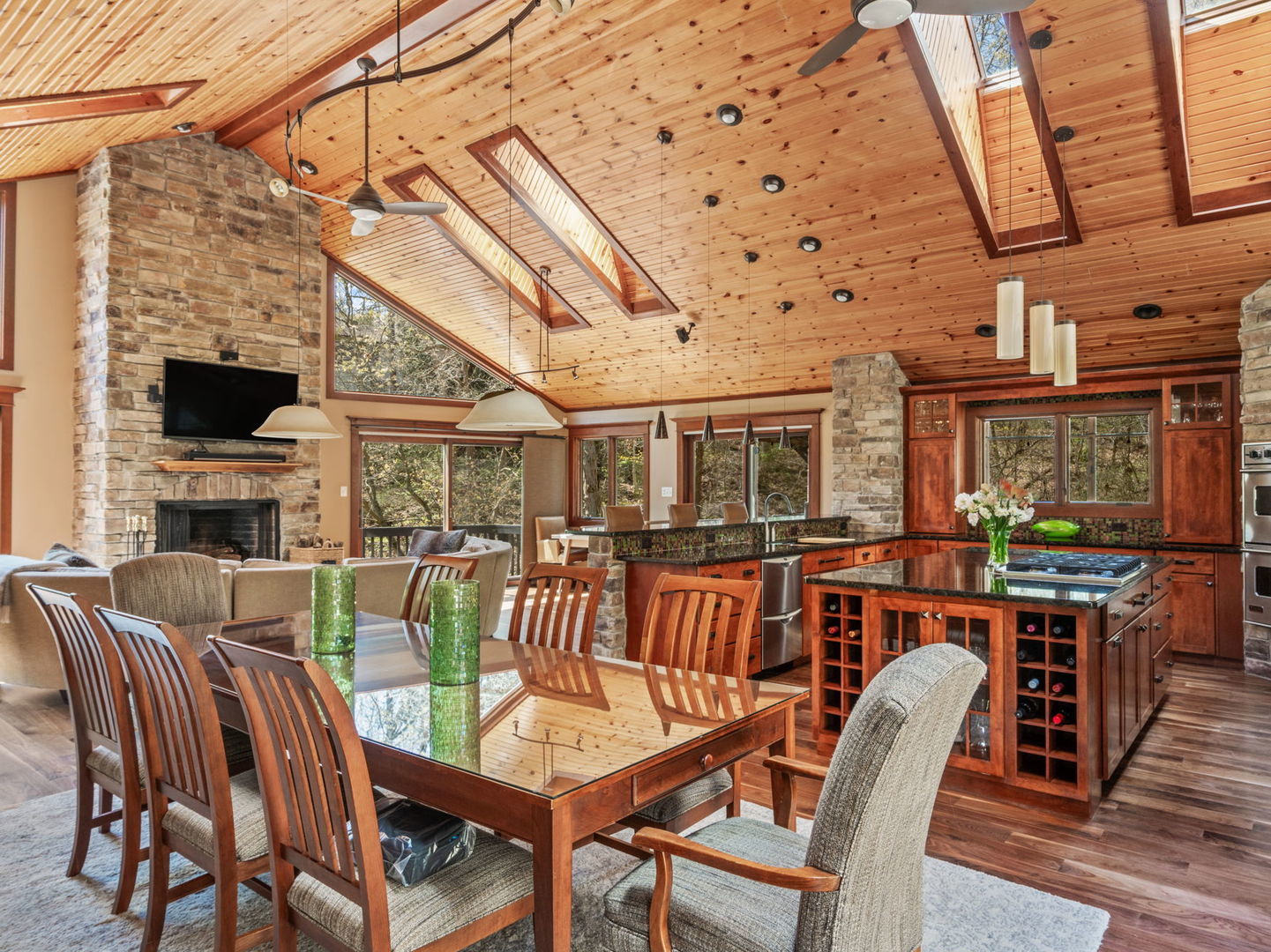 This 4BED/3.5BATH luxury home is set high against a dune, surrounded by native landscaping and undeveloped forest, offering exceptional privacy. Wraparound porches and balconies overlook a lush yard and private ravine. With 3,790 square feet of living space, this retreat features bright, open rooms with twelve-foot ceilings, tall windows, and skylights showcasing beautiful, unobstructed views. A dramatic entry with a custom walnut staircase leads to an expansive dining area accommodating twelve, while the great room opens to a screened porch perched above the scenic dune ravine. A dramatic cathedral height stone fireplace anchors the living, dining, and kitchen areas in a stunning great room with large skylights, a wall of windows, built-in bookshelves, a natural wood ceiling, and gorgeous wide plank premium walnut floors. A private 2nd-Floor Guest Suite with its own bath provides an ideal escape, and two nearby beaches with golf cart and car parking complete the coastal lifestyle!
