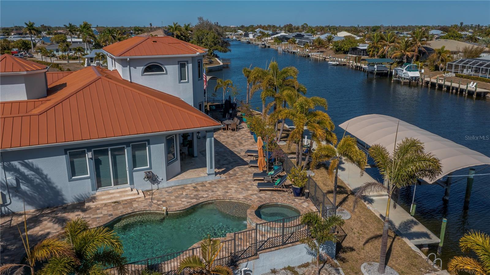 A BOATERS DREAM HOME!! 5 MINUTES TO OPEN WATER, 60 MINUTES TO THE I.C.W. and the GULF OF AMERICA! Despite it location on an excellent canal, THIS HOUSE HAS NO HISTORY OF FLOODING!! Breathtaking water views from your massive screened LANAI with 1961 square feet of saltwater POOL and outdoor space, and featuring a custom outdoor kitchen and entertaining area. The HUGE DOCK sports 2 boat lifts, and 2 floating jet ski ports with water and electricity. Step inside this grand, custom-built residence to be greeted by a large GREAT ROOM with soaring 12 foot ceilings with an abundance of natural light and awesome water views. High-end finishes abound, from the exquisite tile and travertine flooring to the natural stone countertops. The CUSTOM KITCHEN is a chef's delight featuring all-new cabinetry and excellent WOLF appliances. The new 2023 METAL ROOF and the newer impact windows far exceed Florida's hurricane standards. Two newer HVAC systems (2021 and 2022), two tankless water heaters (2020 and 2023) and a 500-gallon underground propane tank ensure maximum comfort and dependability. Other improvements include a heated salt water pool, water softener and reverse osmosis water system, and large boat canopy. The excellent Chrlotte Harbor Yacht Club is across the street with a marina, fuel, a nice restaurant and bar open to the public, and many fun activities for members. A few minutes away by CAR OR BOAT are outstanding restaurants and pubs, the wonderful Fisherman's Village, the incredible Sunseeker Resort, 3 marinas, public golf courses, and numerous festivals and musical activities. If you seek the ultimate in luxury, convenience, and the unparalleled MAGIC of coastal Southwest Florida, you have arrived!!