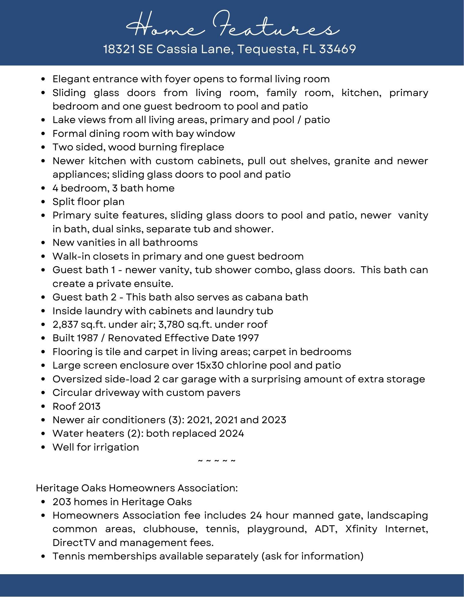 Luxury lakefront pool home in the prestigious gated community of Heritage Oaks. This spacious 4-bedroom, 3-bath residence sits on an .49-acre waterfront lot with wide lake views from the living room, kitchen, primary suite, guest room, and outdoor living areas. Enjoy Florida lifestyle living with a large screened pool, covered lanai, and hot tubperfect for entertaining or relaxing. The split floor plan offers privacy, while the open-concept kitchen flows into a comfortable sitting area featuring a two-sided fireplace. The primary suite includes sliding glass doors leading to the pool and patio. Updated bathrooms, oversized 2-car garage, and circular paver driveway add convenience and curb appeal. Ideal Florida luxury home, waterfront property, and private retreat. Tennis membership available 800/year.