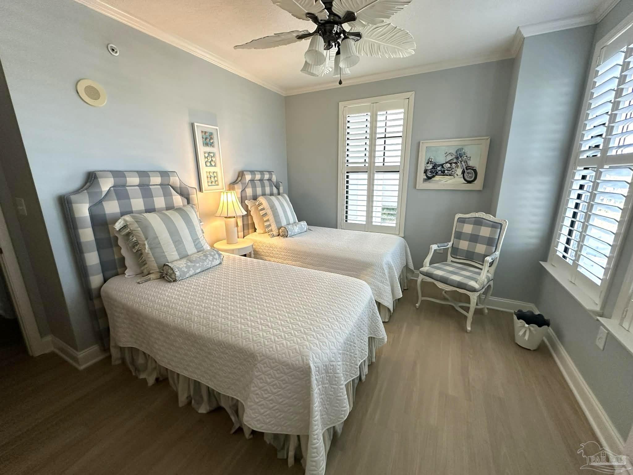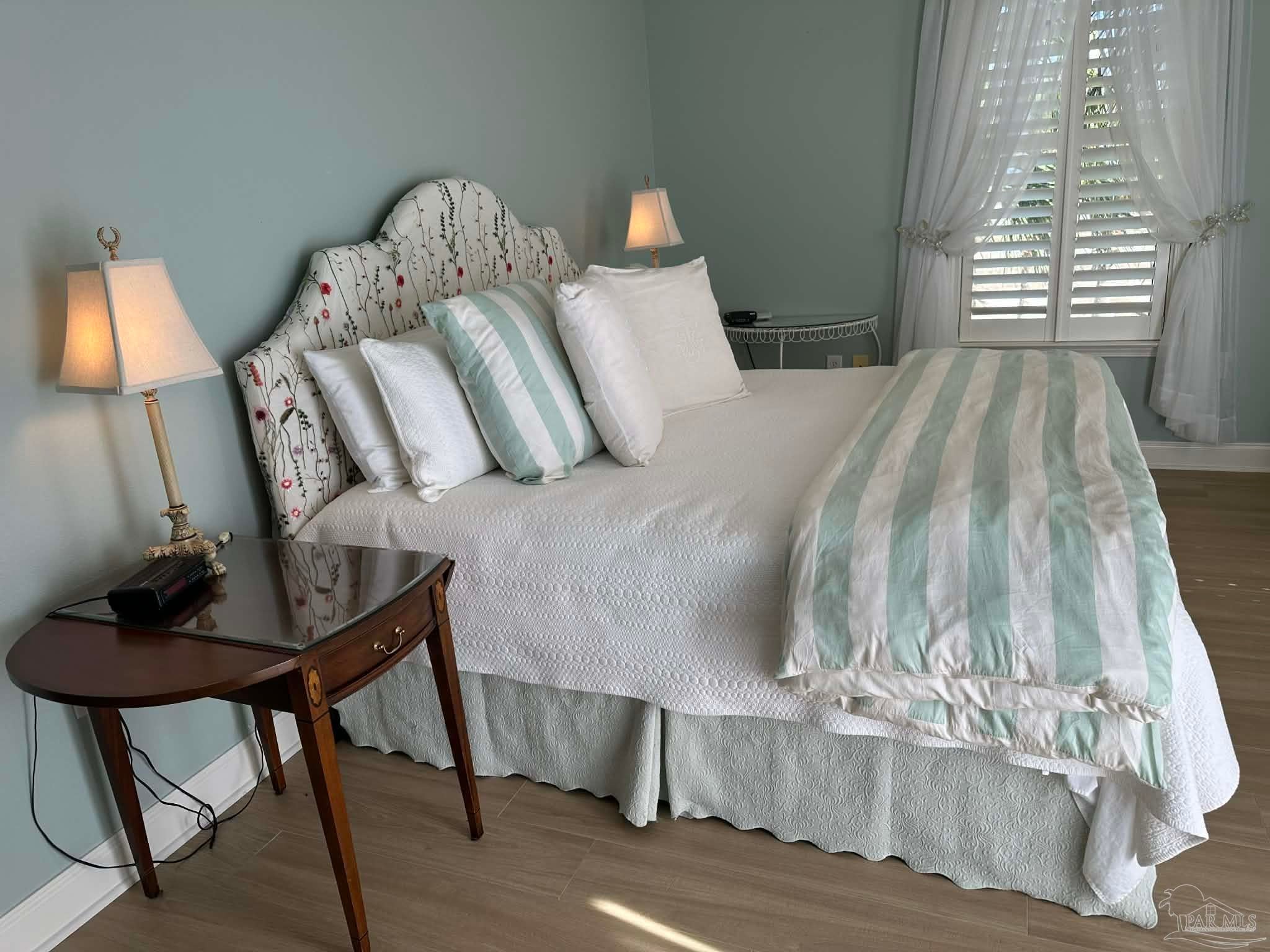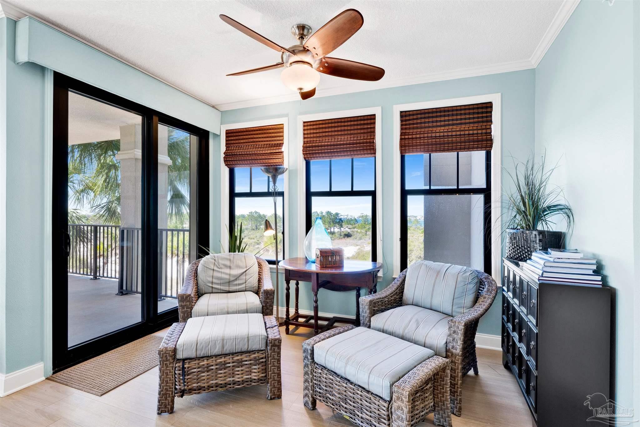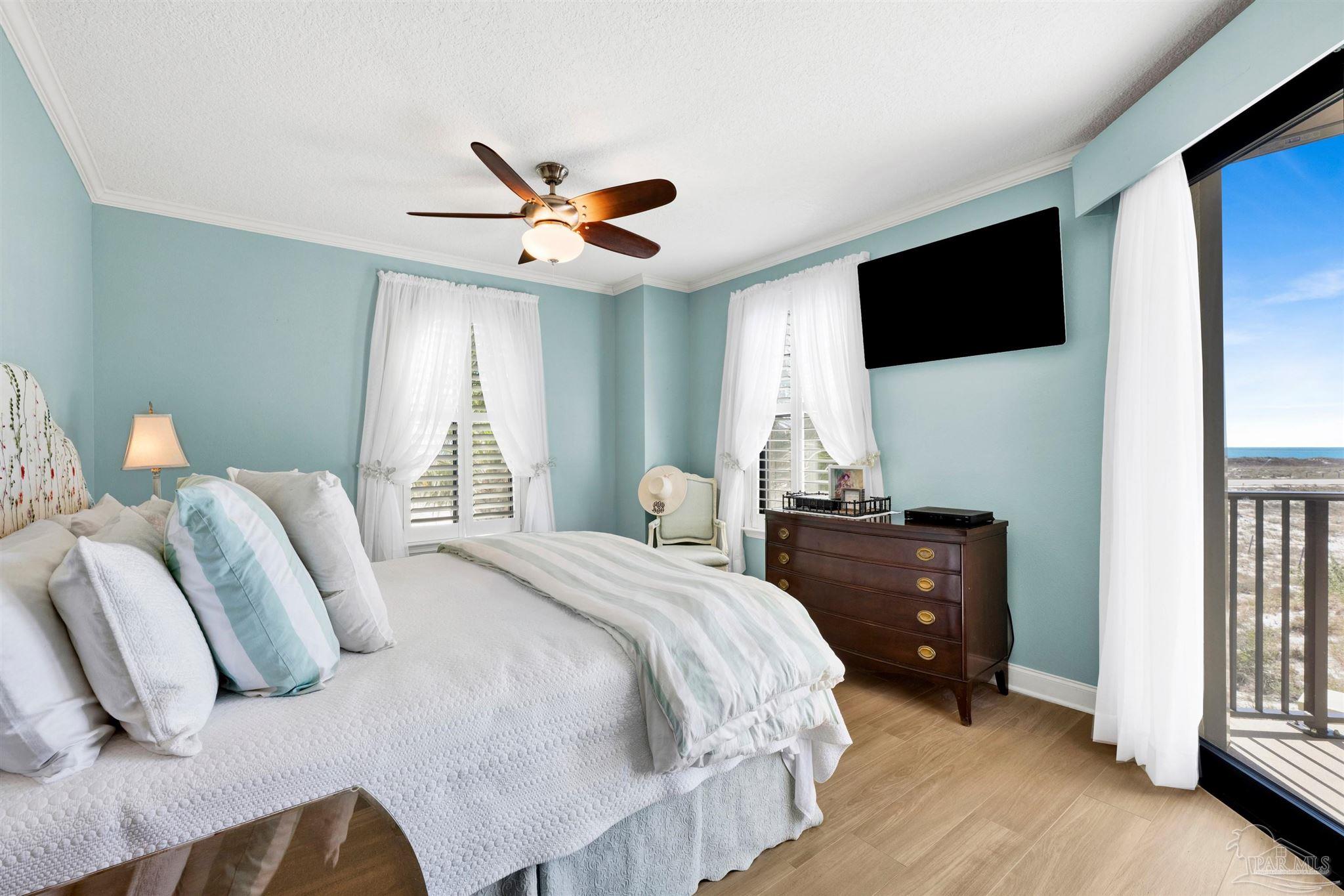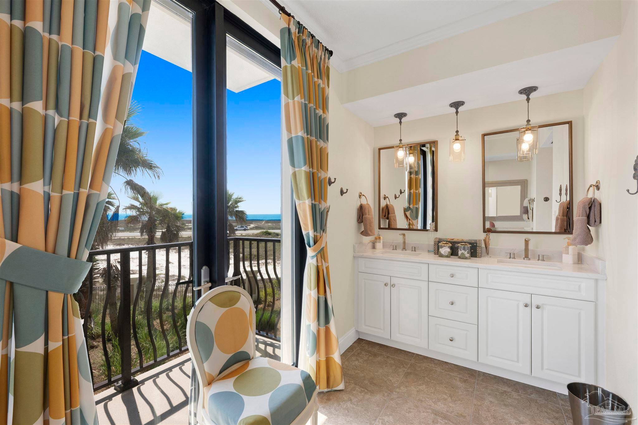 LOWEST PRICED 4 BEDROOM 4.5 BATH TOP FLOOR EAST CORNER CONDO IN PERDIDO KEY FL! Discover one of the Florida Gulf Coasts most elegant luxury Gulf-front communities in Mediterranean at Perdido Key FL! All residences in Mediterranean are 4 bedroom, 4.5 bath units with secure owner elevator access for the utmost in privacy. Mediterranean #1101W is a stunning east corner unit with 3,383 sq. ft. of living area. A jaw-dropping 1,400 sq. ft. wraparound balcony, newly refinished in 2023, spans the full length of this fully-furnished home and provides balcony access from all bedrooms. The living room invites comfort and ease with reclining leather sofas, and the kitchen is a chefs dream with a paneled refrigerator and Meile Appliances. Thoughtful touches like a built-in desk and abundant cabinets make this space even more functional. The Gulf-front primary bedroom has a king bed, and with its wall of windows, the room offers an inspiring vista to wake up to every day! The primary bathroom ensuite features a jacuzzi tub, walk-in closet, double vanity, and tile and glass shower. Each guest room has an adjoining bathroom with stone countertops and tile shower/baths. Other interior highlights include travertine floors in the living area, floor-to-ceiling windows/doors, recessed lighting, crown molding, and a bar area with ice maker and wine cooler. The condo conveys with an owners storage enclosure, a beach-side locker, and a deeded, covered parking spot directly across from the entrance. Mediterranean just completed a renovation project-new roof, railings, coatings, glass, exterior sealing, and more! Mediterraneans top-notch amenities include a heated indoor/outdoor pool, fitness center, sauna, owners lounge, kitchen, and meeting room with wireless internet. And dont forget that Mediterranean is just steps from the world-famous Flora-Bama where, from your balcony, you can enjoy a premium seat for skydiving Santa and fireworks on New Years Eve! Buyer to verify