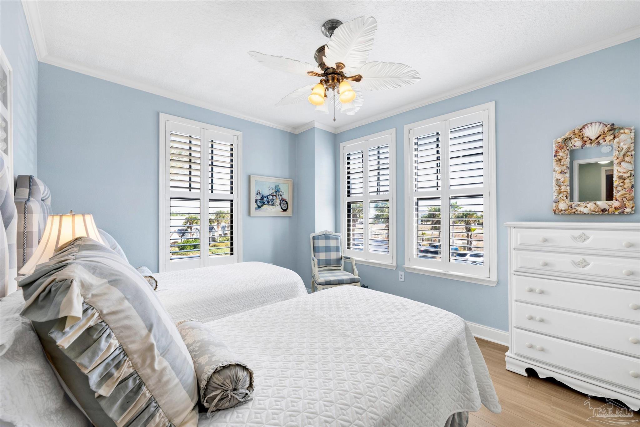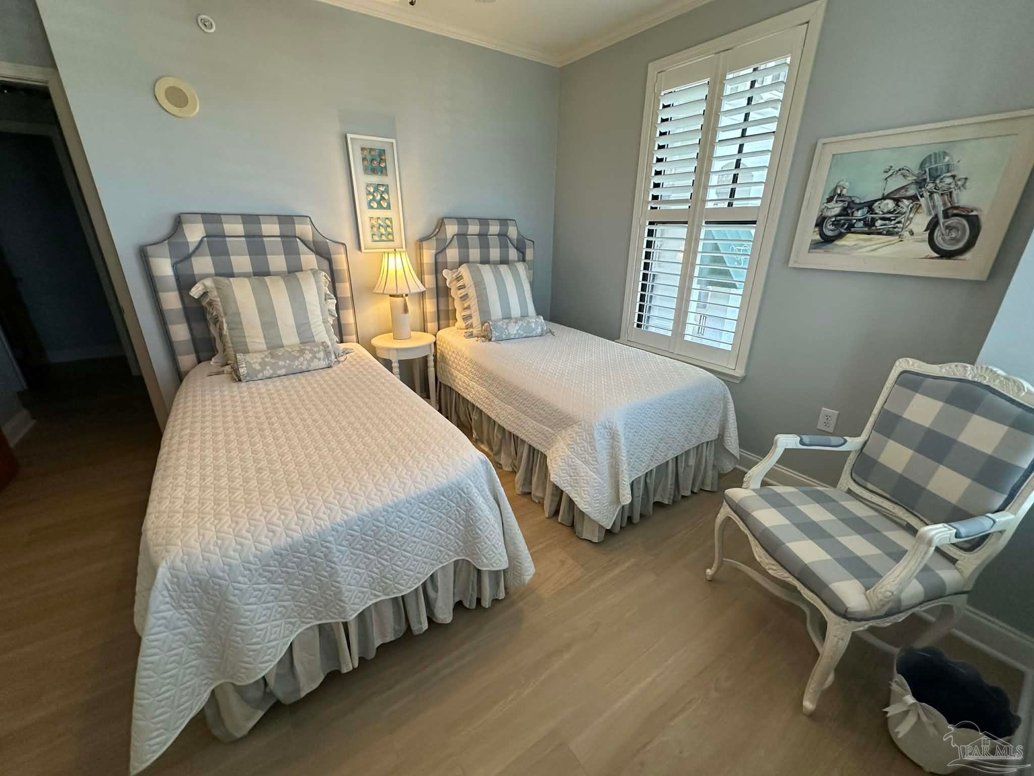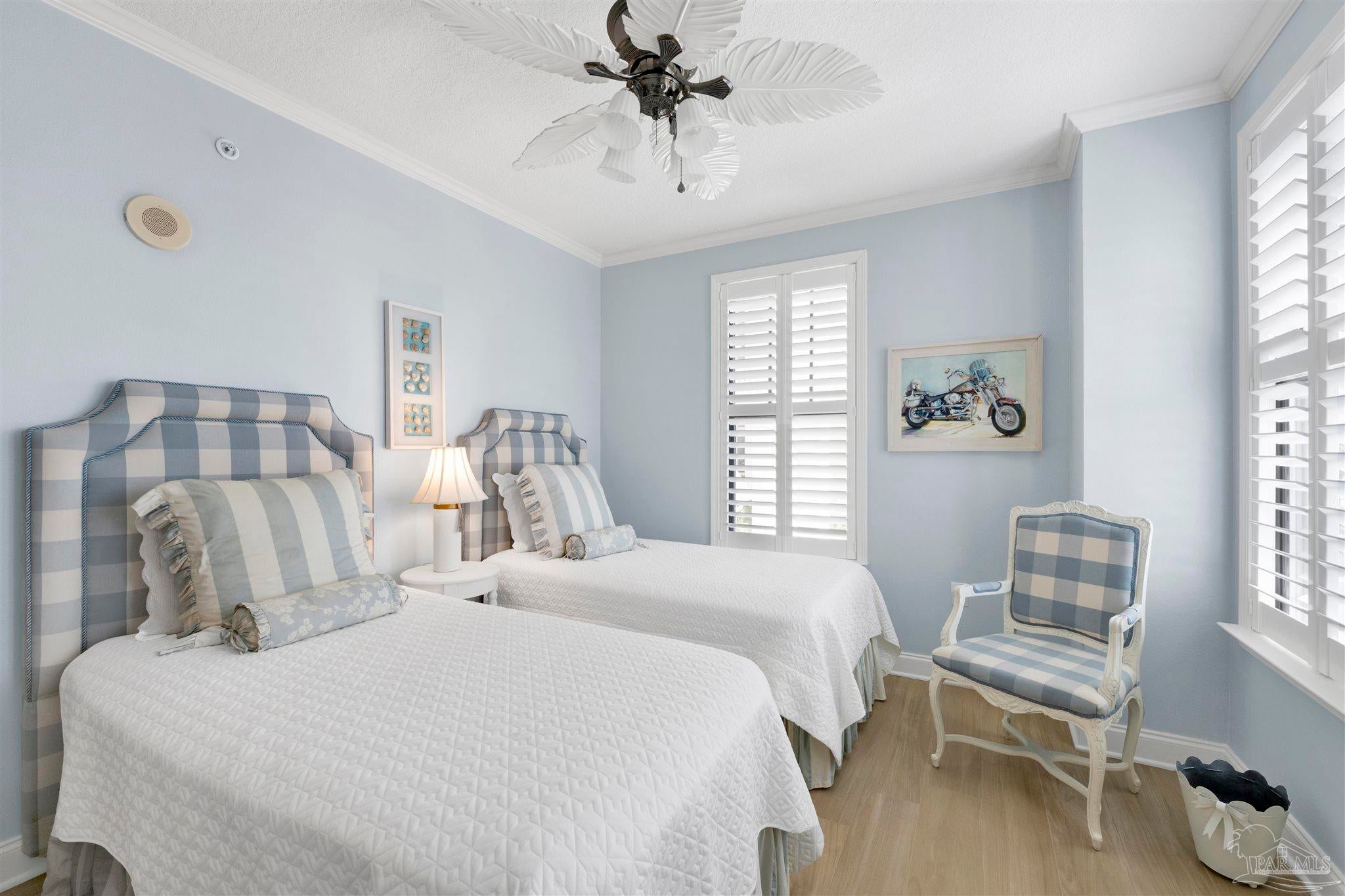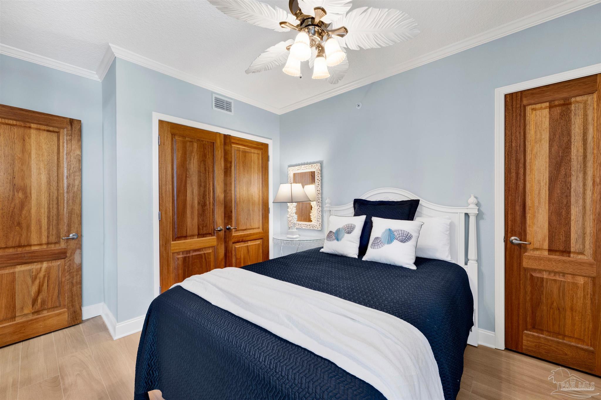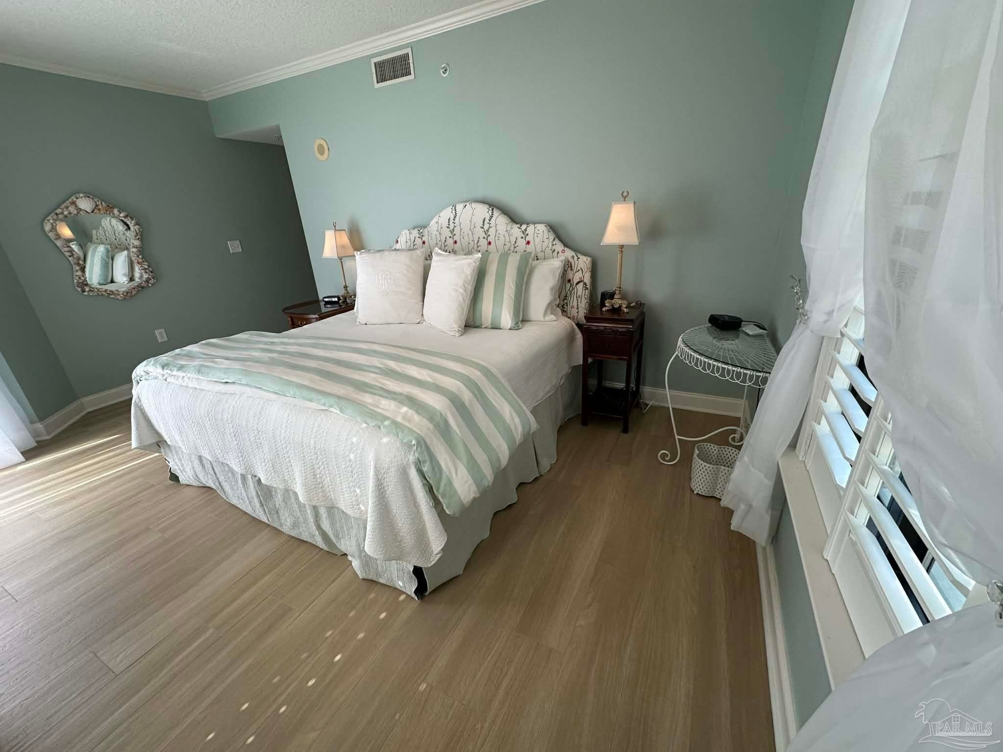 LOWEST PRICED 4 BEDROOM 4.5 BATH TOP FLOOR EAST CORNER CONDO IN PERDIDO KEY FL! Discover one of the Florida Gulf Coasts most elegant luxury Gulf-front communities in Mediterranean at Perdido Key FL! All residences in Mediterranean are 4 bedroom, 4.5 bath units with secure owner elevator access for the utmost in privacy. Mediterranean #1101W is a stunning east corner unit with 3,383 sq. ft. of living area. A jaw-dropping 1,400 sq. ft. wraparound balcony, newly refinished in 2023, spans the full length of this fully-furnished home and provides balcony access from all bedrooms. The living room invites comfort and ease with reclining leather sofas, and the kitchen is a chefs dream with a paneled refrigerator and Meile Appliances. Thoughtful touches like a built-in desk and abundant cabinets make this space even more functional. The Gulf-front primary bedroom has a king bed, and with its wall of windows, the room offers an inspiring vista to wake up to every day! The primary bathroom ensuite features a jacuzzi tub, walk-in closet, double vanity, and tile and glass shower. Each guest room has an adjoining bathroom with stone countertops and tile shower/baths. Other interior highlights include travertine floors in the living area, floor-to-ceiling windows/doors, recessed lighting, crown molding, and a bar area with ice maker and wine cooler. The condo conveys with an owners storage enclosure, a beach-side locker, and a deeded, covered parking spot directly across from the entrance. Mediterranean just completed a renovation project-new roof, railings, coatings, glass, exterior sealing, and more! Mediterraneans top-notch amenities include a heated indoor/outdoor pool, fitness center, sauna, owners lounge, kitchen, and meeting room with wireless internet. And dont forget that Mediterranean is just steps from the world-famous Flora-Bama where, from your balcony, you can enjoy a premium seat for skydiving Santa and fireworks on New Years Eve! Buyer to verify