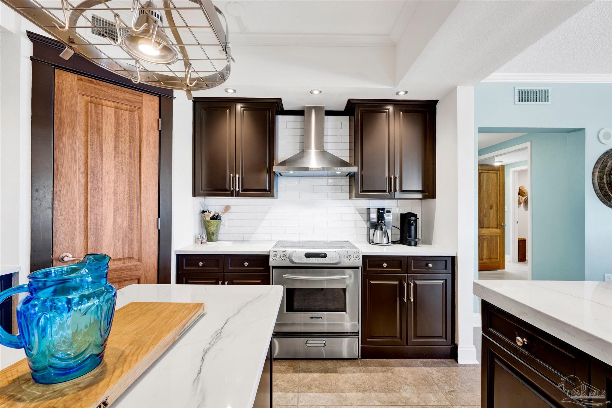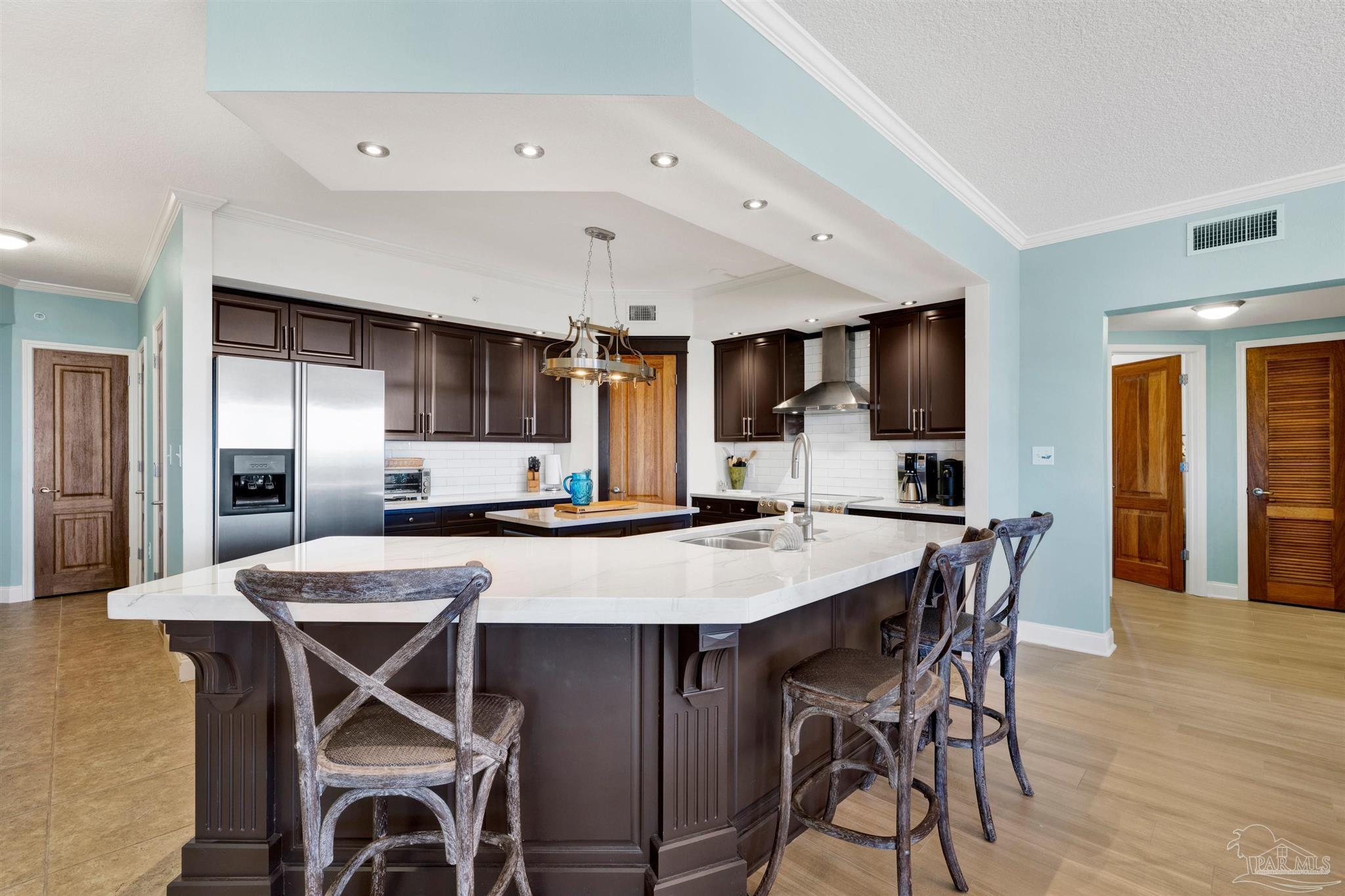 Welcome to Eleanor Beach, an extraordinary beachfront luxury residence in the heart of Perdido Key. This like-new custom home (built circa 2023) offers 5,046 sqft heated & cooled and showcases hurricane-resilient, elevated construction designed for both elegance and durability. Designed by renowned Bob Chatham Custom Home Design with interiors by Melanie Martin Interiors, the home blends refined coastal living with architectural distinction, including a Dutch West Indiesstyle parapet roof reminiscent of Rosemary Beach. Built on precast concrete pilings, the elevated main living level and pool deck provide superior storm protection, while an ICF concrete North wall enhances structural strength, energy efficiency, and sound insulation. An elevator offers access between all 3 levels. Enjoy 12 ceilings on the main floor and 11 ceilings on the third floor, creating an expansive, light-filled atmosphere. The kitchen features a Wolf 6-burner gas range with pot filler, two dishwashers, a full-size refrigerator and separate full-size freezer, a wet bar with wine cooler, and a massive walk-in butlers pantry. Double floor-to-ceiling sliding glass doors open to the pool deck, delivering exceptional indoor-outdoor living. A striking 42 gas fireplace carries through from the living room into the Gulf-front primary bedroom. The home offers two primary suitesone Gulf-front on the third floor with a private balcony and wet bar with wine cooler, and one on the main floor featuring dramatic 9 windows. Total accommodations include 5 bedrooms with en-suite baths, a bunk room, a half bath, and a heated/cooled ground-level bonus area ideal for a game room or media space, and 4 car garage. Designer touches include wallpapered bedroom ceilings and Lutron smart blinds throughout. Sold fully furnished w/upscale coastal dcor, Eleanor Beach is perfect as a primary residence or high-end investment property. Buyer to verify all information during due diligence.