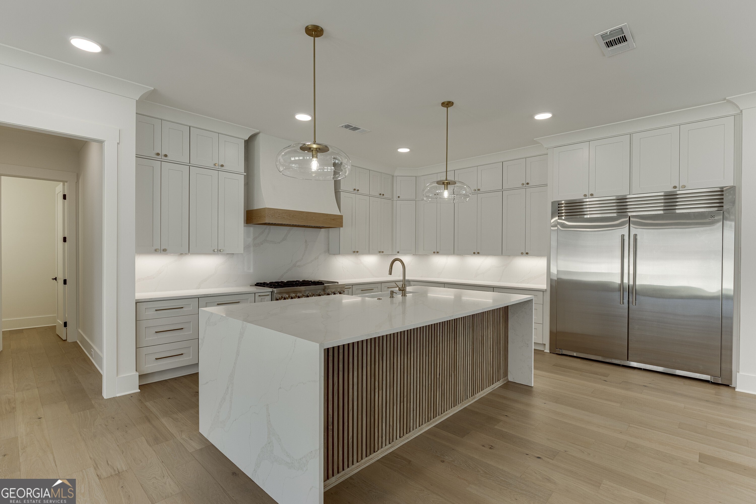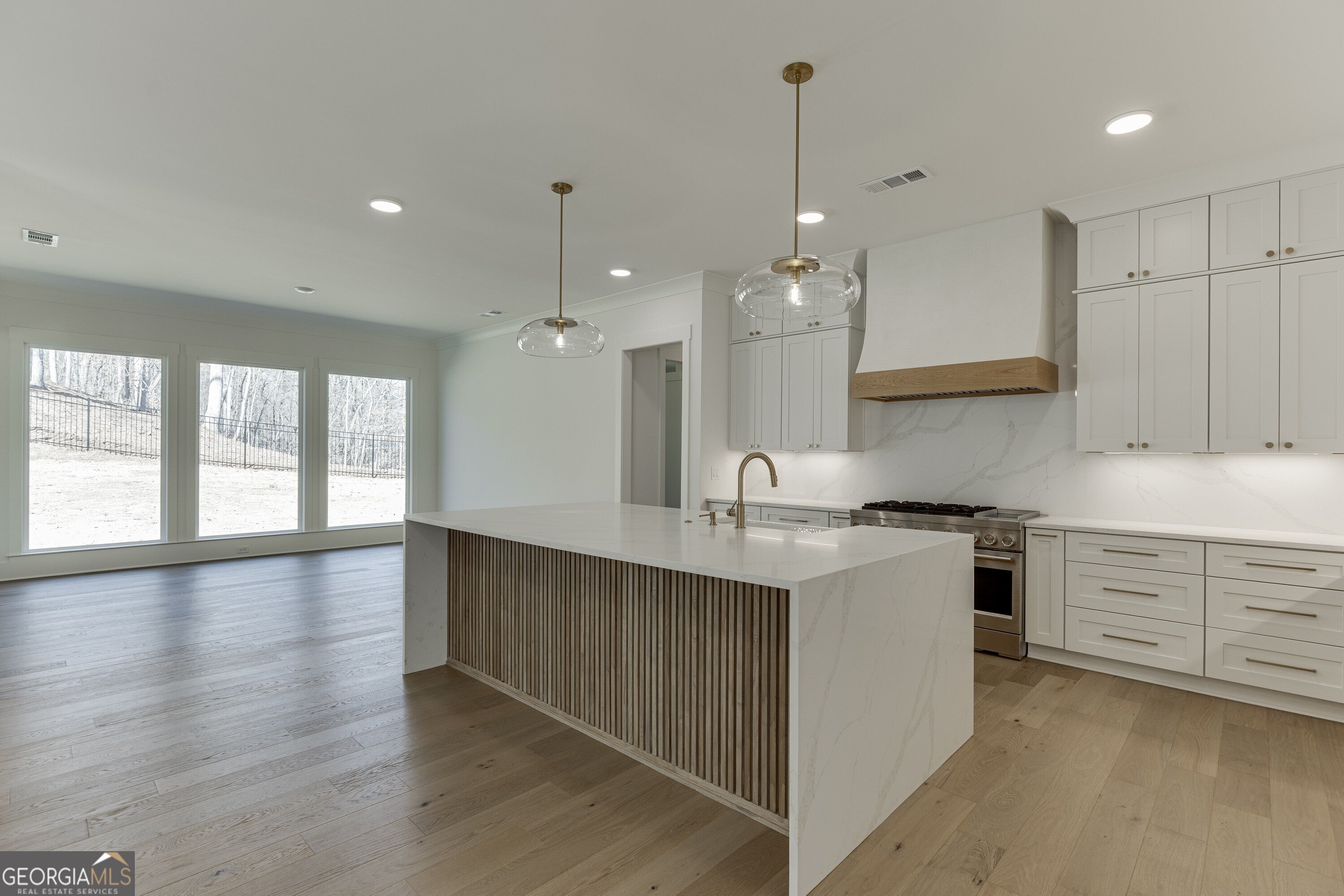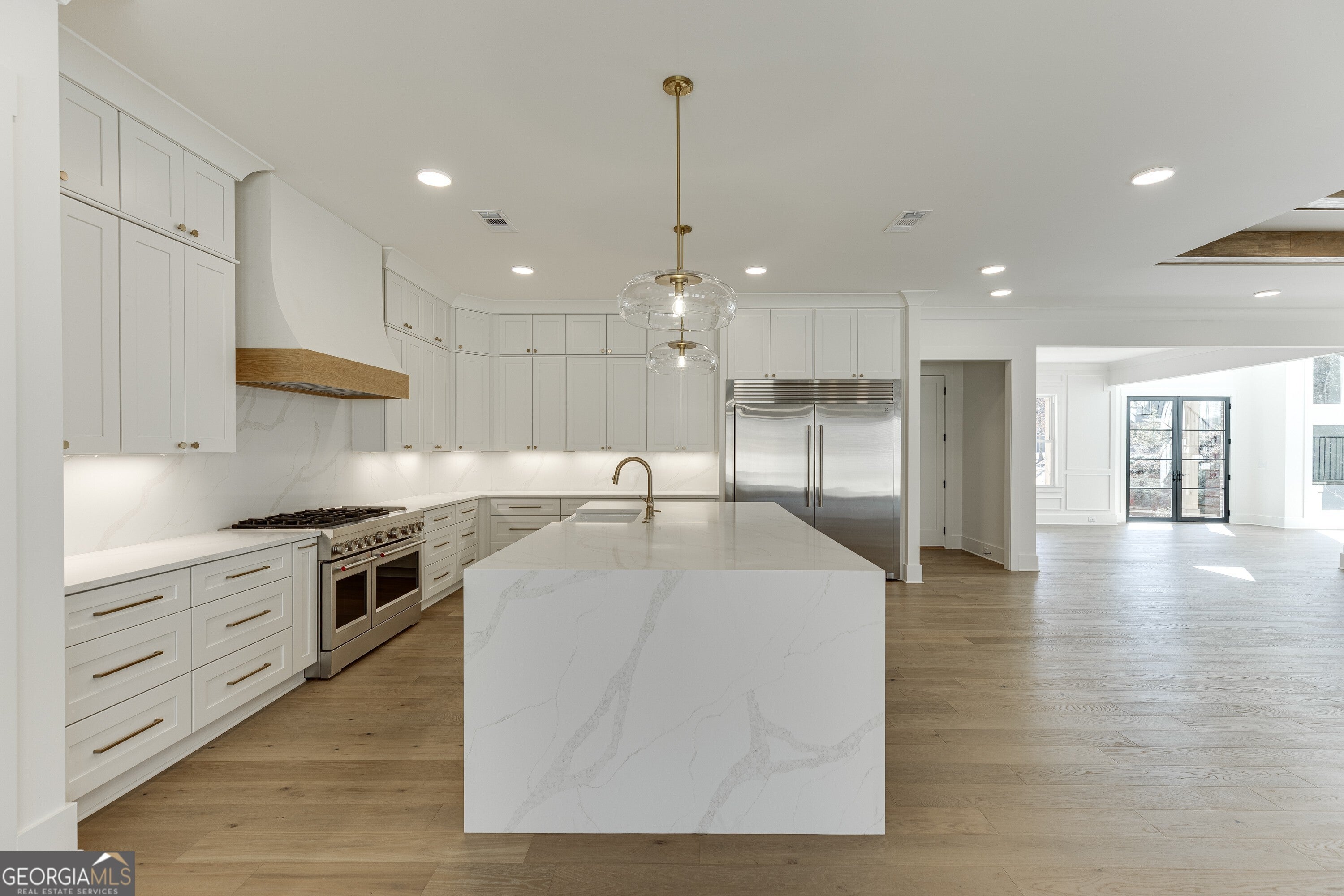 New Construction in the City of Buford! This custom-built home has an open concept floor plan that features a large kitchen with tons of cabinetry to the ceiling, an extended island with waterfall, quartz counter-tops, stainless-steel appliances, including a 48 slide-in oven/griddle, and a double 32 refrigerator and freezer units and a spacious keeping/dining area with floor-to-ceiling windows.