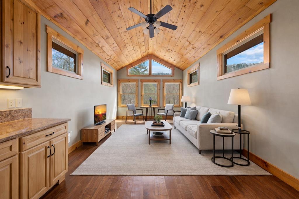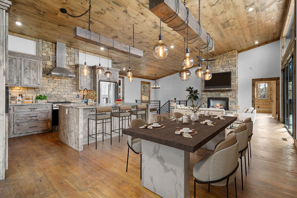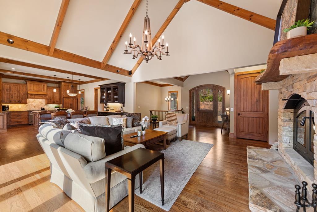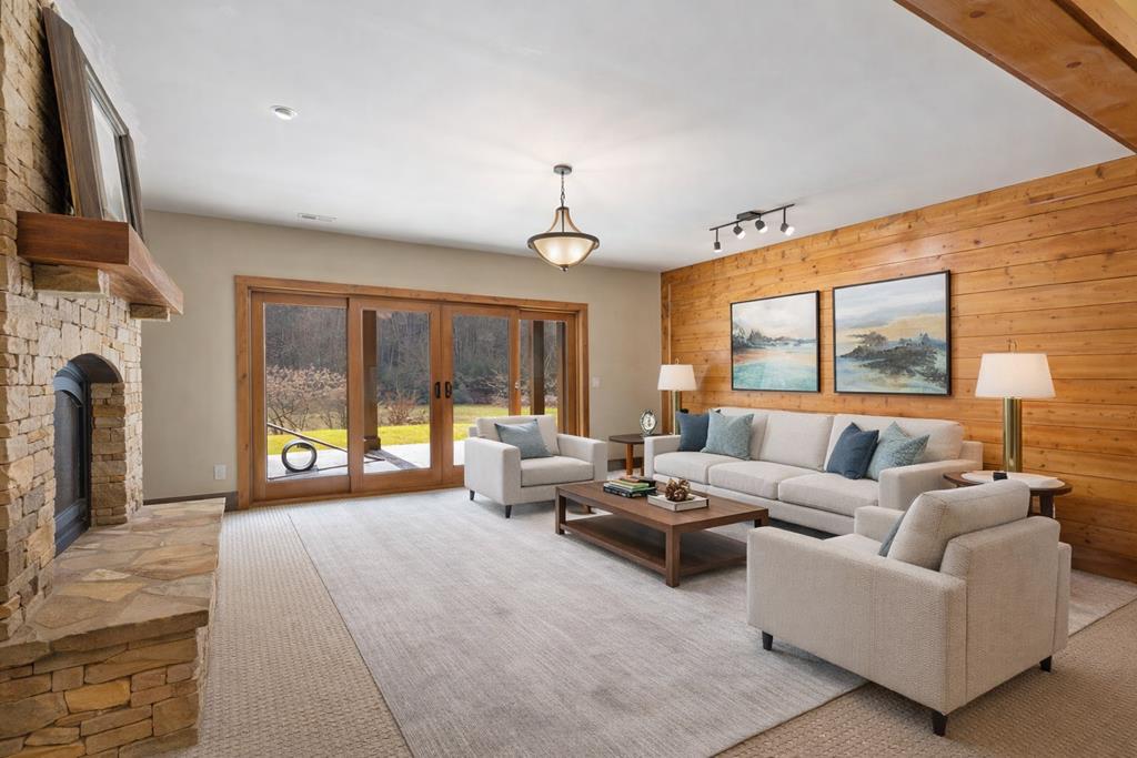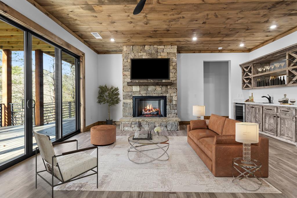 Sunset Ridge - Elevated Mountain Living in Mineral Bluff Set high on Roundtop Road with over four acres, Sunset Ridge offers sweeping views of the Blue Ridge Mountains and more than 4,200 square feet of finely crafted living space. The main level features a dramatic great room with floor-to-ceiling windows, vaulted ceilings, and a statement stone fireplace, flowing into a gourmet kitchen with dual islands, custom cabinetry, and high-end finishes. Four generously sized bedroom suites ensure comfort for family and guests, with two upstairs connected by a unique skywalk and private loft. The terrace level is designed for memorable gatherings-complete with a theater lounge, game area, wet bar, and fireplace-opening to expansive outdoor living spaces. Multiple decks, a fire table, and a hot tub provide opportunities to take in the sunrise, watch the sunset, or stargaze in the cool mountain air. Located just minutes from downtown Blue Ridge, Sunset Ridge blends refined design, exceptional entertaining spaces, and stunning natural surroundings in one unforgettable property.