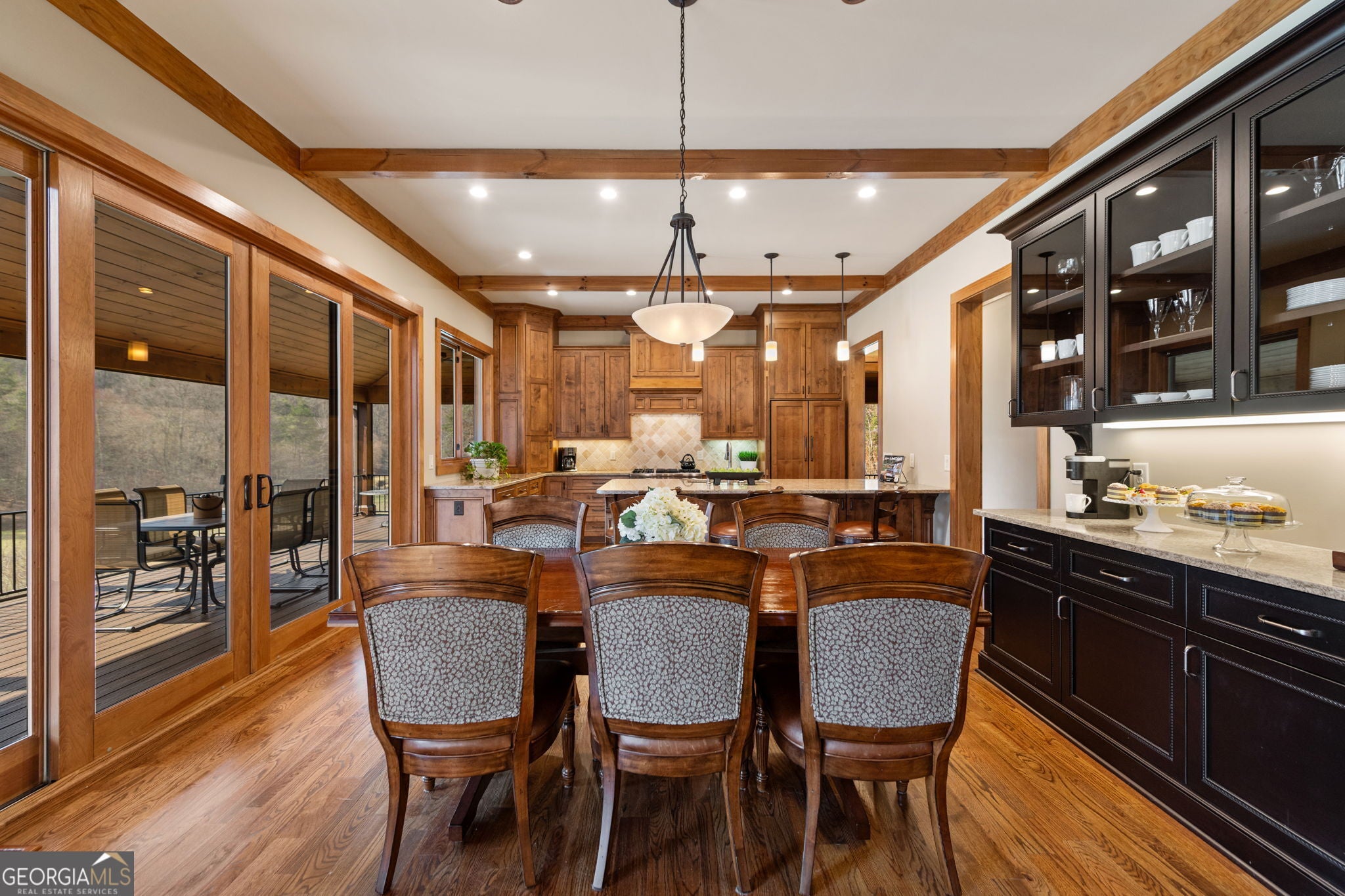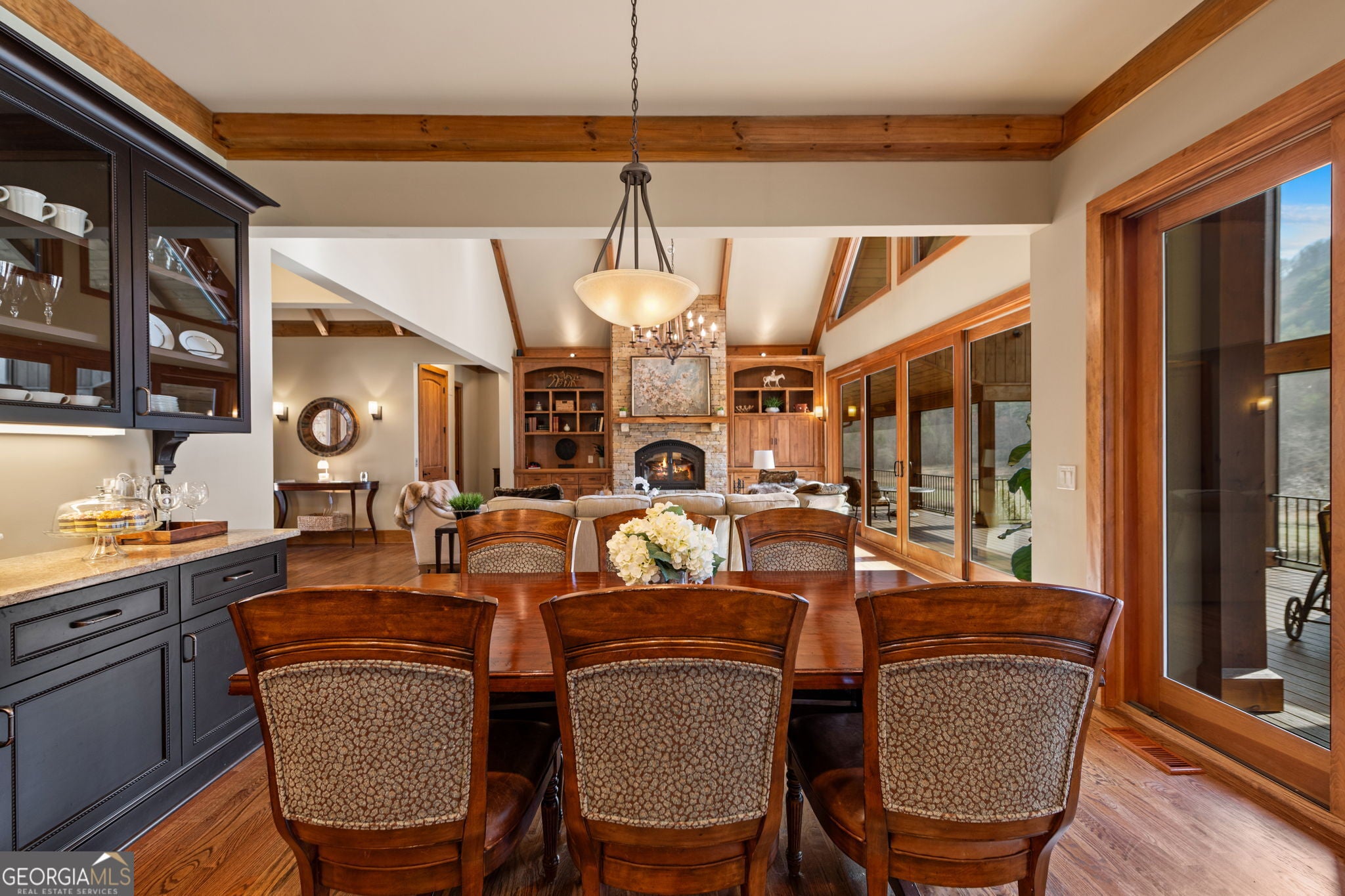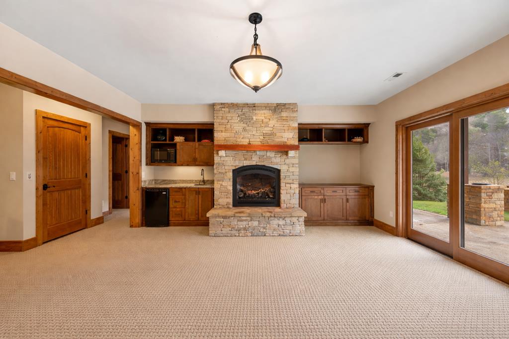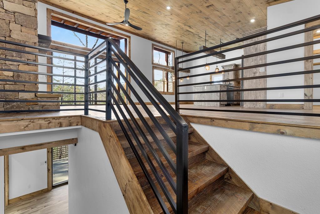 Sunset Ridge - Elevated Mountain Living in Mineral Bluff Set high on Roundtop Road with over four acres, Sunset Ridge offers sweeping views of the Blue Ridge Mountains and more than 4,200 square feet of finely crafted living space. The main level features a dramatic great room with floor-to-ceiling windows, vaulted ceilings, and a statement stone fireplace, flowing into a gourmet kitchen with dual islands, custom cabinetry, and high-end finishes. Four generously sized bedroom suites ensure comfort for family and guests, with two upstairs connected by a unique skywalk and private loft. The terrace level is designed for memorable gatherings-complete with a theater lounge, game area, wet bar, and fireplace-opening to expansive outdoor living spaces. Multiple decks, a fire table, and a hot tub provide opportunities to take in the sunrise, watch the sunset, or stargaze in the cool mountain air. Located just minutes from downtown Blue Ridge, Sunset Ridge blends refined design, exceptional entertaining spaces, and stunning natural surroundings in one unforgettable property.