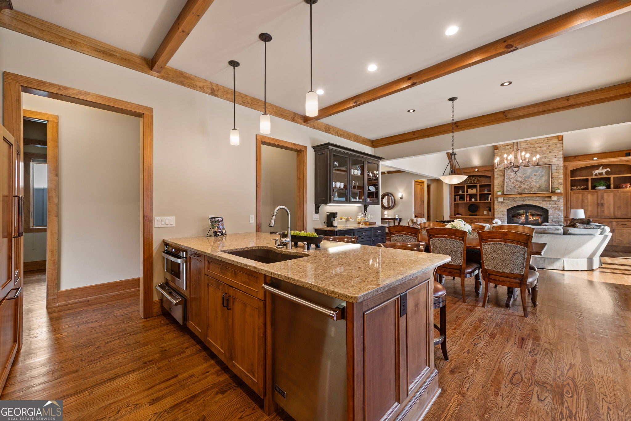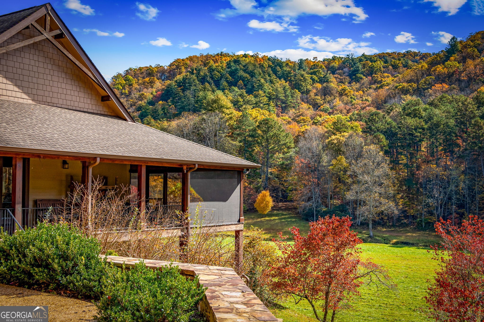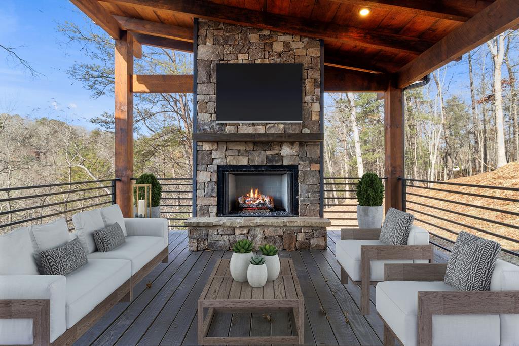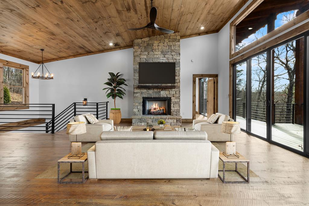 One of the MOST COMMANDING Long-Range, Multi-Layered Mountain Vistas ever available in Blue Ridge. Complete & Move-in Ready. Panorama Vista Stretches effortlessly across NC, GA & TN delivering a truly Rare & Dramatic Backdrop. Superior Quality NEW Construction in the Prestigious, Gated & Paved Mountain High Community. This Rustic Luxury Ranch offers a Concrete Driveway & Ample Parking. FOUR Bedroom Interior thoughtfully designed for Elegant ONE LEVEL Living complemented by a Fully Finished Terrace level ideal for Guests. The Main Living area showcases an OPEN DESIGN w/Great Room & Dining Room anchored by a Striking TWO SIDED Stone Fireplace. Gable Fixed Glass Windows & Glass Door Panels flood the interior with Natural Light from Gables on Both Sides. A Dramatic Wall of Glass opens seamlessly to the oversized OPEN GABLE COVERED Entertaining Porch complete with an EXTERIOR STONE FIREPLACE-an ideal setting for sophisticated gatherings or quiet evenings overlooking these BREATHTAKING WIDE Mountain Views. The Custom Kitchen is both Functional & Beautiful featuring Granite countertops, an expansive counter-height Bar, Custom Cabinetry & Premium finishes throughout. The Owners Master Suite is a private retreat with Direct Porch Access, a spacious walk-in closet, double vanity & an Oversized Full Tiled Shower & Tub. A Well-Appointed laundry room w/Granite Counters & utility sink along with a Stylish Guest Powder Room completes the Main Level. A Finished terrace level offers a Wet Bar, Generous Family Bonus Room with 3rd STONE Fireplace, Three Guest Bedrooms & TWO full Baths (Full Tile Shower) including a Second Suite ideal for Guests or Multi-Generational living. Architectural details include Rich Wood textures, Wainscoting, Accent Walls, Contrasting Stain Selections, Wrought Iron Pickets & Contemporary Lighting. Zoned HVAC ensures year-round comfort. An Exterior Staircase connects the Wrap-around Main Level Porch to the Terrace Level Porch. Professional Landscaping