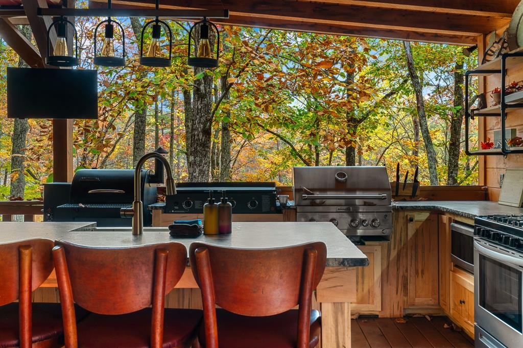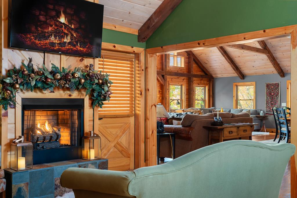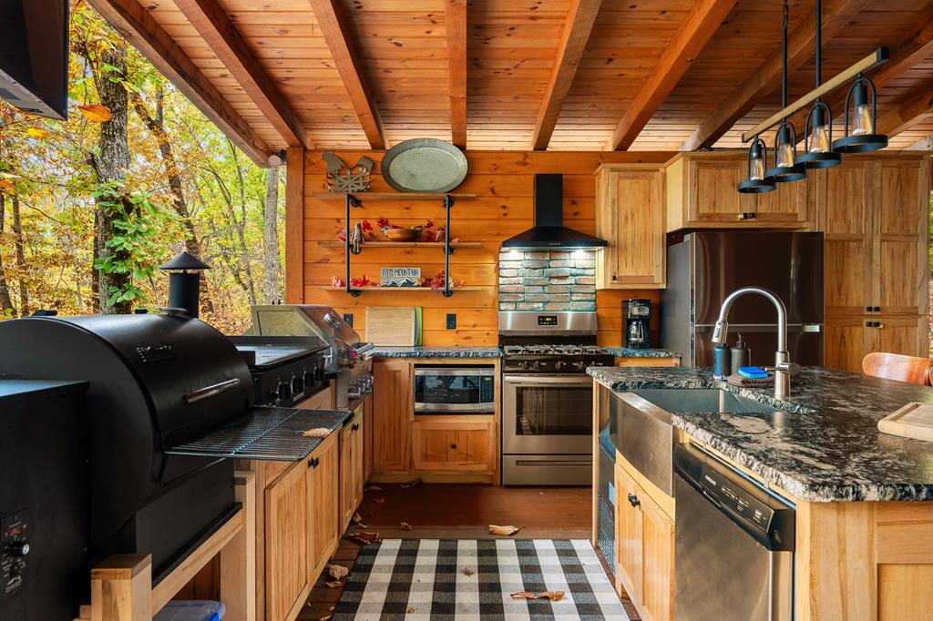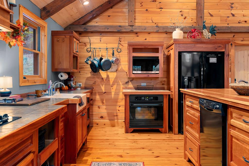 Experience modern mountain living in this like-new 2023 cabin set on 1.46 private acres in Harbin Woods. This beautifully designed 3 bedroom, 2 bathroom home offers vaulted ceilings, hardwood floors, and a modern kitchen with solid-surface counters and a large island. The living area flows seamlessly to the outdoor stone fireplace, creating a cozy year-round gathering space.