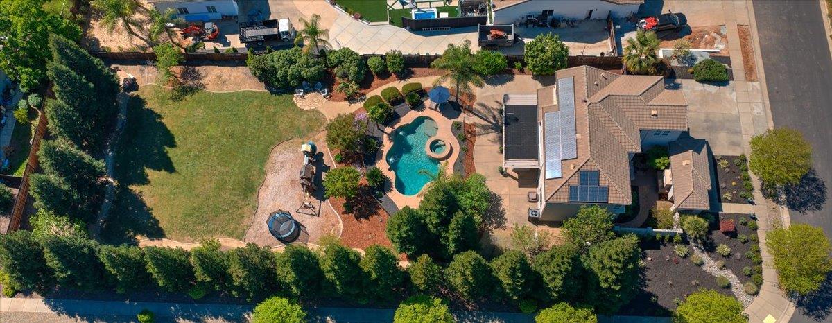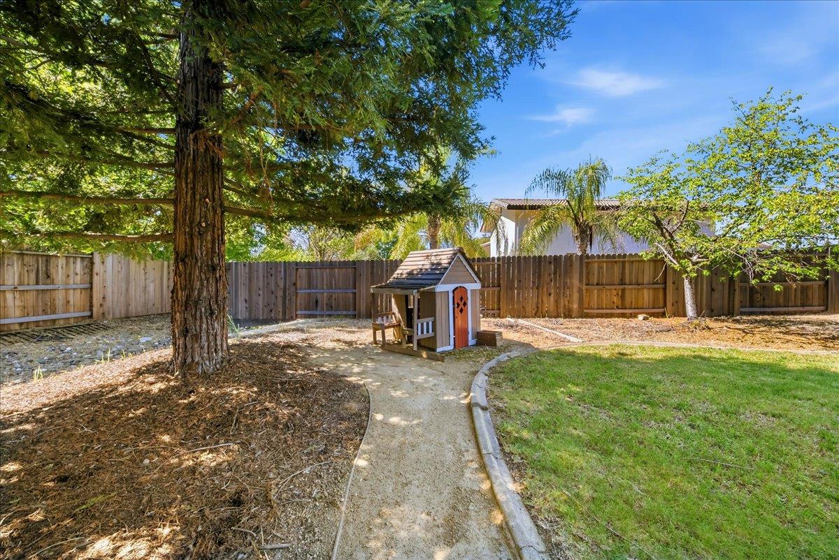 Dreamy & beautiful resort-style living! Walk into the newly renovated private courtyard perfect for entertaining. This home is situated on a spacious .68 of an acre corner lot surrounded with redwoods, that provide privacy. Home has 5 large bedrooms with 2.5 bathrooms. Plantation shutters through-out. Whole-house fan. Thoughtfully designed kitchen with granite counter tops, stainless steel appliances, new HVAC and water heater, new water softener, new pool pump, and Tesla charging mount. Owned solar on home. Backyard features a gated, salt-water pool and spa with sheer waterfalls, covered patio, expansive grassy area, relaxation area with (plumbed) fire-Pit, play-structure, fruit trees, shed for storage, side yard room for RV/Boat/recreational parking. Home faces north and is across from the Dry Creek walking/biking trails and park close by. Renovation of the entire front yard, courtyard area & walking paths & backyard. New install on sprinklers & irrigation piping. See attached detail upgrade list in MLS.