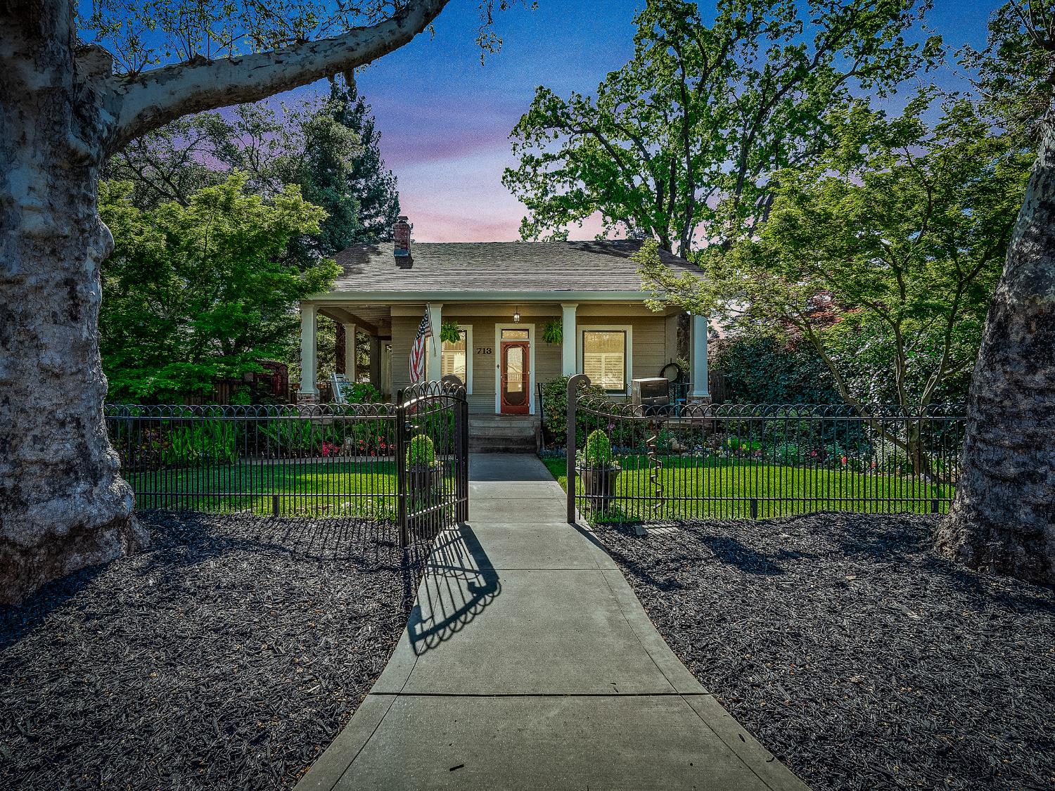 Discover the magic of this 1905 craftsman-style estate with separate guest apartment in historic Folsom, just blocks from where the American River meets Lake Natoma. Combining vintage charm with modern updates, the home features bright, open-concept living and dining, and a well-appointed kitchen with abundant cabinetry and ample counter space. The primary bedroom suite provides a large walk-in closet and mini-split system. Dramatically high boxed ceilings. Vintage hardwood floors and built-in storage cupboards above closets. Designer wallpaper. Indo Window inserts added to the original leaded glass add comfort and character. Whole house fan and tankless water heater add efficiency. Lovely, enclosed courtyard. Detached two-car garage/workshop plus carport is accessed from alley behind property. Separate 700 sq. ft. ADU, located over the garage, provides flexible living space; light-filled, airy, including built-in cabinetry and laundry, making it ideal for guests, caretaker or rental income. Just a block from Historic Folsoms shops, restaurants, farmers market, parades, and events, and with access to over 100 miles of bike trails, this home offers the perfect blend of charm, convenience, and lifestyle in one of Californias most family-friendly communities.