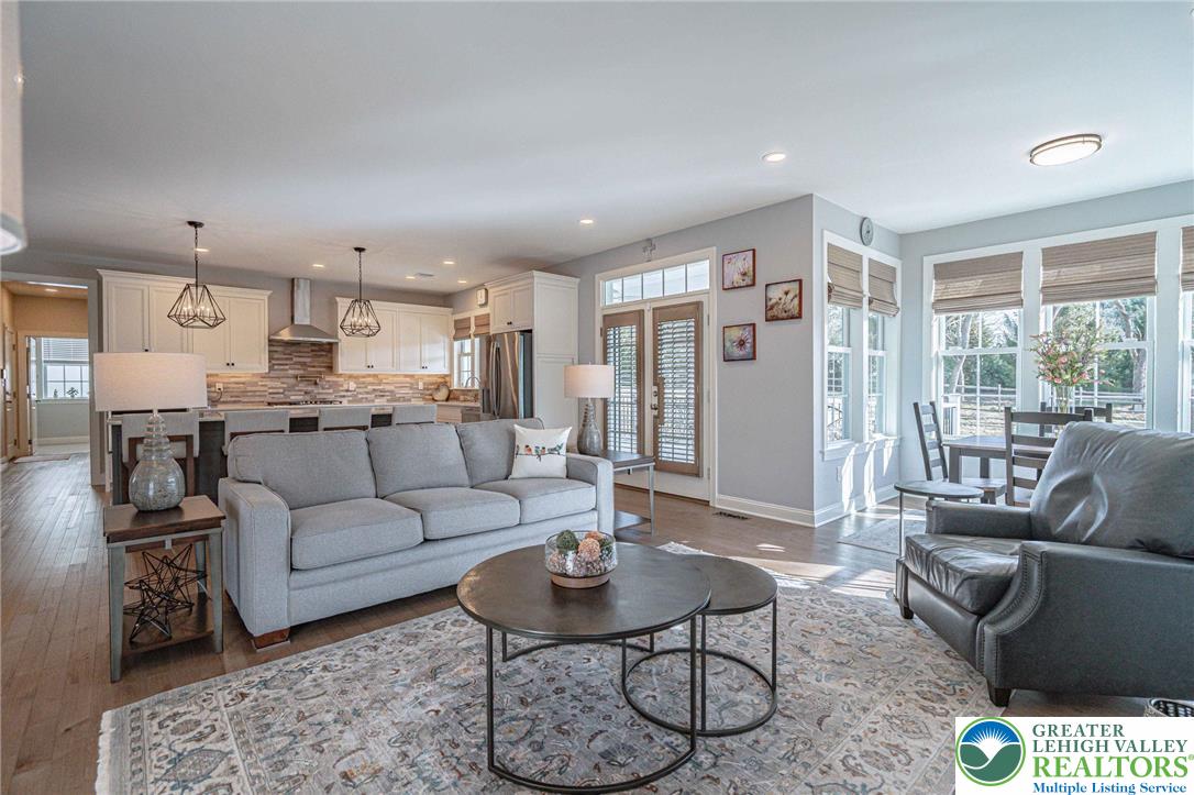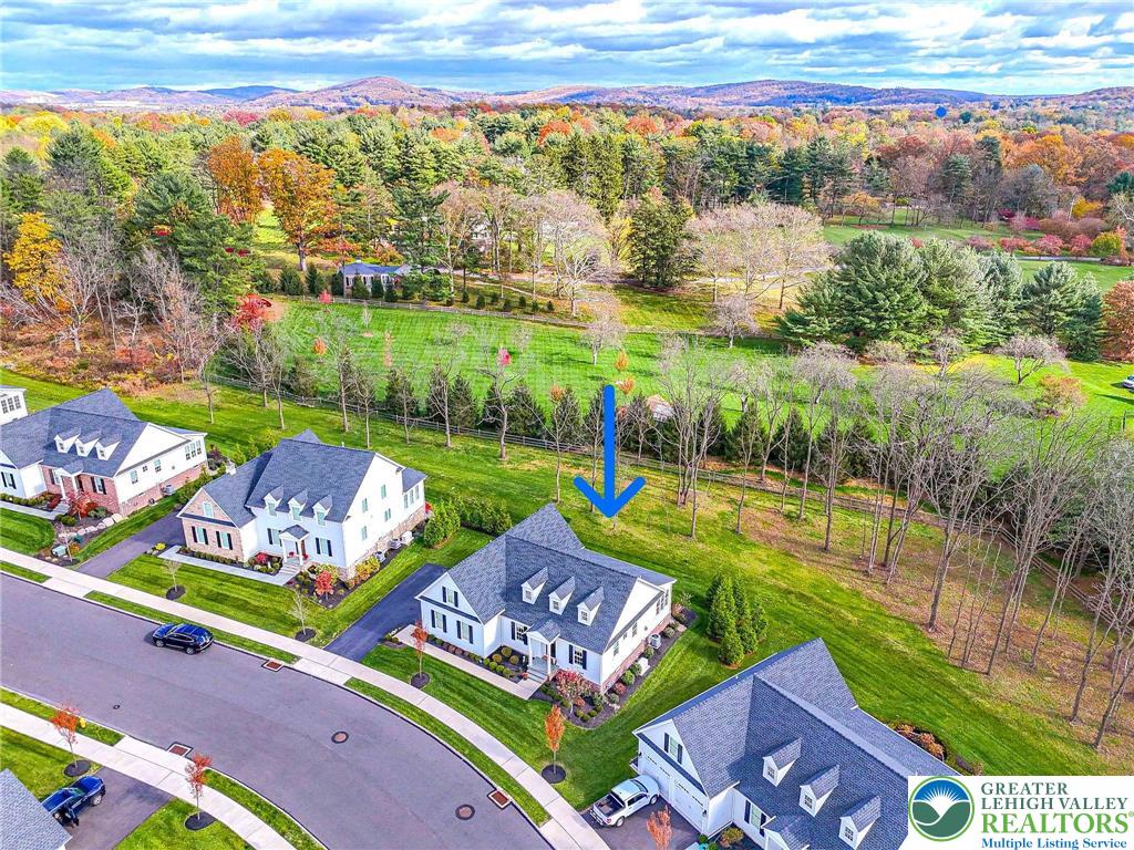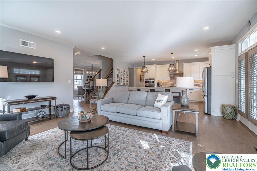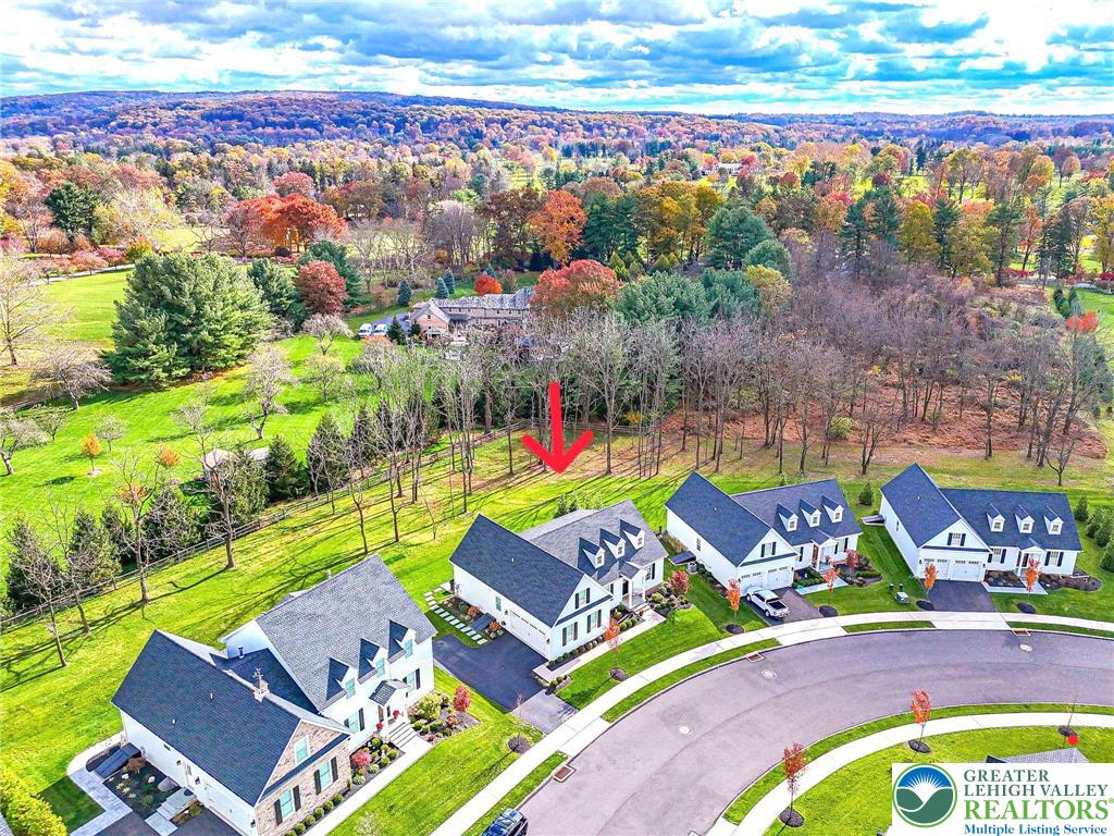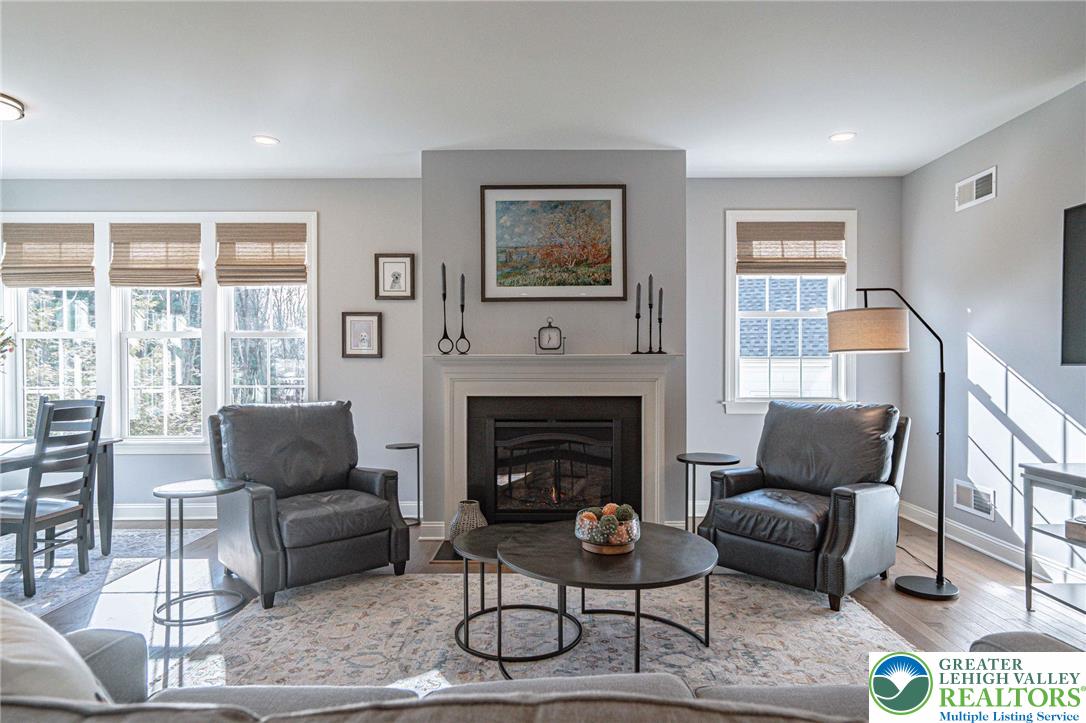 The Villas at Saucon Valley offer an exceptional lifestyle beside the scenic fields of LEHIGH UNIVERSITY, framed by expansive MOUNTAIN VIEWS. This CARRIAGE-STYLE TOWNHOME showcases LUXURY finishes and timeless exterior details including classic STONE AND STUCCO, COPPER ROOFING, and elegant BRICK WALKWAYS. Inside, a BRIGHT, OPEN LAYOUT is designed for comfort and entertaining, featuring rich HARDWOOD FLOORS and refined millwork, including CROWN MOLDING and WAINSCOTING in the foyer and dining area. The spacious great room is anchored by a dramatic FLOOR-TO-CEILING STONE FIREPLACE and a WALL OF WINDOWS that fills the space with NATURAL LIGHT. The beautifully appointed kitchen offers THERMADOR APPLIANCES, GRANITE COUNTERTOPS, and CUSTOM CABINETRY. Upstairs, the PRIMARY SUITE is a private retreat with a SPA-LIKE BATH and TWO WALK-IN CLOSETS. Two additional bedrooms each feature an EN-SUITE BATH, plus the convenience of a SECOND-FLOOR LAUNDRY. The expansive UNFINISHED BASEMENT provides excellent flexibility for HOBBIES, RECREATION, or STORAGE. Outside, the PRIVATE BACKYARD with a FLAGSTONE PATIO, RETRACTABLE AWNING, and FIRE FEATURE is perfect for morning coffee or relaxed evenings. Ideally located just a 3-MINUTE DRIVE to SAUCON VALLEY CC and MINUTES to HELLERTOWNS MAIN STREET and DOWNTOWN BETHLEHEM.