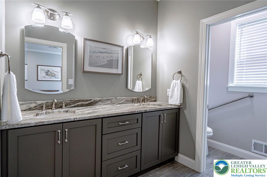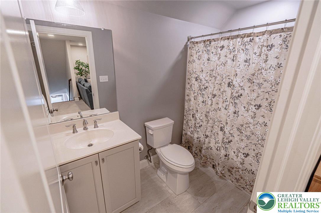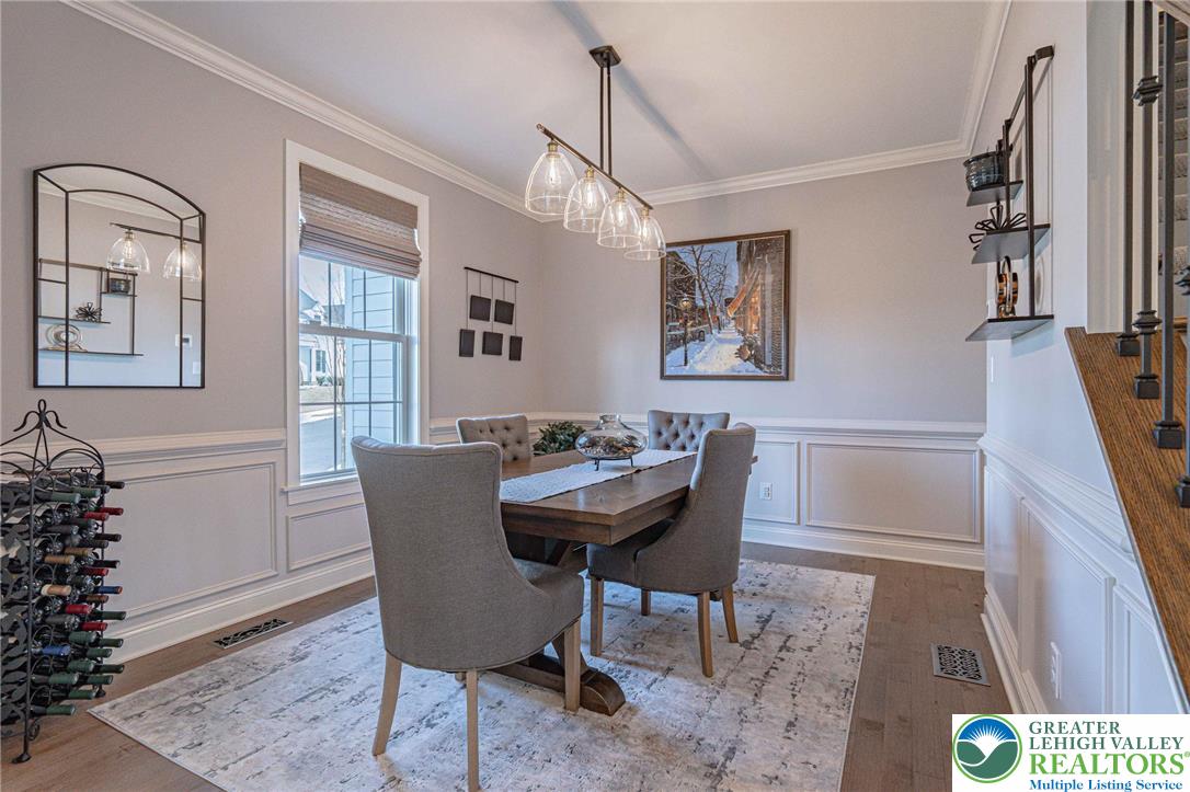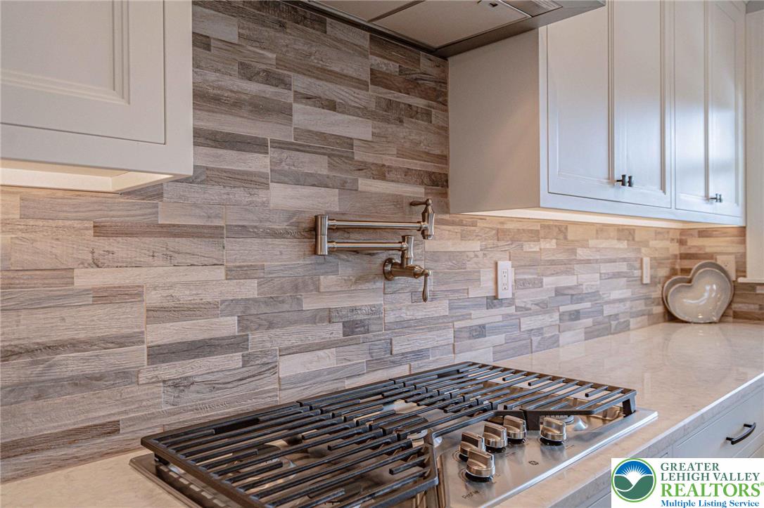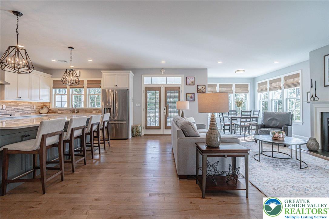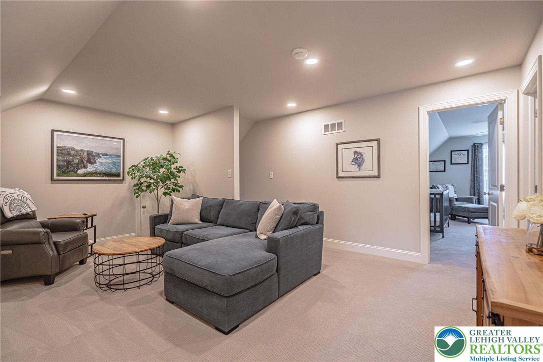 The Villas at Saucon Valley offer an exceptional lifestyle beside the scenic fields of LEHIGH UNIVERSITY, framed by expansive MOUNTAIN VIEWS. This CARRIAGE-STYLE TOWNHOME showcases LUXURY finishes and timeless exterior details including classic STONE AND STUCCO, COPPER ROOFING, and elegant BRICK WALKWAYS. Inside, a BRIGHT, OPEN LAYOUT is designed for comfort and entertaining, featuring rich HARDWOOD FLOORS and refined millwork, including CROWN MOLDING and WAINSCOTING in the foyer and dining area. The spacious great room is anchored by a dramatic FLOOR-TO-CEILING STONE FIREPLACE and a WALL OF WINDOWS that fills the space with NATURAL LIGHT. The beautifully appointed kitchen offers THERMADOR APPLIANCES, GRANITE COUNTERTOPS, and CUSTOM CABINETRY. Upstairs, the PRIMARY SUITE is a private retreat with a SPA-LIKE BATH and TWO WALK-IN CLOSETS. Two additional bedrooms each feature an EN-SUITE BATH, plus the convenience of a SECOND-FLOOR LAUNDRY. The expansive UNFINISHED BASEMENT provides excellent flexibility for HOBBIES, RECREATION, or STORAGE. Outside, the PRIVATE BACKYARD with a FLAGSTONE PATIO, RETRACTABLE AWNING, and FIRE FEATURE is perfect for morning coffee or relaxed evenings. Ideally located just a 3-MINUTE DRIVE to SAUCON VALLEY CC and MINUTES to HELLERTOWNS MAIN STREET and DOWNTOWN BETHLEHEM.