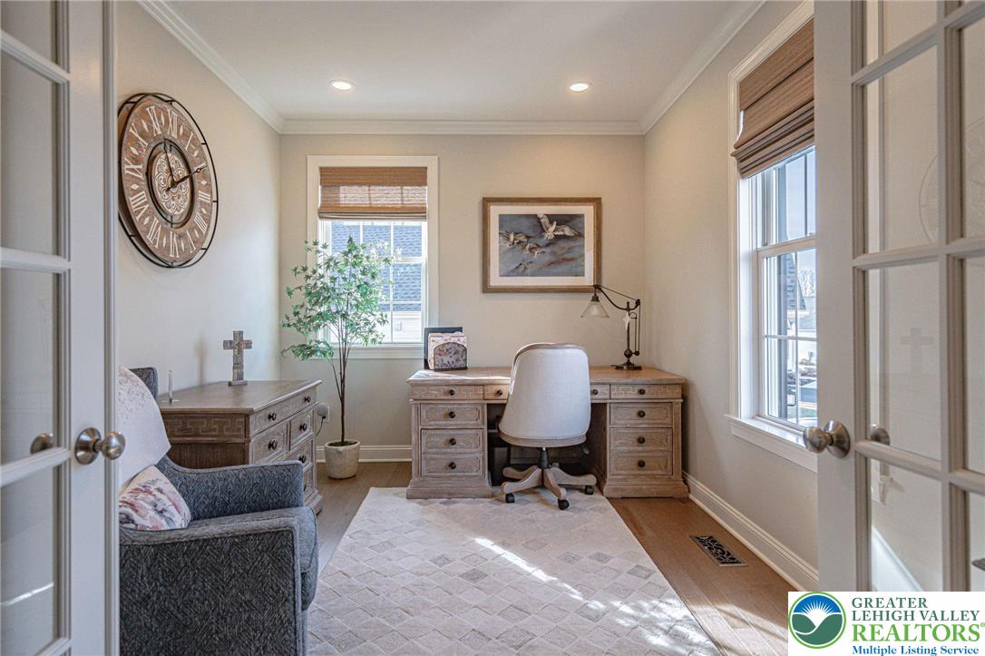 Welcome to The Cottages at Old Saucon, an exclusive 55 GATED COMMUNITY directly across from Saucon Valley Country Club. This stunning single detached home, nestled in the COMPLETED PHASE 1, offers 2,831 sq ft of meticulously designed living space, featuring a FIRST-FLOOR PRIMARY SUITE, elegant first-floor office, and a sun-drenched sunroom perfect for relaxation.