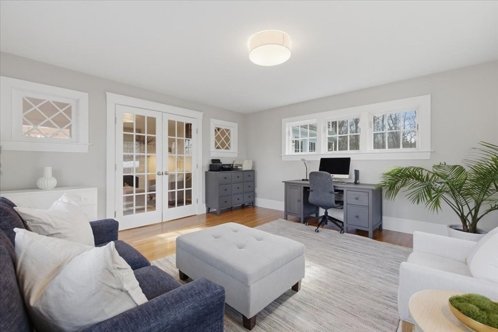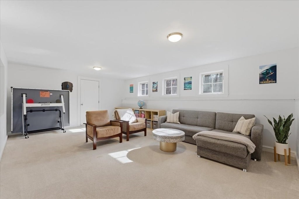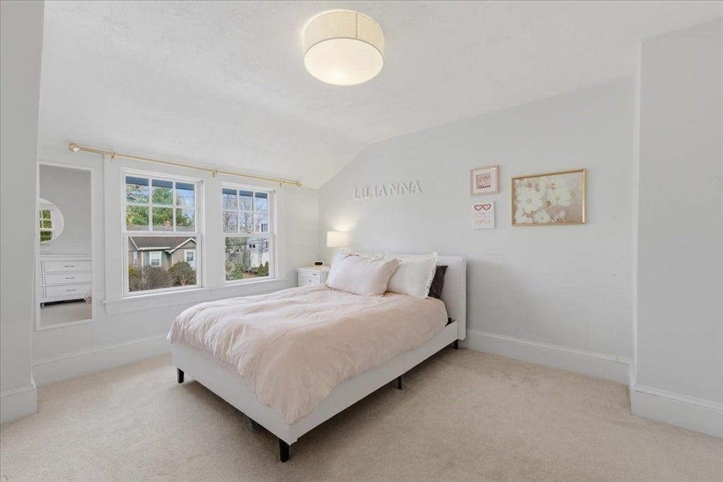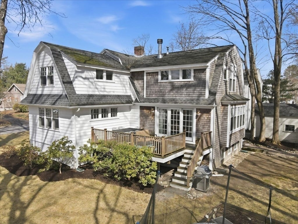 Gorgeous vintage 4 bed, 2.5 bath Gambrel style home offers a wealth of charm. Located in a highly desirable neighborhood, this property is within the Martha Jones school district. Sunny interior showcases hardwood flooring and a balanced floor plan featuring both open and defined rooms. The updated kitchen is appointed with SS appliances including an induction range and a stylish breakfast bar. Private home office is ideal for all your remote work needs. Architectural interest is enhanced by two fireplaces and custom built-in cabinetry. Primary suite on the upper level is distinguished by a vaulted, beamed ceiling, WIC and ensuite bath. Three additional generously sized bedrooms share a full hall bath. Finished lower level offers a versatile space suitable for a playroom, home gym, or media room, complemented by ample storage. Exterior features an inviting deck with wooded yard, all while maintaining proximity to the middle and high school, center of town, local shops and restaurants.