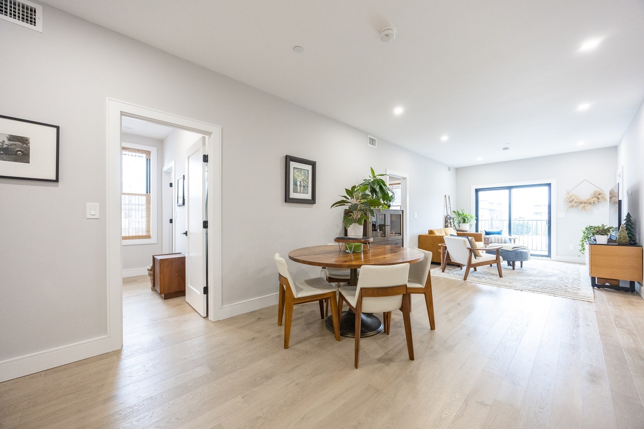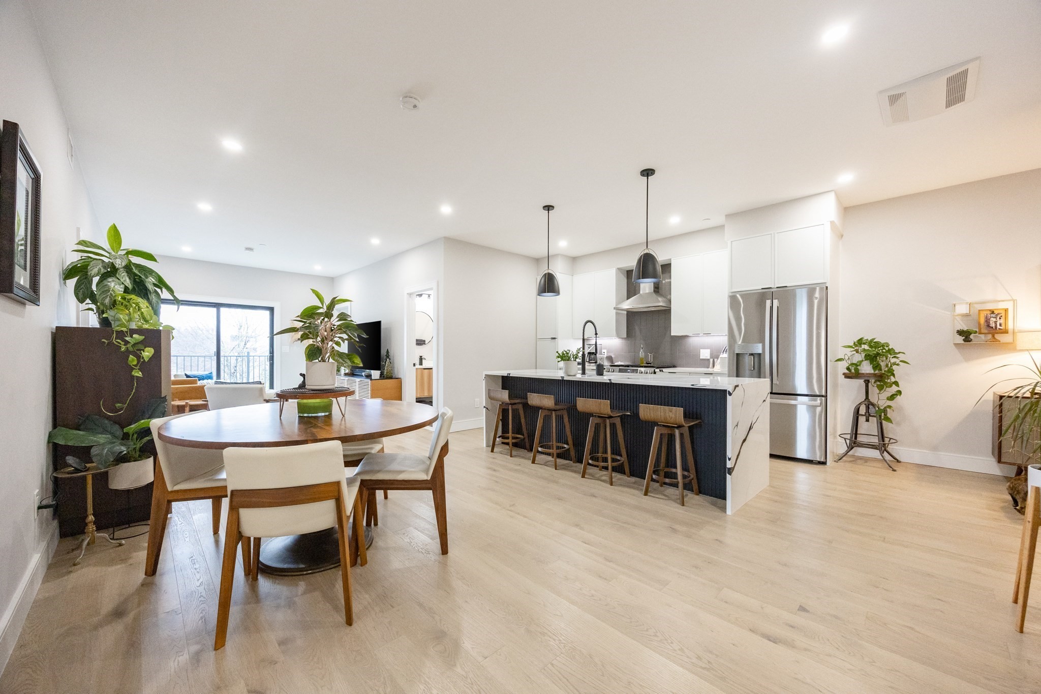 Penthouse 2 Bed Office / 2 Bath in a boutique 5-unit new construction building, featuring a private deck and TWO deeded parking spaces (#5 & #6) — a rare offering in East Boston. This 1,120/- sq ft home offers an open-concept layout with high ceilings, recessed lighting, and engineered hardwood floors throughout. The modern kitchen features shaker cabinetry with pull out drawers, quartz countertops, a large center island, and stainless steel appliances — ideal for both everyday living and entertaining. The spacious primary suite includes a walk-in closet and a beautifully appointed en-suite bath with double vanity and frameless glass shower. A generous second bedroom, full guest bath, and dedicated office space provide flexibility for today’s lifestyle. All closets have custom made closet designs. Additional features include central air, tankless hot water, and in-unit washer/dryer. Enjoy your private outdoor deck along with access to a shared yard space. Short walk to Blue Line.