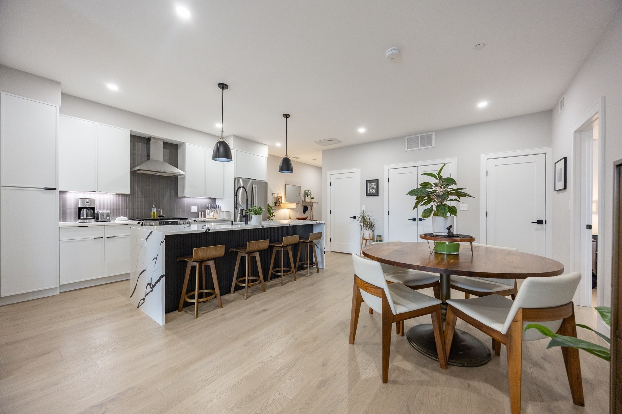 Penthouse 2 Bed Office / 2 Bath in a boutique 5-unit new construction building, featuring a private deck and TWO deeded parking spaces (#5 & #6) — a rare offering in East Boston. This 1,120/- sq ft home offers an open-concept layout with high ceilings, recessed lighting, and engineered hardwood floors throughout.