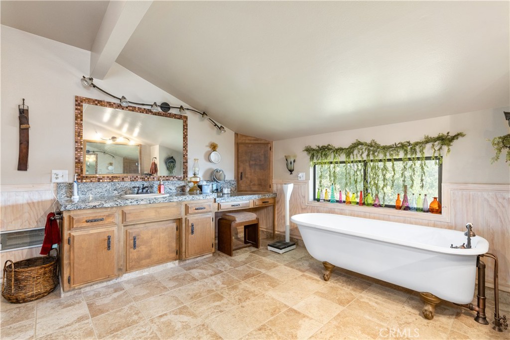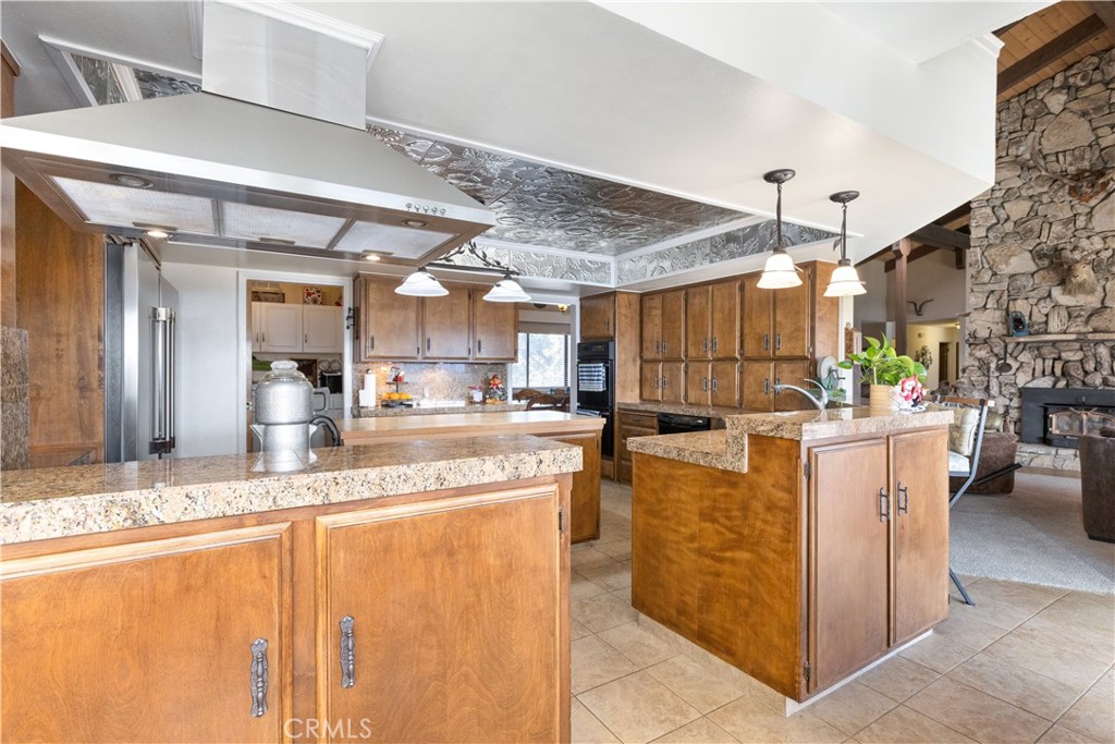 Tranquil Mountain top retreat with million-dollar views of Santa Margarita Lake! Custom built home with exceptional features of an impressive rock centerpiece that greets you as you enter which is equipped with a waterfall and koi pond. The rock continues into a daunting chimney for both the living room and the family room fireplaces, one with a wood burning stove inserts for functionality and beauty. The massive beamed ceilings are finished with tongue and groove wood providing ample space for art or collections. The open floor plan includes a dining area suitable for sizeable gatherings. The kitchen is a chef's dream with a huge butcher block island, built in refrigerator and freezer, double ovens, lots of storage and counter-space plus a massive walk-in pantry/butlers pantry. The tinned center ceiling provides a modern expression. The attached breakfast nook has a spectacular view of the lake.The primary suite has it's own wing with incredible views of the lake both inside and off it's deck. The on-suite bath is spacious with separate vanities, soaking tub, and shower. The suite is equipped with two wardrobe closets and a walk-in closet...no need to worry about a place for your belongings! Another main-level bedroom is in the west wing with a 3/4 bathroom. Downstairs are two more rooms and one bathroom with a shower. The indoor laundry room is furnished with a washer, dryer, sink, hidden ironing board, and built-in storage. The frontage acreage is sometimes used for cattle or horses and is cross-fenced. Nearby is the workshop with a concrete floor and a Dunn barn with a concrete floor that was once used for housing. The ideal mixture of usable land and a mountain top home!