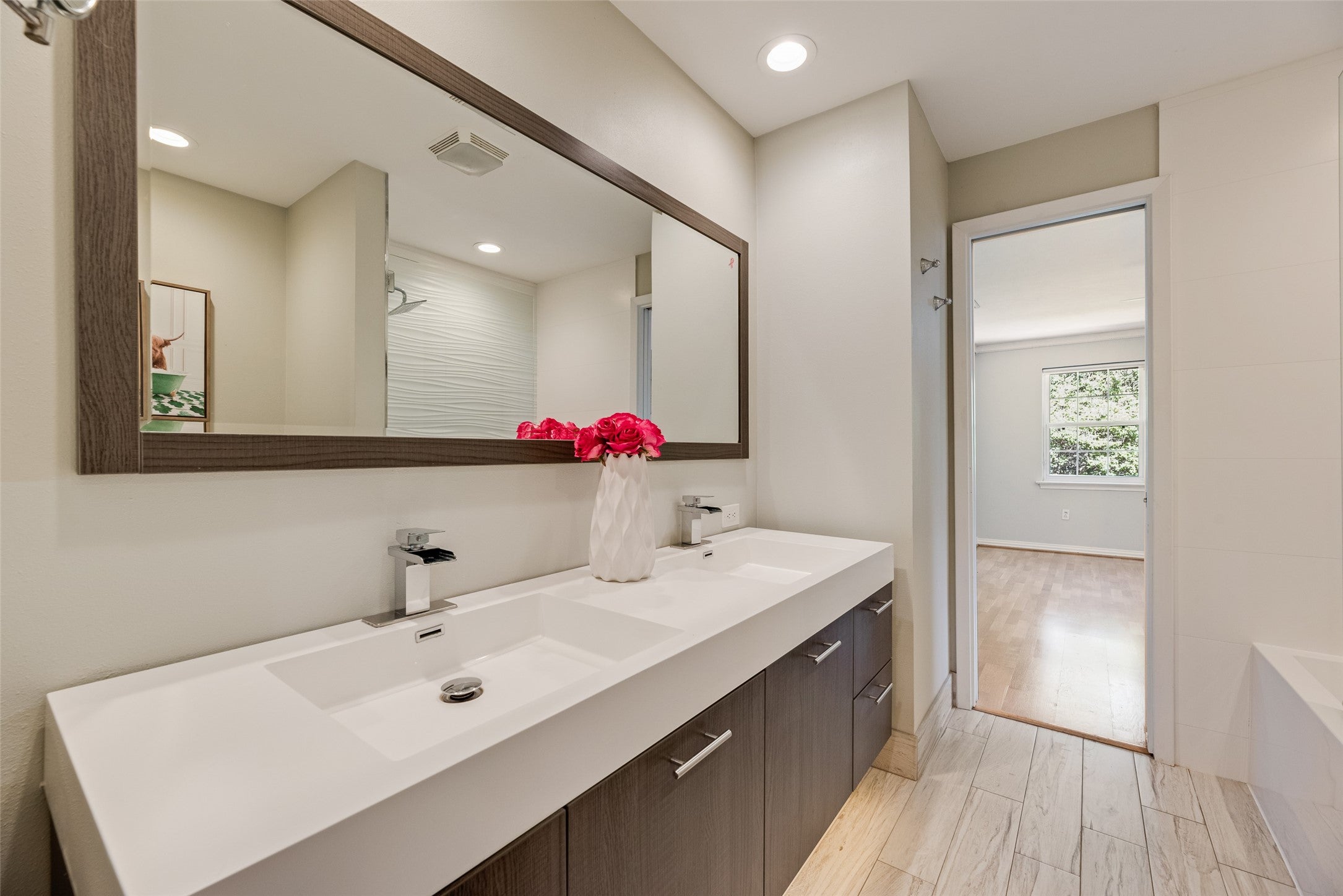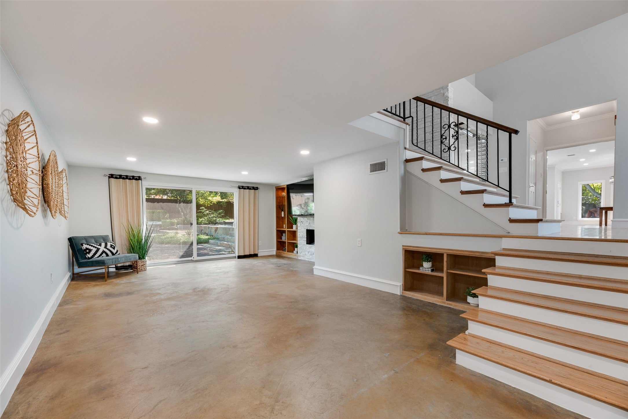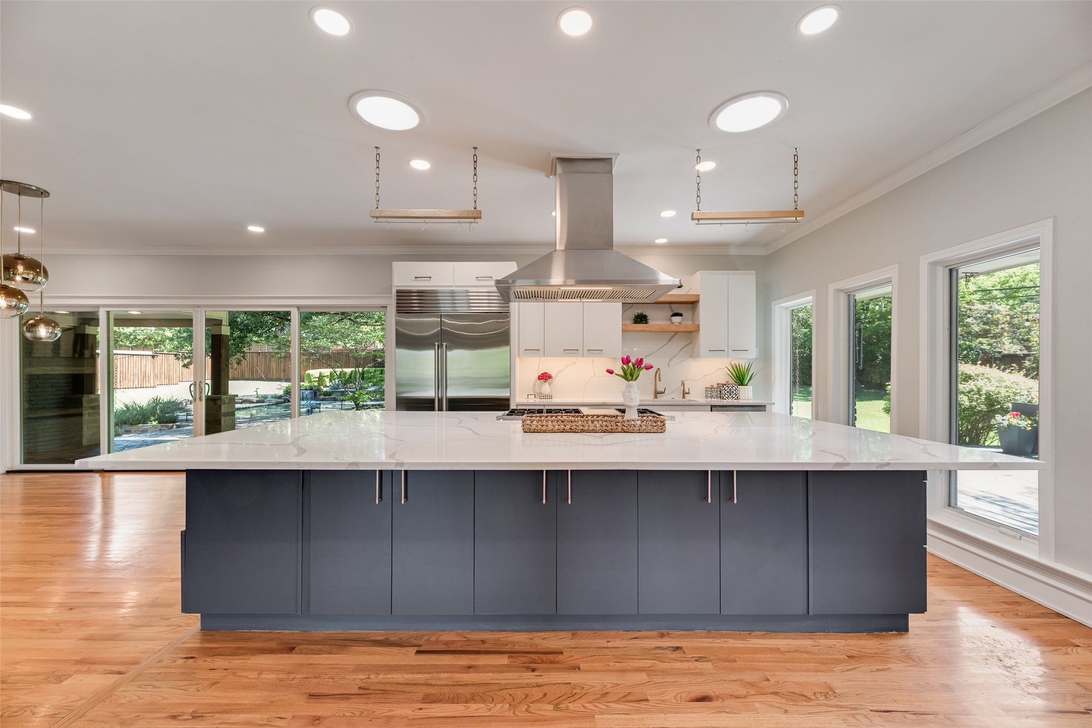 Live your Lake Highlands dream in this expanded mid-century modern home on a tree-lined street that offers great curb appeal. 9747 has a welcoming front entry and a courtyard in this beautifully updated 4-bedroom, 3.5-bath two-story stunner with coveted access to White Rock Elementary. This 3,575 sq. ft. home delivers impressive space, stylish updates, and a flexible layout designed for the way people live today. Inside, an open, light-filled layout showcases warm flooring and generous windows that create an inviting, comfortable feel from the moment you walk in. The main living room flows easily into the kitchen and dining spaces. The C-shaped kitchen features a smart, functional layout that keeps cooking and entertaining easy and enjoyable, highlighted by the expansive island that anchors the space. A spacious dining area connects seamlessly to the kitchen and living areas, with backyard views that make everyday meals and special occasions feel elevated. The primary bedroom is located on the first floor with vaulted ceilings. The oversized laundry room with mud cabinet adds everyday practicality and organization. The generous floor plan easily accommodates guests or a separate retreat for teens, with well-sized bedrooms and updated baths that blend clean lines with timeless touches. Step outside to your own private backyard oasis with a pool and hot tub-perfect for quiet mornings with coffee, grilling on the weekends, or hosting friends and family year-round. The detached 200 sq. ft. pool house with an additional full bath is the ultimate bonus: an ideal home office, gym, art studio, podcast space, or creative hideaway, making the home feel both fun and incredibly functional.