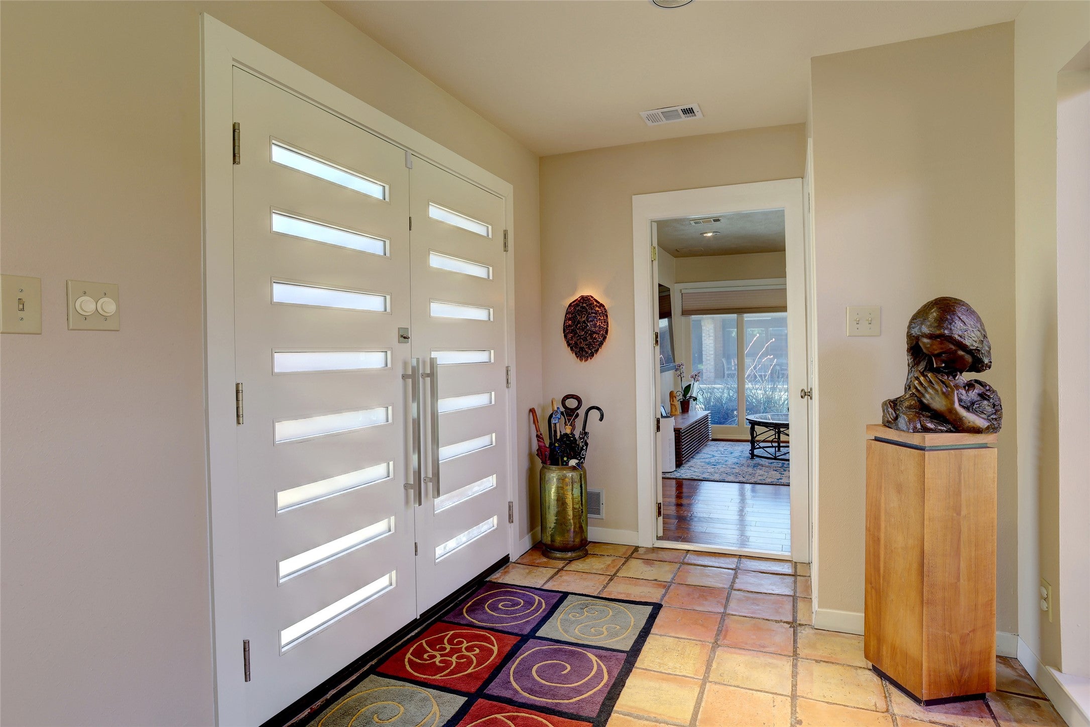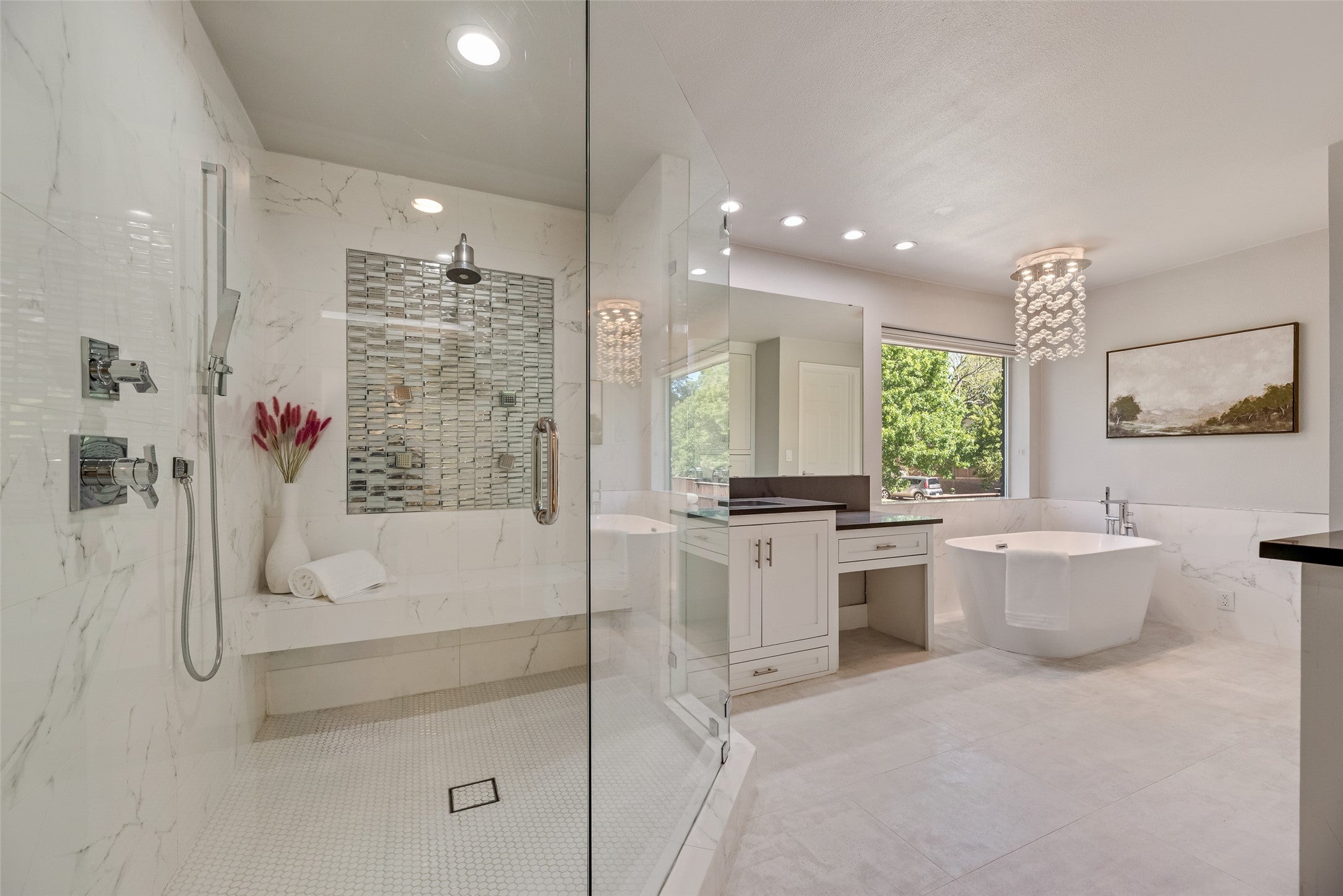 Coveted One-Story, Absolutely stunning, completely remodeled and thoughtfully updated and tucked away the sought after Bent Tree Fairways, offers the perfect blend of modern luxury and timeless comfort. With four spacious bedrooms and two and a half beautifully designed bathrooms, the layout is ideal for both family living and entertaining. The heart of the home is an incredible kitchen featuring premium finishes, high-end appliances, custom white out center island with waterfall quartz edge, plenty of cabinets, quartz counters and terrazzo tile backsplash, 5 burner gas cooktop with exhaust and pot filler, a layout that caters to ultimate culinary creativity. The expansive living area is filled with natural light from floor to ceiling windows, amazing iron and glass doors, amazing wet bar with wine fridge and passthrough window, and anchored by a lovely doubled-sided fireplace with beautiful floor to ceiling tile on one side and warm fluted wood paneling on the other side. The den with wood paneling is the perfect spot to enjoy reading, entertaining or intimate family gatherings. The primary suite is a true retreat, boasting a spa-like bathroom with elegant fixtures, stand alone soaking tub, huge shower with multiple heads, windows with electric shades overlooking the stunning landscape and pool. Two secondary bedrooms attached by a jack and jill bath with custom white oak cabinets, quartz counters and updated tiled shower for your guests and kids. The fourth bedroom is currently being used as a home office with wonderful light and access to the pool. Recent upgrades include flooring, paint, roof, gutters, all windows, doors, and heating and air units, ensuring peace of mind and energy efficiency. Step outside to your private backyard oasis, complete with sparkling pool, relaxing spa and lovely covered patio and lighting. Turfed side yard works great for a dog run. This home is a rare gem, combining thoughtful design, quality craftmanship and resort-style amenities.