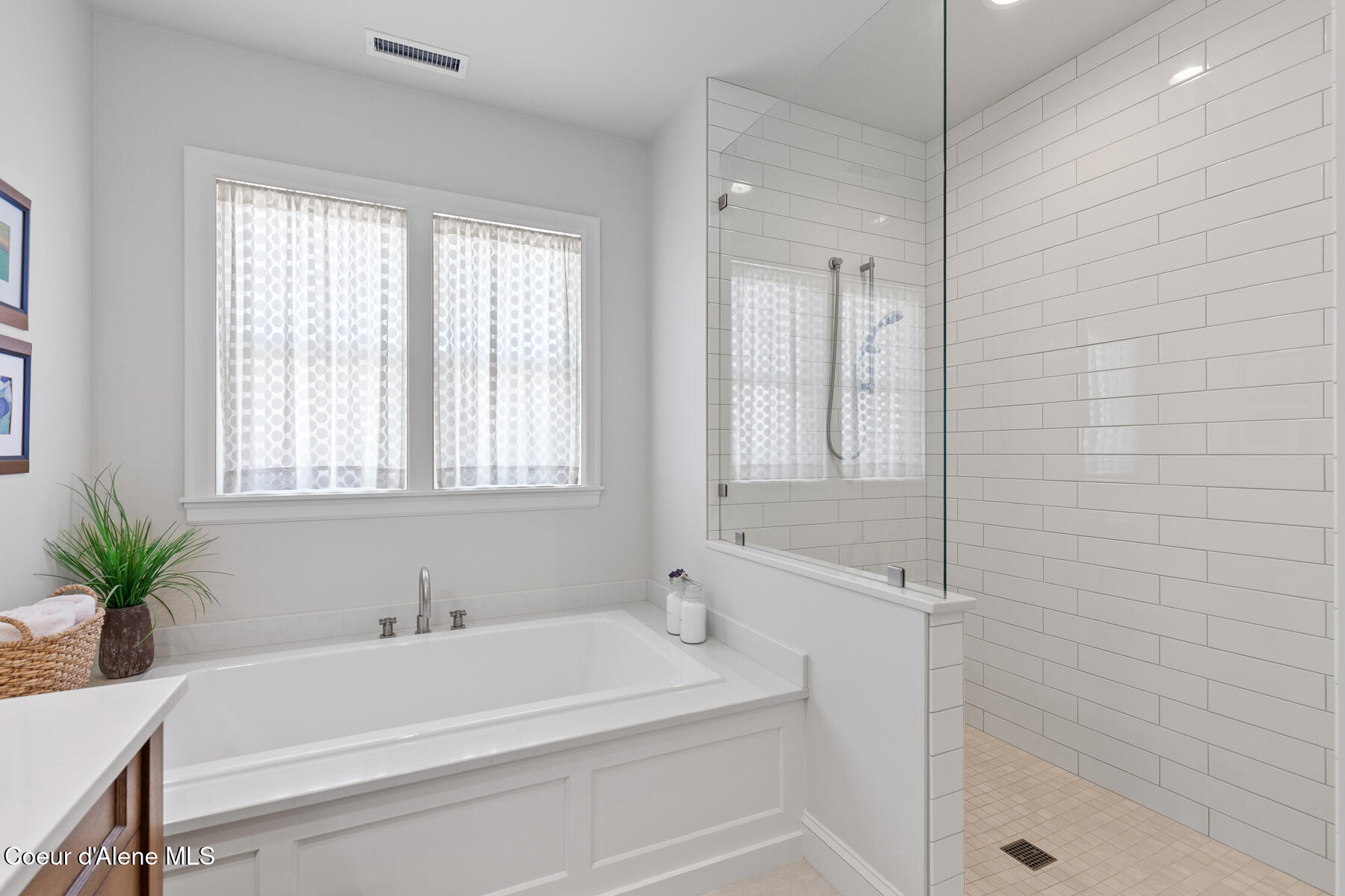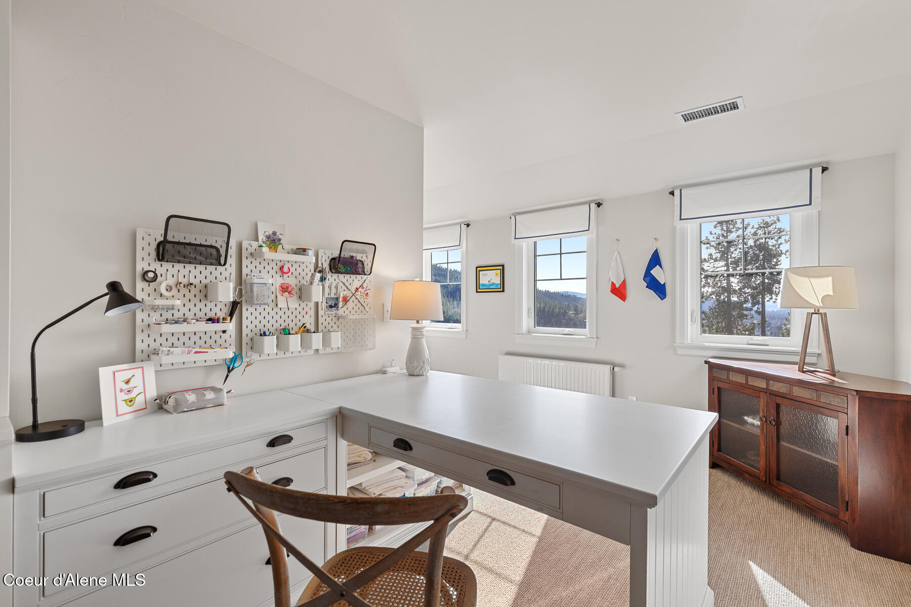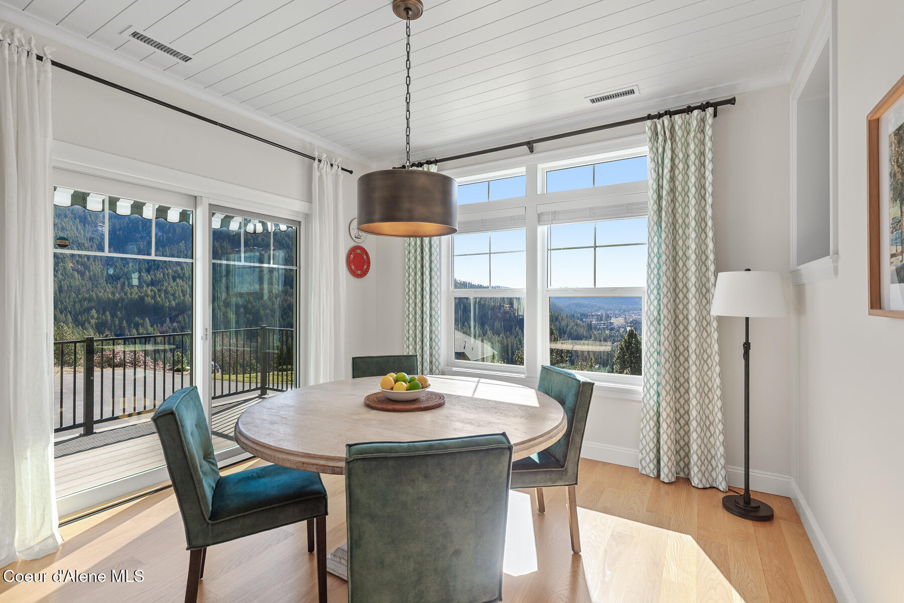 Intentionally built with uncompromising quality, this immaculate Cape Cod-inspired home captures panoramic views of Canfield Mountain, the city lights, and distant Lake Coeur d'Alene. Ideally situated in a neighborhood of exclusively custom homes on spacious lots, with close proximity to golf courses, the lake and town. Thoughtfully designed to be light, bright, and airy with an east facing kitchen and nook that are drenched in morning sunlight and features multiple flex spaces. Amenities include hydronic radiant in-floor heat and radiators offering superior air quality and temperature control, white oak engineered flooring, crown molding, tongue-and-groove kitchen ceiling, natural soapstone countertops, a custom walnut peninsula, premium Thermador and Bosch appliances, Emtek hardware, and JACLO plumbing fixtures with preset shower temperatures. Exterior features an expansive front porch, garden beds, garden shed, and full fencing. A must see home. Outdoor living is equally impressive with a 40' covered front porch with electric shades, expansive covered back patio, fully fenced and professionally landscaped yard with buried gas lines, garden beds, and a storage shed. The oversized, fully finished garage includes a private sauna. Pride of ownership shines throughout this meticulously maintained single-owner home -- a rare combination of beauty, craftsmanship, and enduring quality.