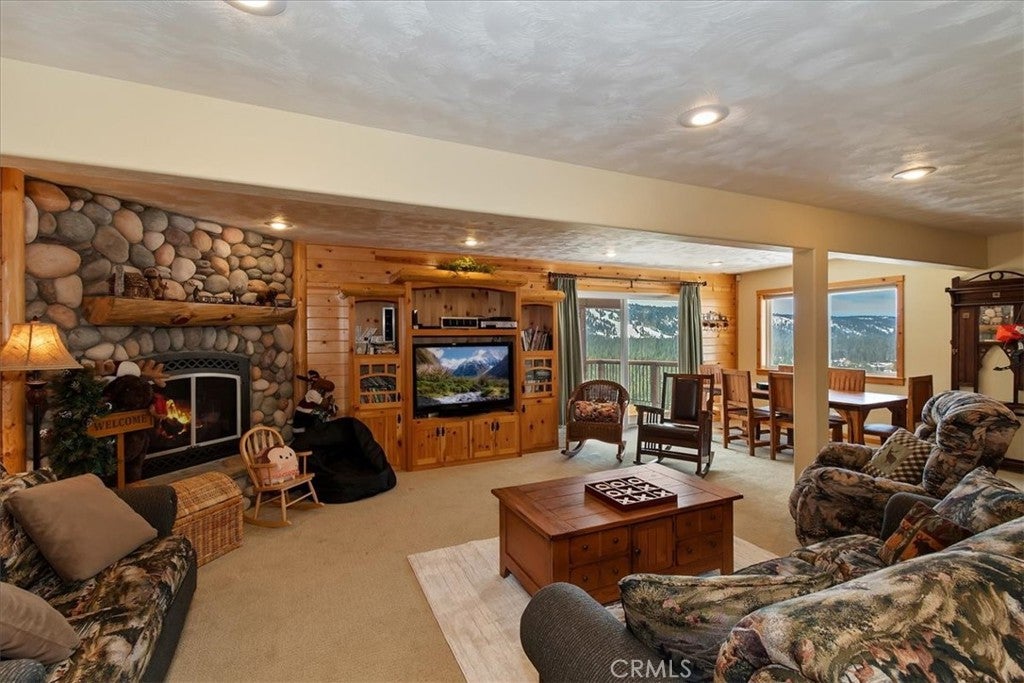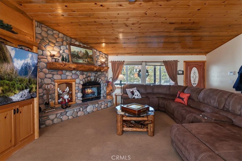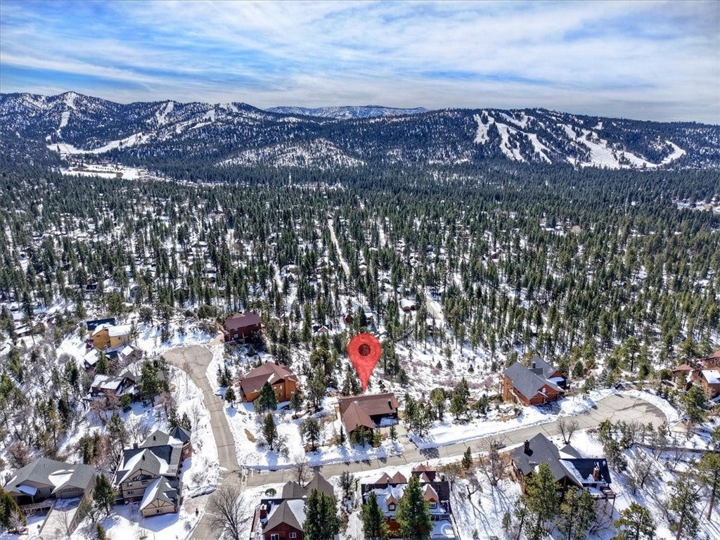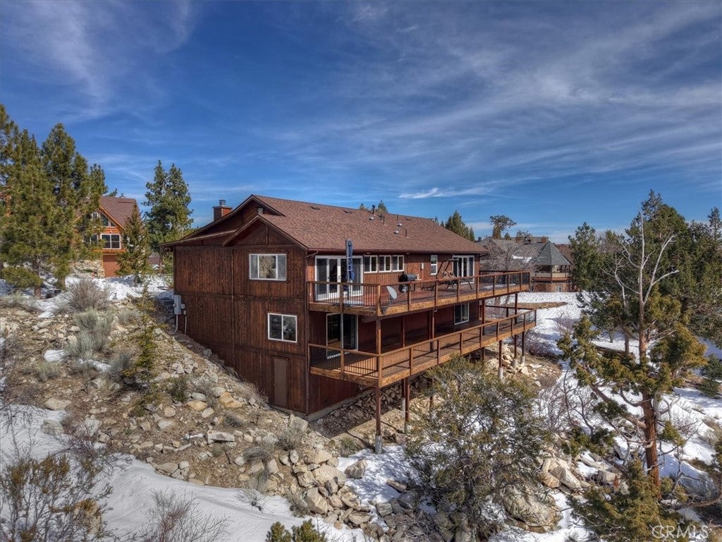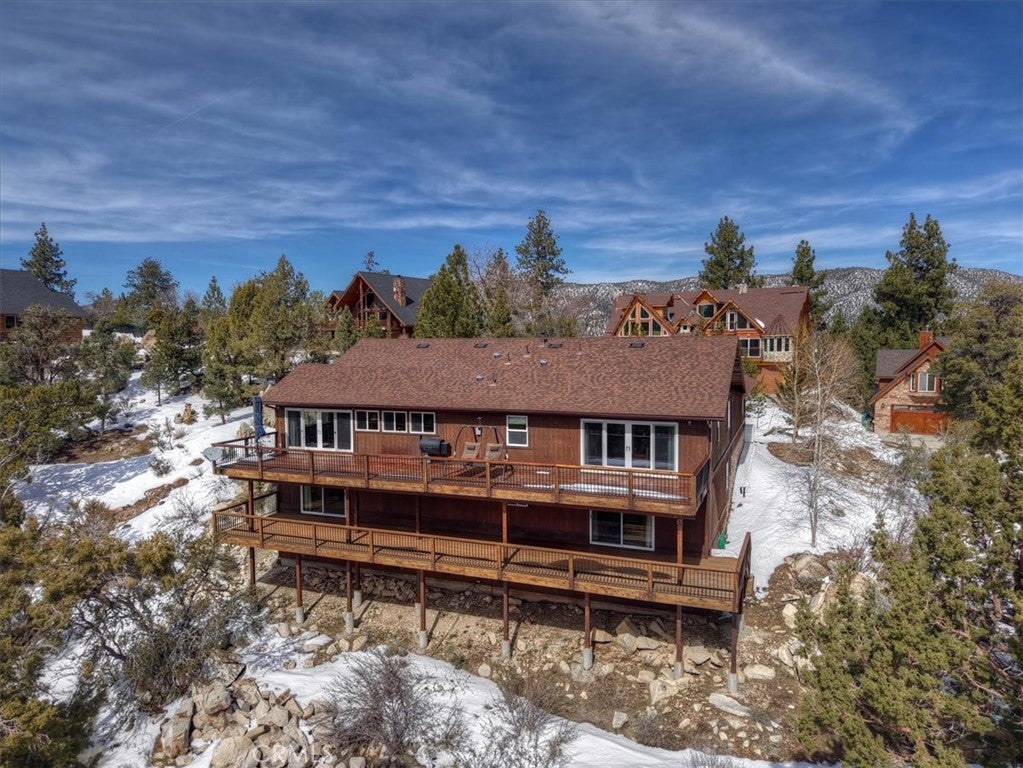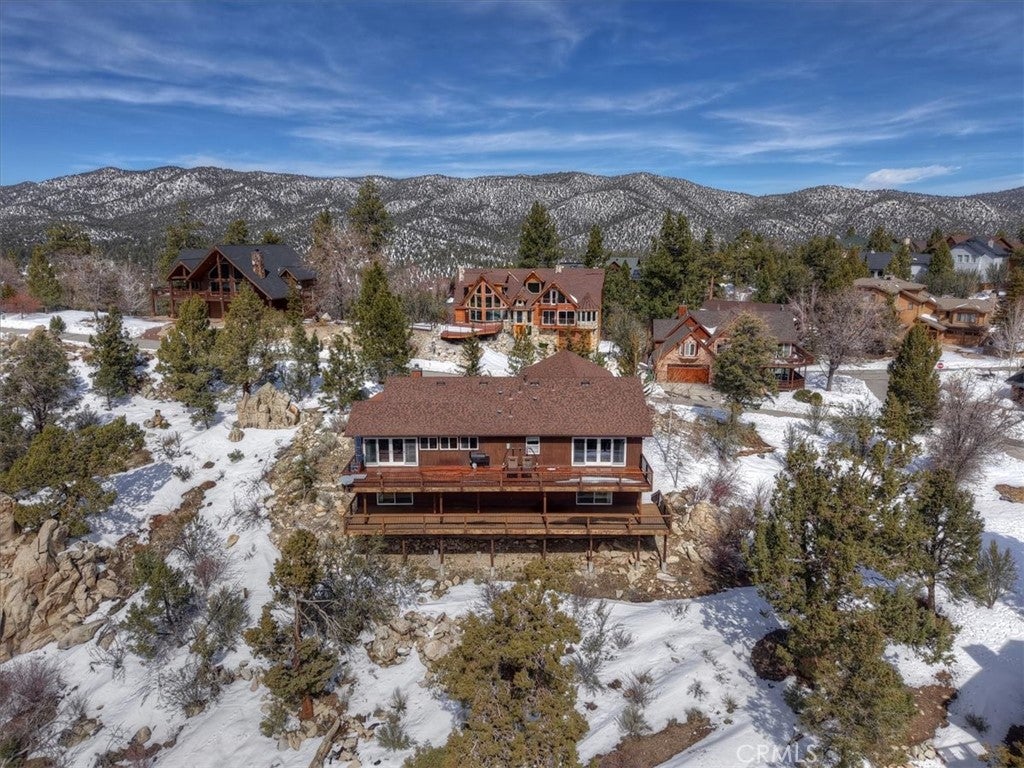 Perched at the top of prestigious Castle Glen on Pegasus Way, this luxury retreat captures breathtaking ski slope views of both Bear Mountain and Snow Summit. Designed with a reverse floor plan to maximize the scenery, the home features vaulted tongue-and-groove ceilings and expansive upper and lower decks overlooking unbuildable forest with a peek of the lake. Offering 5 bedrooms plus an additional office and 4 full bathrooms, the layout is ideal for hosting and privacy alike. The main level includes 3 bedrooms and 2 baths, while the lower level offers 2 bedrooms, an office, and 2 baths. Two spacious primary suites feature walk-in closets and direct deck access. Each level is complete with its own living room, fireplace, and laundry room. Dual forced-air heaters and dual water heaters provide comfort and efficiency year-round. The kitchen is appointed with granite countertops and stainless-steel appliances. Turn-key and thoughtfully designed, this mountain estate also includes a way oversized two-car garageperfect for vehicles, toys, and gear.