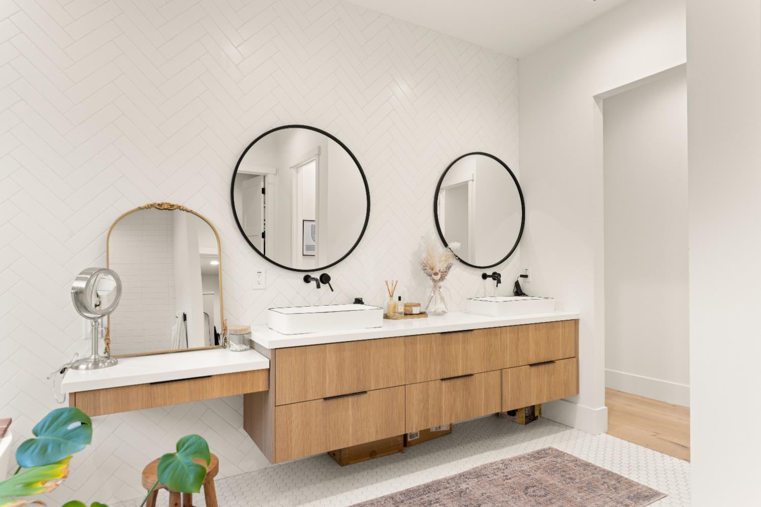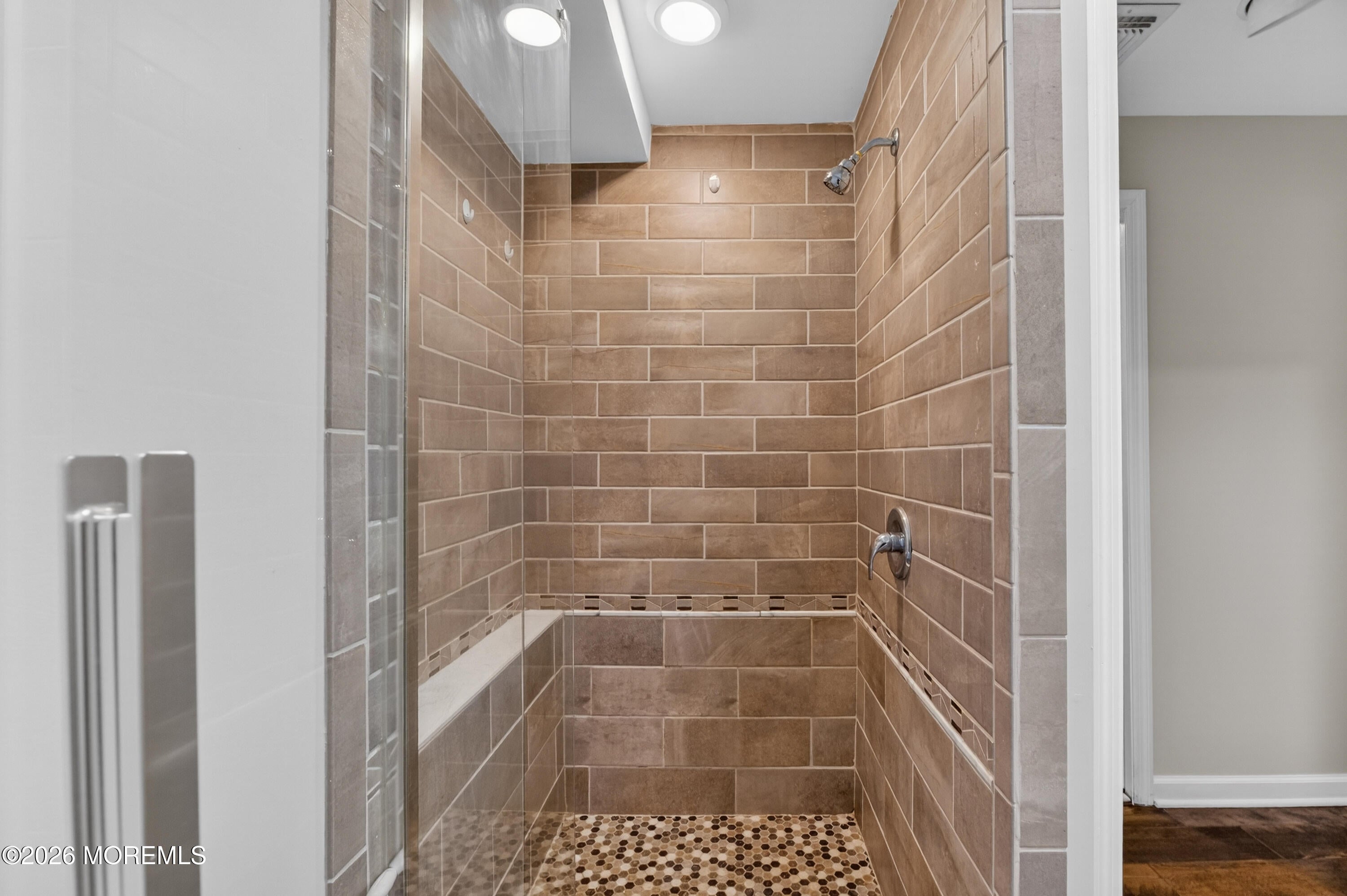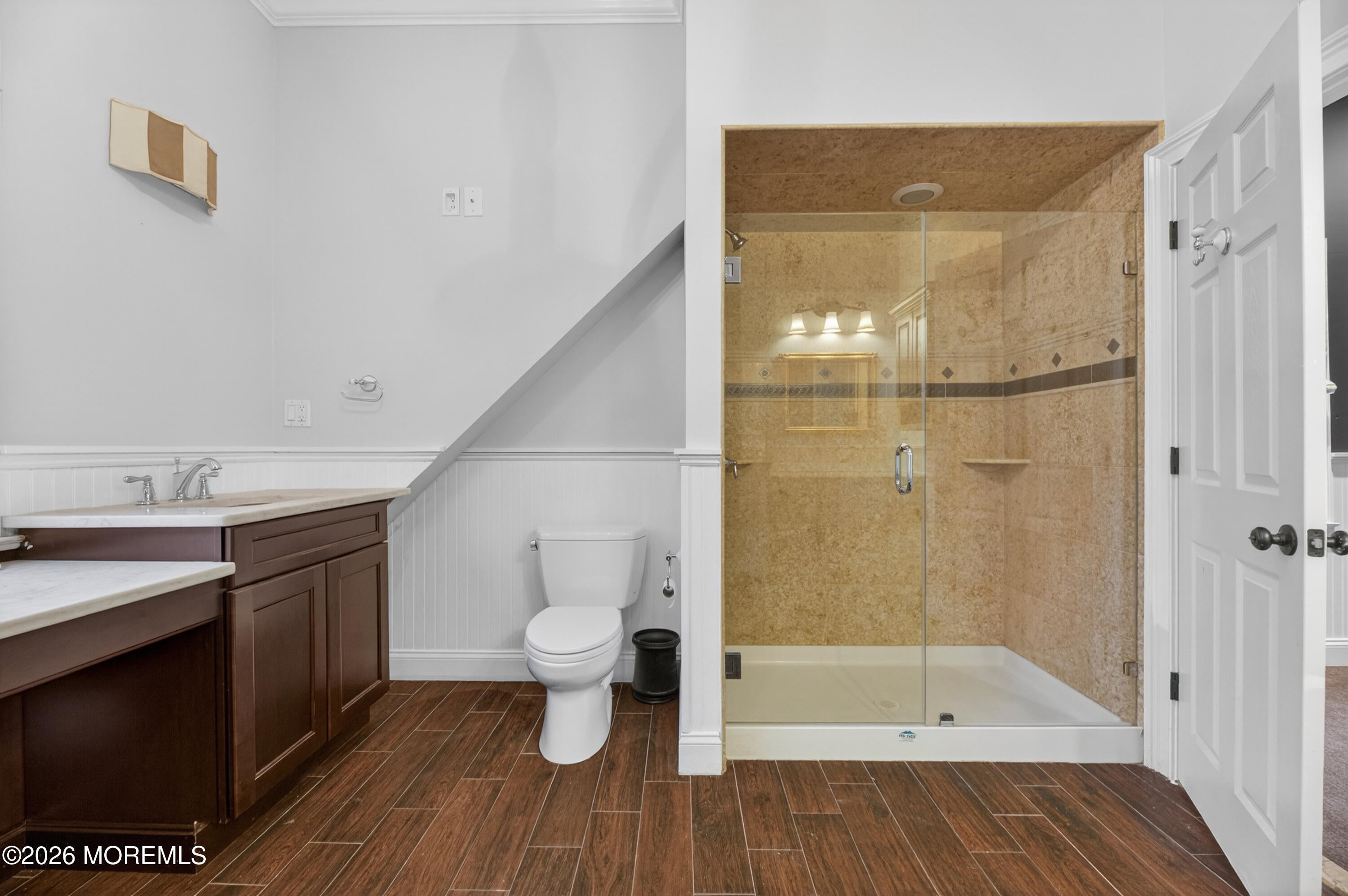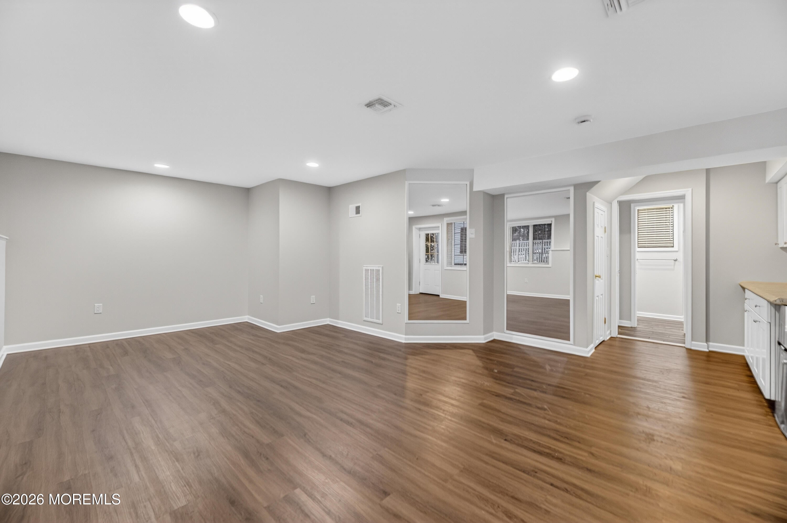 Exceptional custom contemporary in prestigious Marlboro Woods Estates offering 5 bedrooms and 4.5 baths in one of Marlboros most sought-after neighborhoods. A dramatic two-story entry with porcelain flooring opens to a bright, airy layout with vaulted formal living room, sunken family room with Gas Fireplace, and walls of windows overlooking the private backyard. Spacious kitchen features a large center island, three pantries, and deck access for easy indoor-outdoor living. First-floor bedroom suite with full bath plus powder room offers added flexibility. Upstairs includes generously sized bedrooms, a primary suite with dressing room and marble bath, and a newly renovated main bath with frameless glass shower. Newly renovated finished basement adds excellent living space with luxury vinyl plank flooring, recreation area, storage, and private office or possible additional bedroom with egress window. Recent updates include newer HVAC and new hot water heater. Hardwood flooring throughout first and second floors, Nest thermostats, cedar closet, workshop space, side-entry garage, paver walkway, and private grounds complete this exceptional offering