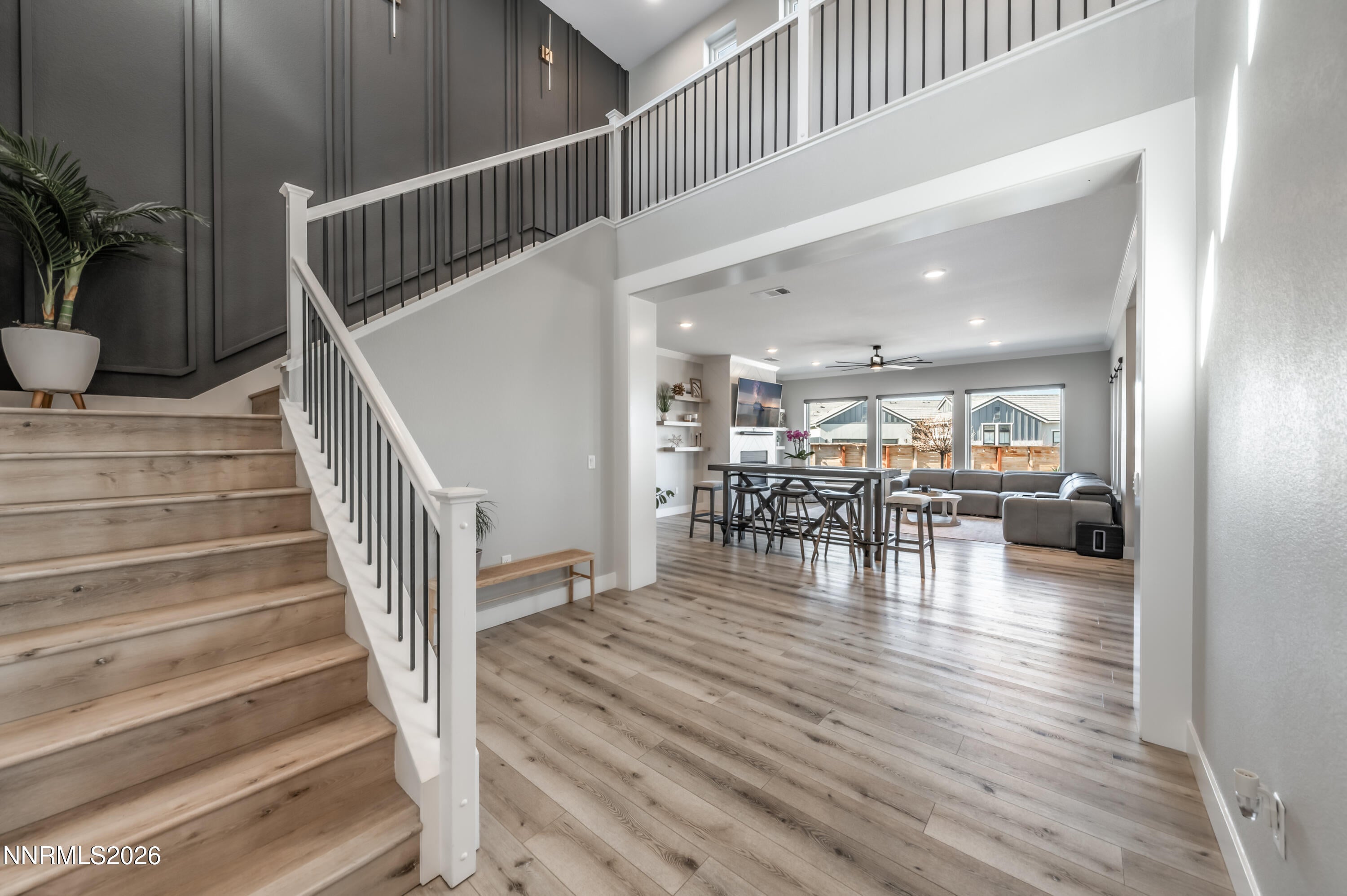 Welcome to 971 Little Star Drive, a beautifully upgraded contemporary home in desirable South Reno where thoughtful design meets elevated everyday living. From the moment you arrive, the striking exterior featuring clean architectural lines, stone accents, and a spacious three-car garage sets an impressive tone. Step inside to a dramatic entry with soaring ceilings and an elegant staircase that opens into a bright and inviting great room designed for both comfort and entertaining. The heart of the home is the stunning chefs kitchen and open living area, where expansive windows flood the space with natural light. The kitchen showcases sleek quartz countertops, crisp white cabinetry, stainless steel appliances, a built-in wine feature, and an oversized island perfect for gathering with friends and family. Wide-plank LVP flooring flows throughout the main living areas, adding warmth and durability. Thoughtful upgrades elevate the homes functionality, including reverse osmosis water filtration throughout, enhanced WiFi connectivity in multiple rooms and the office, upgraded bedroom insulation for added comfort, and stylish custom board-and-batten accent walls that add a designer touch. Upstairs, a versatile loft-style landing overlooks the main level and provides flexible space for a home office, reading nook, or media area. Spacious bedrooms and modern bathrooms offer comfort and clean, contemporary finishes. The finished garage features commercial-grade epoxy flooring, providing a polished and durable space for vehicles, storage, or hobbies. Step outside to your private backyard retreat, thoughtfully designed for both relaxation and entertaining. The fully xeriscaped yard features Italian pavers, a gas fire pit, an Italian stone water feature, and plush turf with a built-in drainage system perfect for pets. A covered patio creates the ideal setting for outdoor dining, while a built-in holiday lighting package makes seasonal decorating effortless. Located in sought-after South Reno, this home offers convenient access to shopping, dining, outdoor recreation, and top-rated schools, all while enjoying the quiet charm of a newer neighborhood. Modern, stylish, and filled with thoughtful upgrades971 Little Star Drive delivers the lifestyle todays buyers are looking for. *Please note, this home is a 4 bedroom 3.5 bathroom with additional office as apart of the homes upgrades*