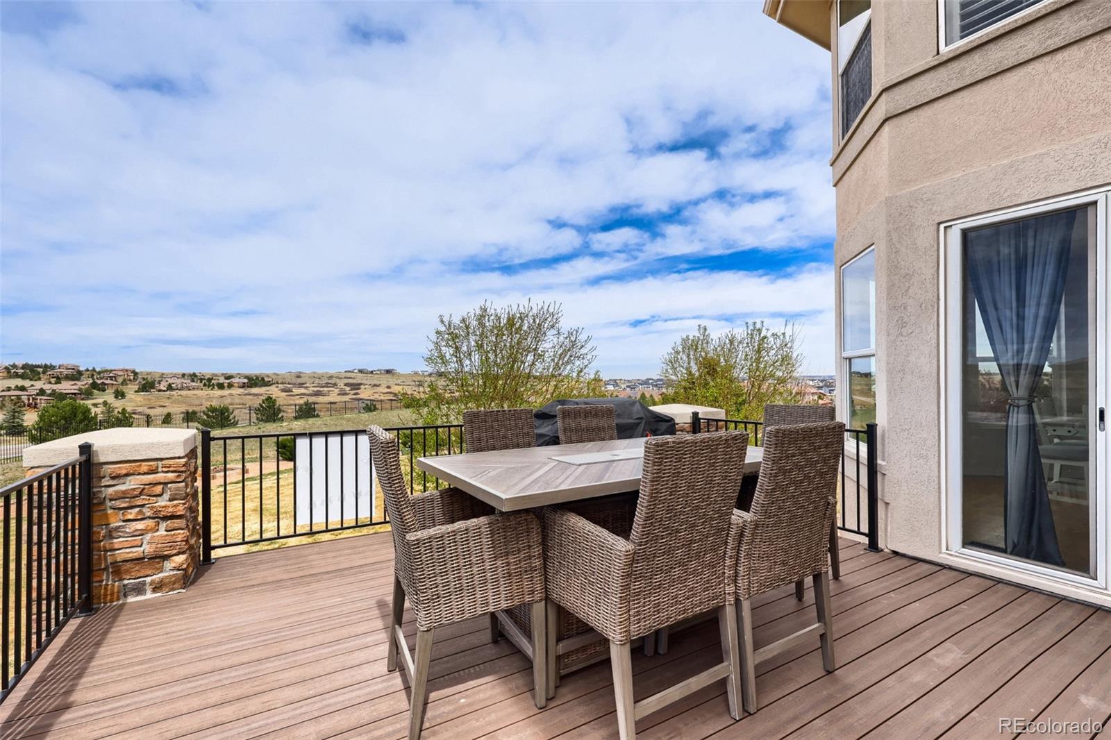 Welcome to this beautifully updated 6-bedroom, 7-bath estate in the quiet, gated community of Vistancia, perfectly positioned between Parker and Castle Rock. This stunning home offers an inviting open floor plan filled with natural lightperfect for both relaxed living and effortless entertaining. The expansive great room with gas fireplace flows seamlessly into the breakfast area and the updated gourmet kitchen, showcasing new quartz countertops, a stylish backsplash, freshly painted cabinets, upgraded fixtures and hardware, elegant lighting, and a premium stainless appliance package. New carpet and professional interior paint throughout create a fresh, modern feel. Upstairs, generous bedrooms each include a walk-in closet and full bath, providing comfort and flexibility for family and guests. The luxurious primary suite offers a cozy fireplace and ample space to unwind. The finished basement is an entertainers dream, complete with a wet bar, home theater, game or lounge area, and two additional bedroomseach with an en suite bath, including a spacious guest suiteperfect for visitors or multi-generational living. Car enthusiasts and hobbyists alike will appreciate the oversized 4-car garage with a built-in loft for extra storage, providing plenty of room for vehicles, gear, and projects. Outdoors, the spacious yard backs to open space and features a new deck, fire pit, and upgraded irrigation systeman ideal setting for gatherings or quiet evenings under the stars. Enjoy direct access to neighborhood amenities and the nearby Cherry Creek Trail, plus close proximity to The Club at Pradera, The Pinery Country Club, and Colorado Golf Cluboffering 63 holes of championship golf, three clubhouses, and tennis facilities. Just minutes from downtown Parker, this exceptional home blends privacy, elegance, and convenience. Suburban luxury meets Colorado charm in an incredible place to call home.