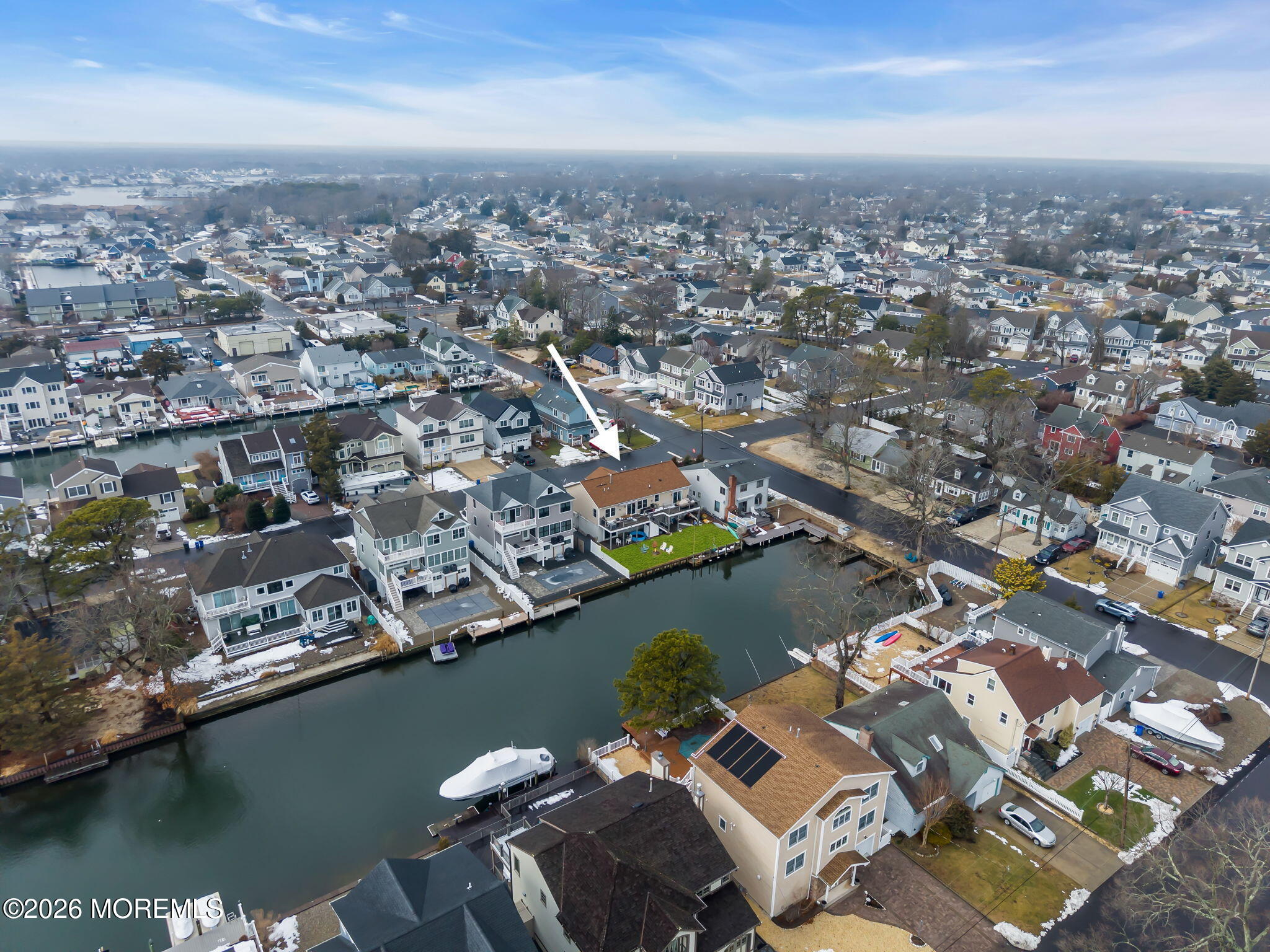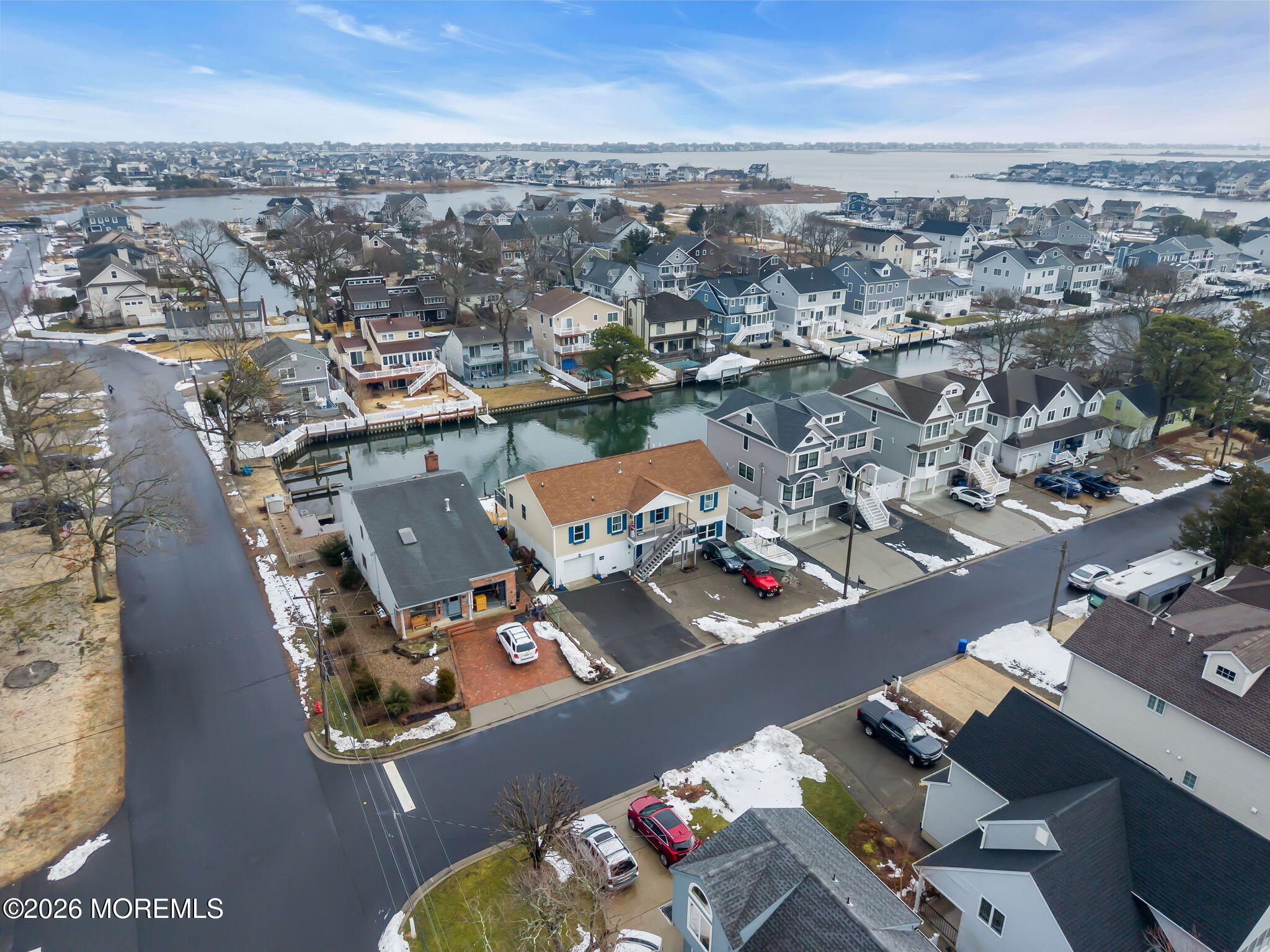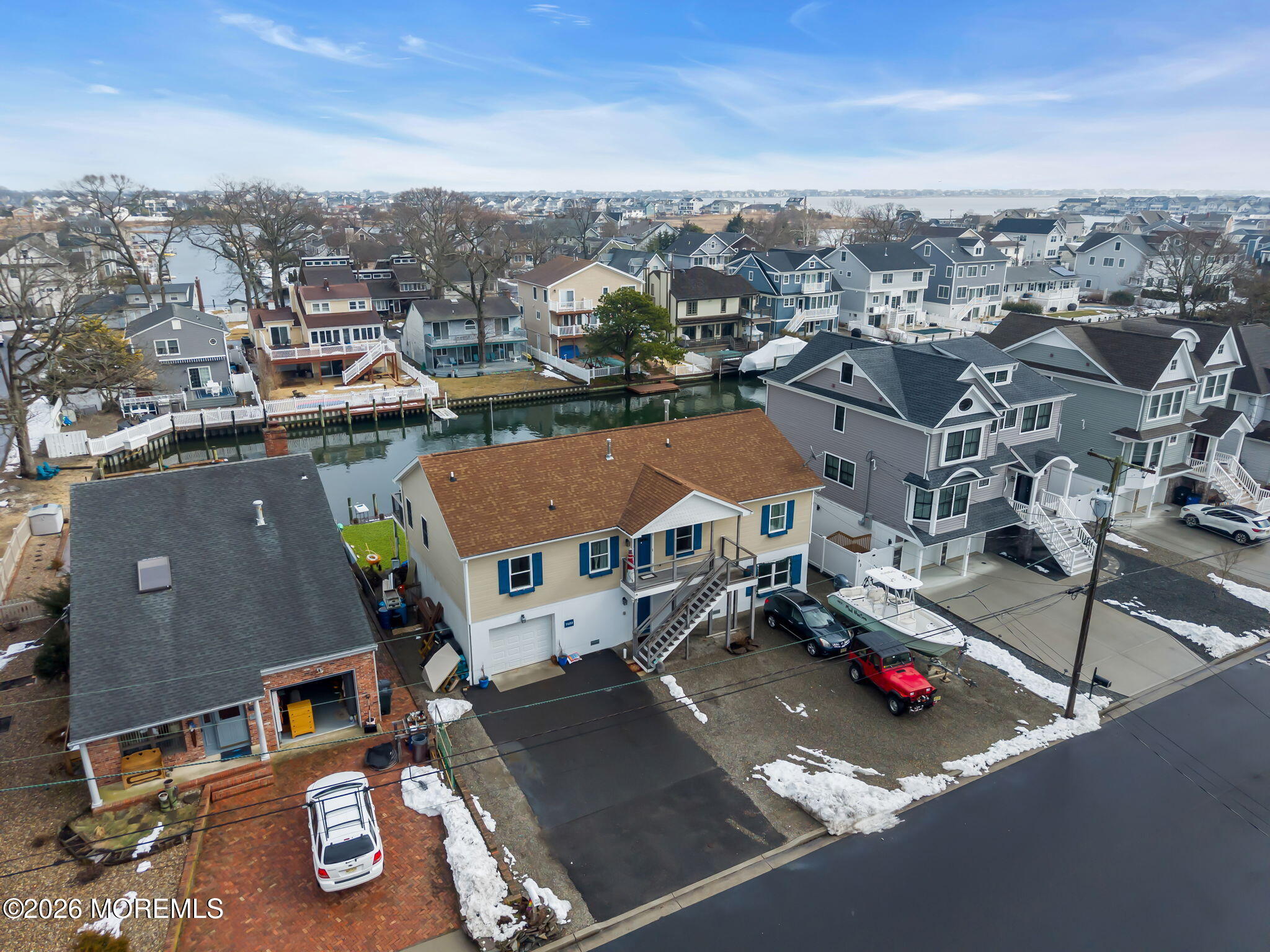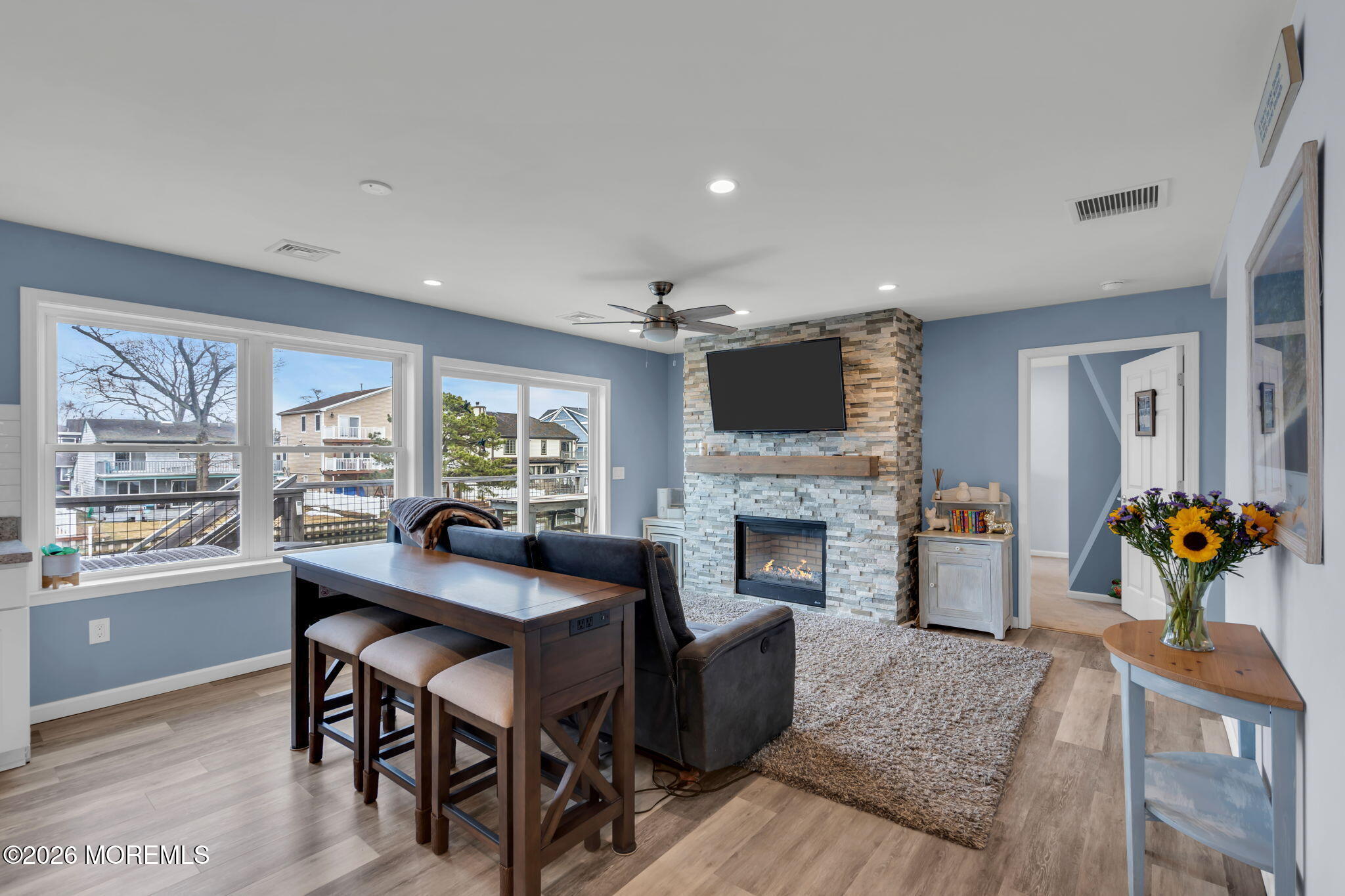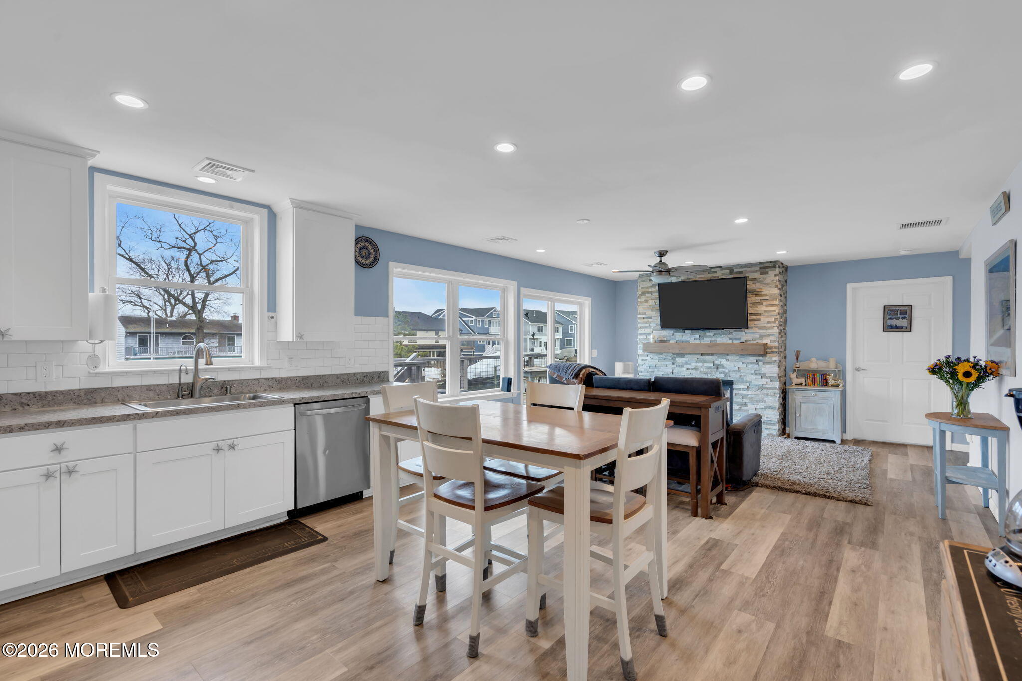 Rare opportunity in desirable Sunshine Harbor, a waterfront property with 70 feet of vinyl bulkhead offering direct access and the coastal lifestyle buyers dream about. Newly built and elevated in 2018, this home offers modern construction and a flexible layout designed for comfortable living and easy entertaining. This home welcomes you with a spacious laundry room and bonus sitting room, luxury vinyl flooring and an inviting gas fireplace that anchors the living space. A well designed kitchen with pantry closet, that is prepped for a potential elevator, flows seamlessly into the dining and living areas. While sliding doors lead to a spacious deck overlooking the water, ideal for morning coffee or outdoor dining. A full bath with tile flooring adds convenience to this level. The primary suite offers a retreat with waterviews and a private set of slider doors to the deck and is complete with a walk in closet and an updated full bath featuring a double vanity and walk in shower. Additional highlights include a full walk up attic providing excellent storage or future expansion potential. The ground level also offers exceptional flexibility with a garage, dedicated workshop space, abundant storage, generous bonus space with sliders to the backyard. Built with Superior wall insulation, the lower level offers durability, efficiency, and endless possibilities for customization. A rare combination of waterfront access, generous storage, smart layout, and quality construction.