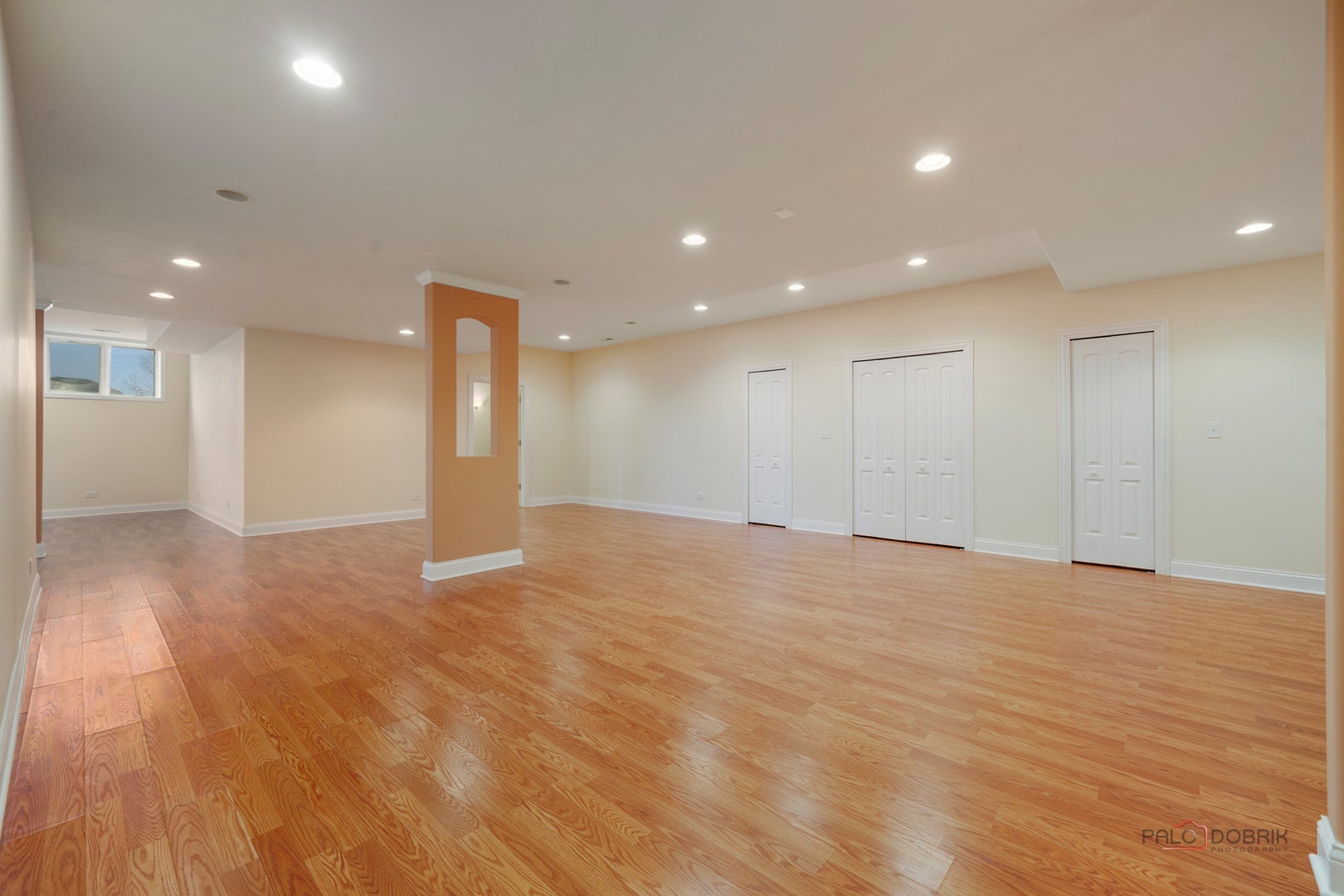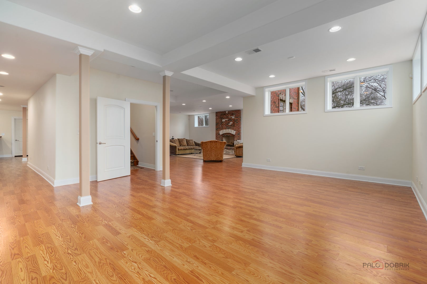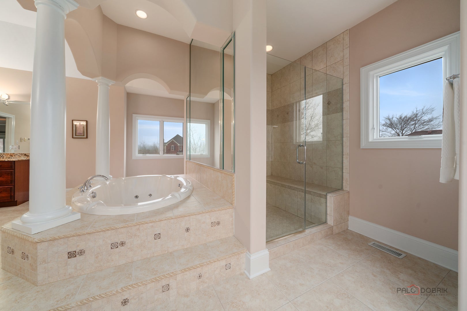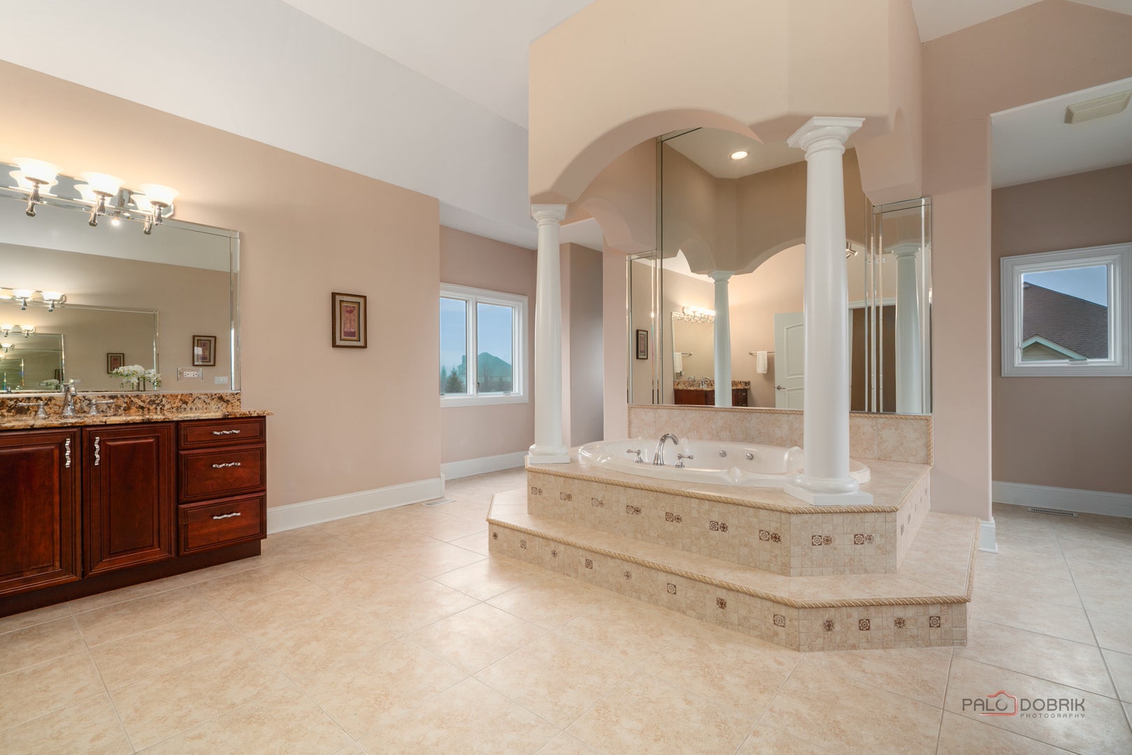 Welcome to this exceptional 6-bedroom, 5-full bathroom, cul-de-sac residence in prestigious Lincolnshire, proudly served by award-winning D103 and Stevenson High. The property is meticulously maintained and offers both tranquility and convenience--just a short walk to Laura B. Sprague School and Memorial Park, and minutes from the highway I-94 and Costco. Step into a welcoming foyer that opens to a sun-drenched living room, elegant dining room, bedroom/office with access to full bath, and two-story family room offering soaring ceilings with skylights and stunning floor-to-ceiling brick gas start fireplace. The kitchen facing to the beautiful backyard, features granite countertops that continue seamlessly into backsplash, abundant cabinetry, stainless steel appliances, a center island with seating and a generous breakfast bar. 2nd floor offers two master suites with vaulted ceilings, his and her walk-in closets and separated private staircase access. Three additional high-ceiling bedrooms along with a centrally located full bath and generous closet space will fit everyones needs. The luxury finished basement expands your living space with a full bath, gym space, game room, wet bar, wine cellar and tons of storage space. Whether you are hosting a party, family movie night, or a backyard BBQ, this home has it all! Additional highlights include fresh exterior paint (2025), deck paint (2026), new vanities master bathroom (2026), New dishwasher (2026), two furnaces 2025/2018, roof (2018), dual sump pumps, backup generator, and invisible fence.