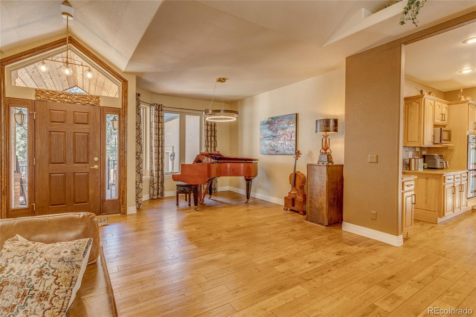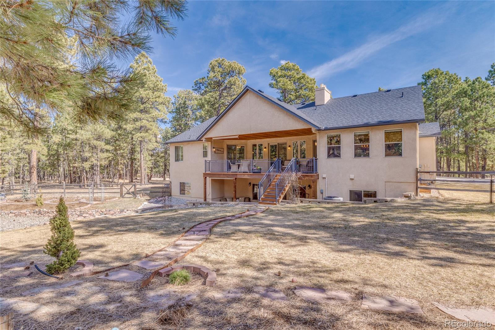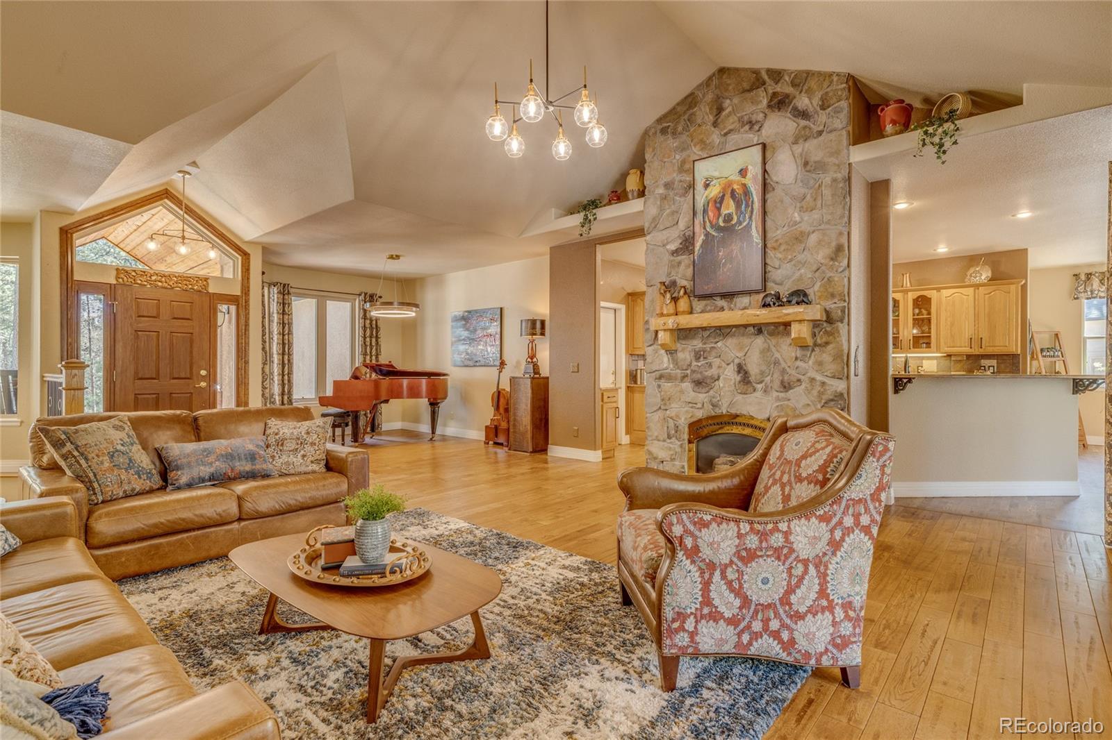 Welcome to this beautifully maintained home located in the desirable Wissler Ranch, corner lot sitting on 2.51 acres with a circular driveway. This impressive property offers five bedrooms, five bathrooms, three gas fireplaces, and more than seven combined oversized attached & detached garage spaces. The home is in immaculate, move-in ready condition and designed for comfortable living and effortless entertaining both inside and out. Upon entering, you are welcomed by a bright living area with vaulted 12-foot ceilings and a dramatic floor-to-ceiling stacked stone gas fireplace that creates a striking focal point. The living room flows seamlessly into the gourmet kitchen and dining area. The well-designed kitchen features abundant cabinetry, granite countertops, a large pantry, double ovens, and a spacious island with a gas cooktop that provides generous workspace for cooking and gathering. Large windows surround the dining area, filling the space with natural light. Just off the kitchen is a large laundry room with extensive cabinetry, a utility sink, and a nearby half bath for added convenience. Both the kitchen and living room provide direct access to the spacious 30 x 15 covered tongue-and-groove deck, perfect for outdoor dining, relaxing, or entertaining guests. The main level also includes a private office with double doors and a nearby full bathroom. The spacious primary suite features a 12-foot ceiling, private deck access, a five-piece bathroom, and a cozy sitting area with its own fireplace. The walk-out basement offers additional living space with 9-foot ceilings, large entertainment area with a gas fireplace, dry bar, flexible bonus room, and three additional bedrooms with well-designed bath access. A standout feature is the heated 30x39 detached garage with two 10-foot doors, ideal for RVs, boats, and projects. The home also features an updated Class 4 roof, adding durability and value. This property offers exceptional space, comfort, and versatility.