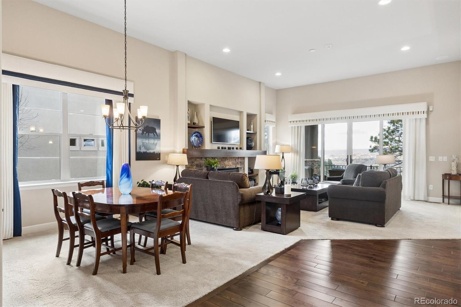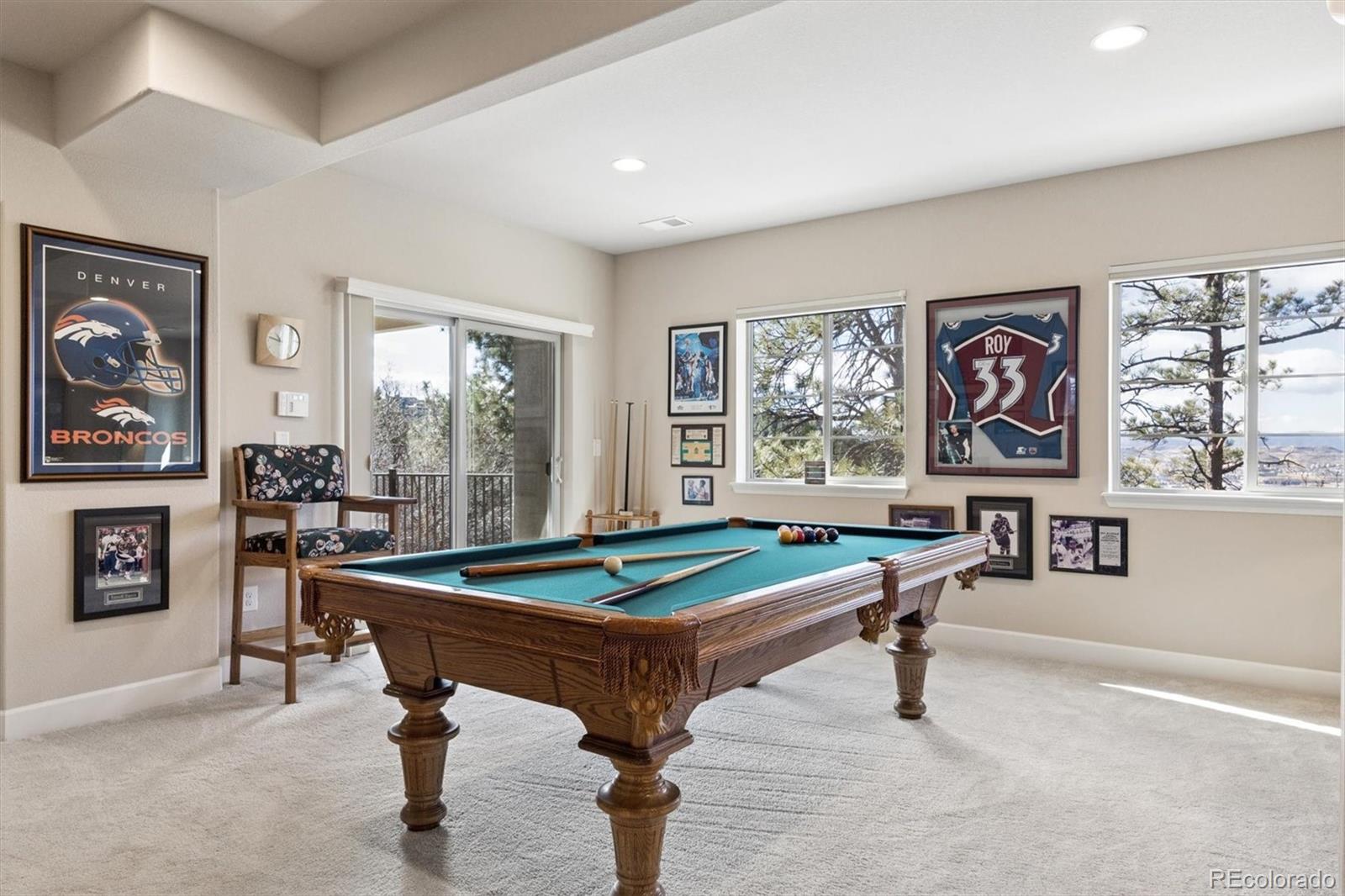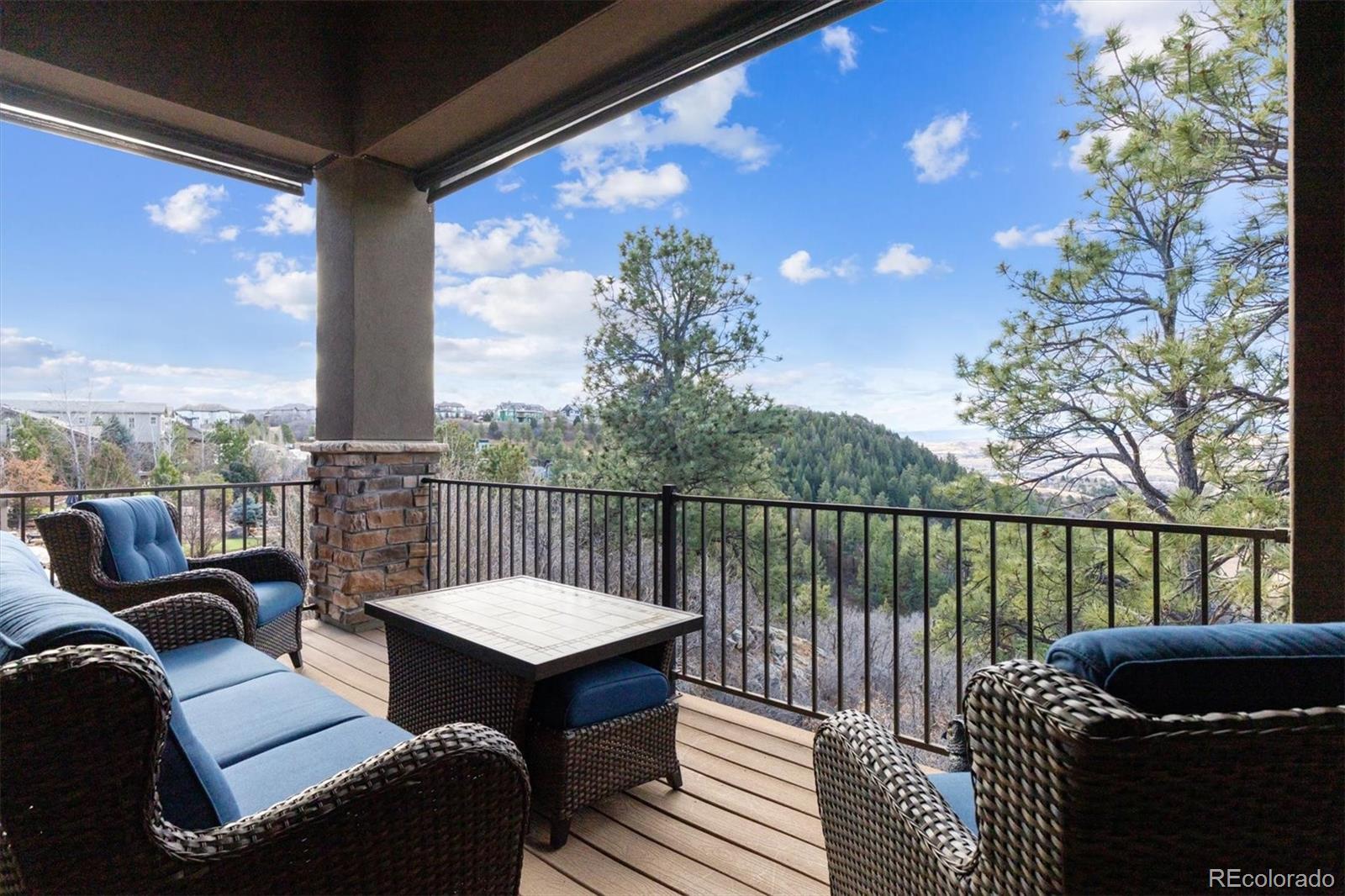 Spectacular mountain & valley views from Pikes Peak to the Sleeping Indian! Cliffside custom ranch style home, situated on a beautiful xeriscaped lot with rock outcroppings, mature pine trees & scrub oak, backs to a beautiful canyon! Beautiful water fall & perennials greet you as you approach the door. Abundance of windows to enjoy the sweeping views from every window! Extended hardwood floors through the entry into the kitchen. Main level Study or Office, right off the entry. Custom Window Treatments Throughout. Great room with fireplace, custom mantle and entertainment niches, TVs are included, with deck access. Deck with wrought iron railings & custom pull down shades to enjoy the views year round! Gourmet kitchen with all newer upgraded Jennair stainless appliances, newer Samsung refrigerator. Center island, granite counters, 42 inch soft close cabinets, gas cooktop, walk in pantry. Gorgeous Master Suite continues with the amazing views. Custom tile in the oversized 5 pc bath with views of the Sleeping Indian, big walk in closet! Two secondary bedrooms share the Jack n Jill bath. Main level Laundry Room with LG Washer & Dryer, it is plumbed for sink. Lower level walk out with large Family Room, TV is included, Billiards area, pool table & accessories are included. Guest Suite with 3/4 bath is perfect for company. Walk out onto the patio to enjoy this very peaceful setting. Unbelievable landscaping with water feature, many perennials, custom stone walking path. Covered front porch & so much more! May, 2023 new Lennox furnace & air conditioner and Smith 50 gal hot water heater! Remote automatic solar shades, with blinds & custom window treatments. Alarm system and 4 new exterior cameras. Oversized 3 car garage is completely finished. Pride of ownership show! Low taxes. This home is a Must See!