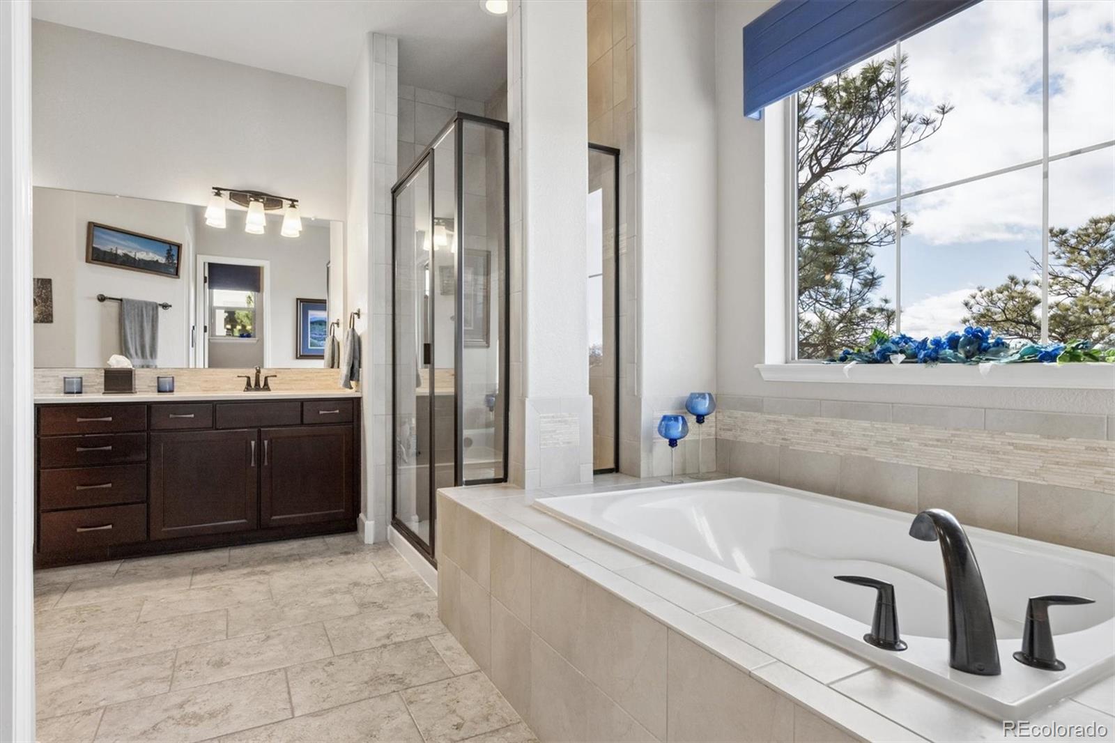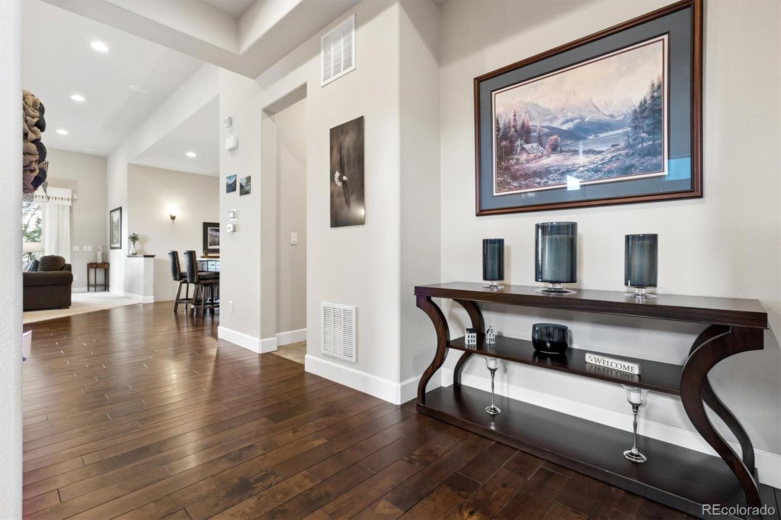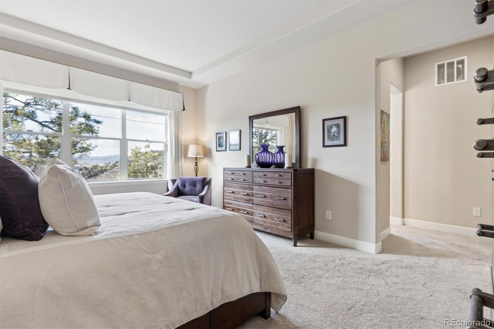 Spectacular mountain & valley views from Pikes Peak to the Sleeping Indian! Cliffside custom ranch style home, situated on a beautiful xeriscaped lot with rock outcroppings, mature pine trees & scrub oak, backs to a beautiful canyon! Beautiful water fall & perennials greet you as you approach the door. Abundance of windows to enjoy the sweeping views from every window! Extended hardwood floors through the entry into the kitchen. Main level Study or Office, right off the entry. Custom Window Treatments Throughout. Great room with fireplace, custom mantle and entertainment niches, TVs are included, with deck access. Deck with wrought iron railings & custom pull down shades to enjoy the views year round! Gourmet kitchen with all newer upgraded Jennair stainless appliances, newer Samsung refrigerator. Center island, granite counters, 42 inch soft close cabinets, gas cooktop, walk in pantry. Gorgeous Master Suite continues with the amazing views. Custom tile in the oversized 5 pc bath with views of the Sleeping Indian, big walk in closet! Two secondary bedrooms share the Jack n Jill bath. Main level Laundry Room with LG Washer & Dryer, it is plumbed for sink. Lower level walk out with large Family Room, TV is included, Billiards area, pool table & accessories are included. Guest Suite with 3/4 bath is perfect for company. Walk out onto the patio to enjoy this very peaceful setting. Unbelievable landscaping with water feature, many perennials, custom stone walking path. Covered front porch & so much more! May, 2023 new Lennox furnace & air conditioner and Smith 50 gal hot water heater! Remote automatic solar shades, with blinds & custom window treatments. Alarm system and 4 new exterior cameras. Oversized 3 car garage is completely finished. Pride of ownership show! Low taxes. This home is a Must See!