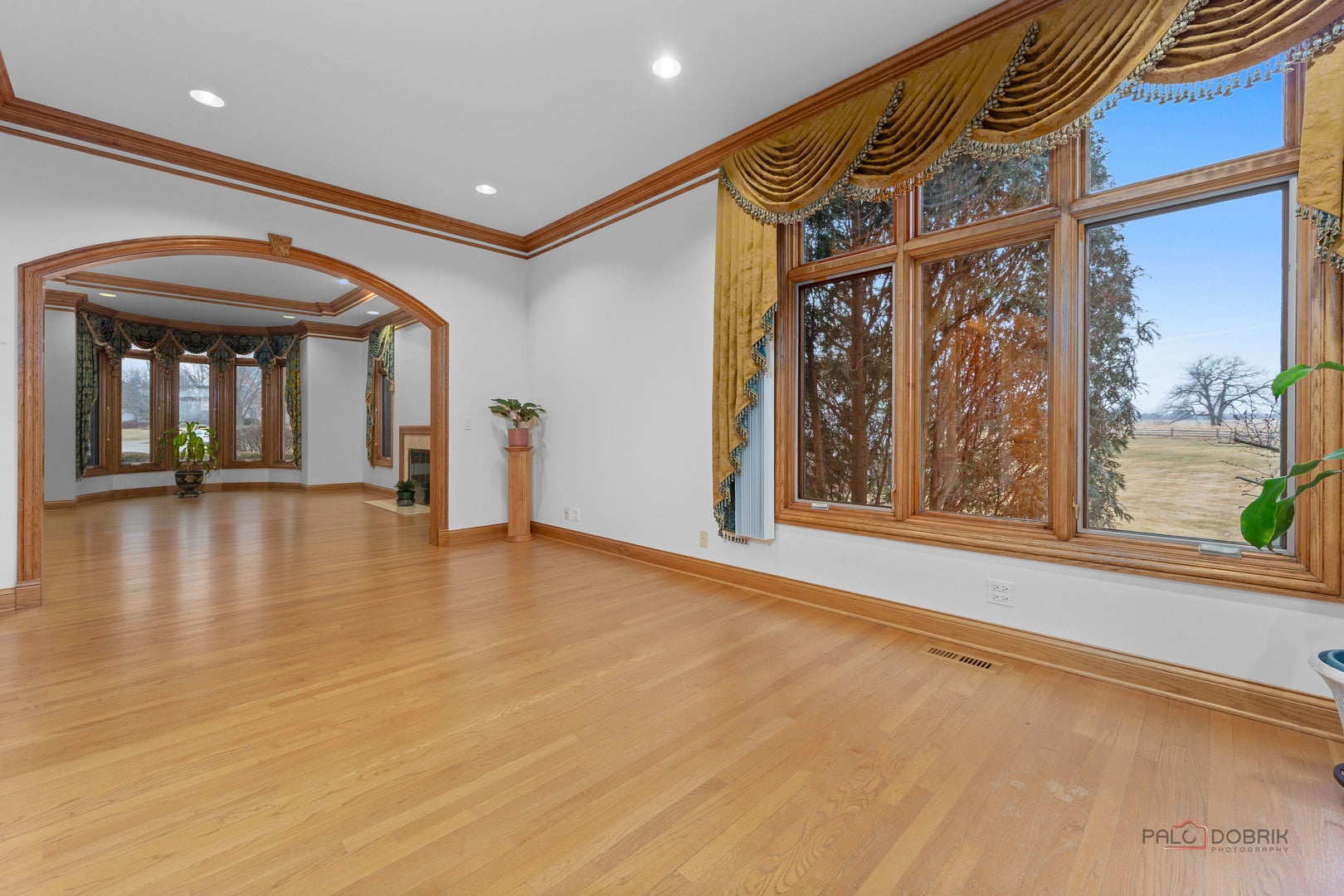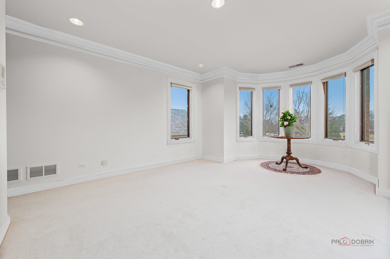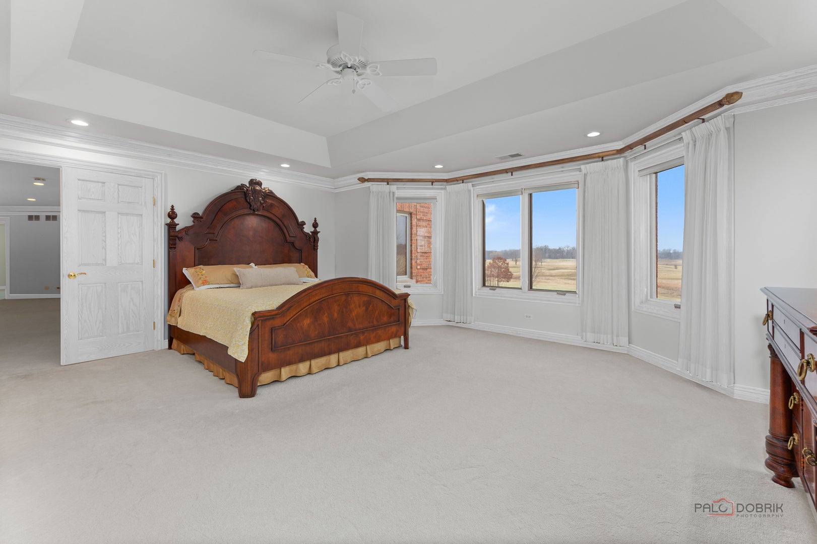 Incredible all-brick 5-bedroom, 5.2-bath home nestled on a quiet cul-de-sac within a prestigious gated community. Situated on nearly one acre, this beautifully landscaped property overlooks the 4th fairway of the Merit Club Golf Course, offering stunning views of ponds and rolling greens. This impressive residence showcases exceptional craftsmanship with detailed millwork, custom built-ins, elegant columns, arched doorways, inlaid hardwood floors, and high-profile moldings throughout. Luxury begins at the grand entrance with an oversized front door leading into a dramatic two-story foyer featuring a sweeping staircase and statement chandelier. The living room offers a tray ceiling, charming bay window, and cozy fireplace, while the formal dining room provides the perfect setting for entertaining and special gatherings. The gourmet kitchen features a large center island with breakfast bar and prep sink, granite countertops, a spacious walk-in pantry, and newer stainless steel appliances including a double oven. The bright and open eating area leads to a screened-in porch, ideal for enjoying the scenic surroundings. The breathtaking family room boasts a wall of windows, a fireplace, and access to a partial wraparound deck. A spacious den, laundry room, and powder room complete the main level. Upstairs, the luxurious primary suite offers spectacular golf course views, two walk-in closets, and a spa-like ensuite bath with dual vanities, whirlpool tub, and separate shower. Three additional bedrooms complete the second level, including two with private ensuites plus an additional full bath. The fully finished walkout basement expands the living space with a fifth bedroom, full bath, and a large recreation room with wet bar and access to a brick paver patio-perfect for entertaining or relaxing. Additional highlights include professional landscaping and a heated three-car garage. Enjoy resort-style living in this spectacular gated community adjacent to a private golf club, while being just minutes from shopping, dining, the train, and tollway access.
