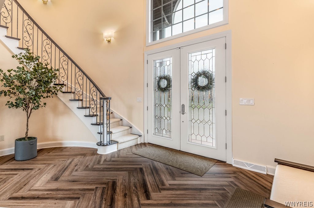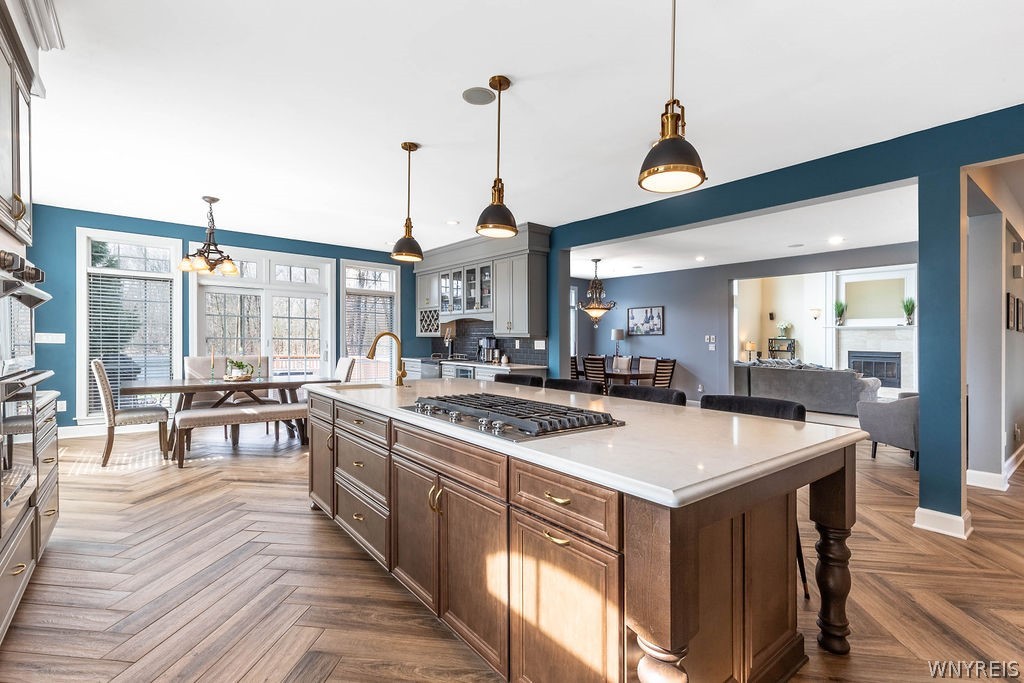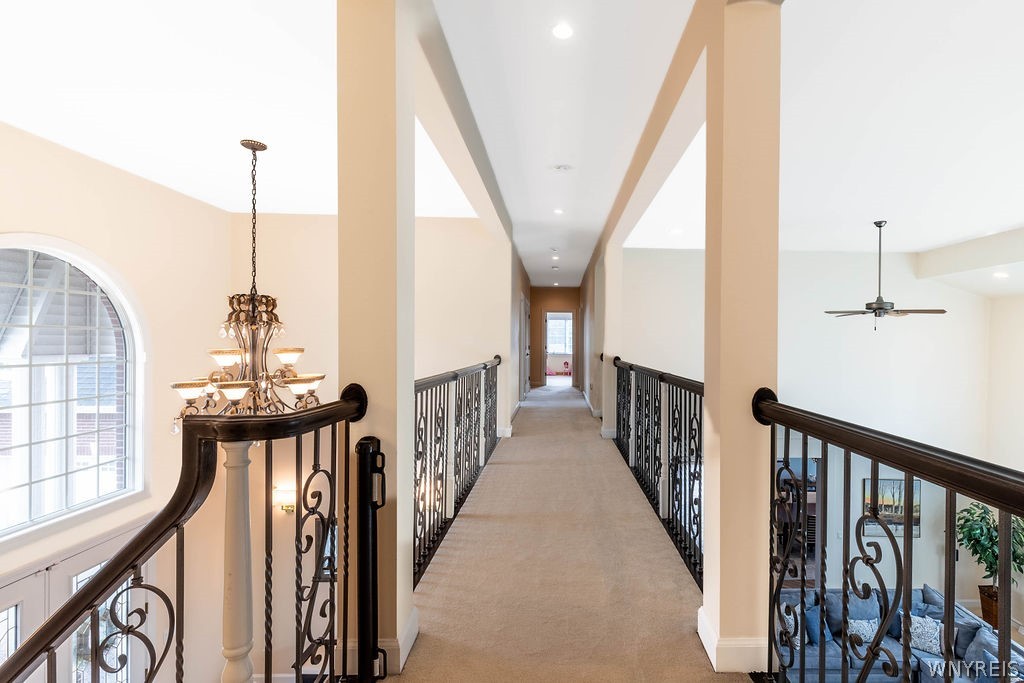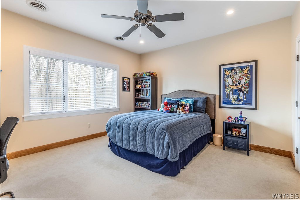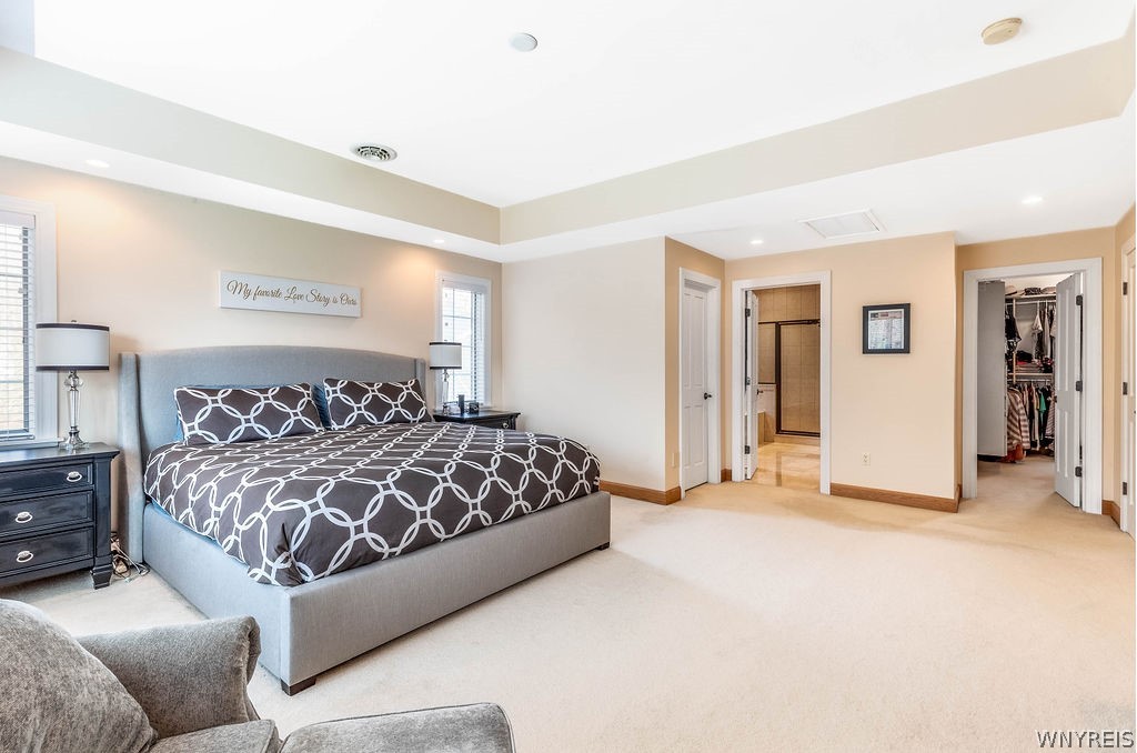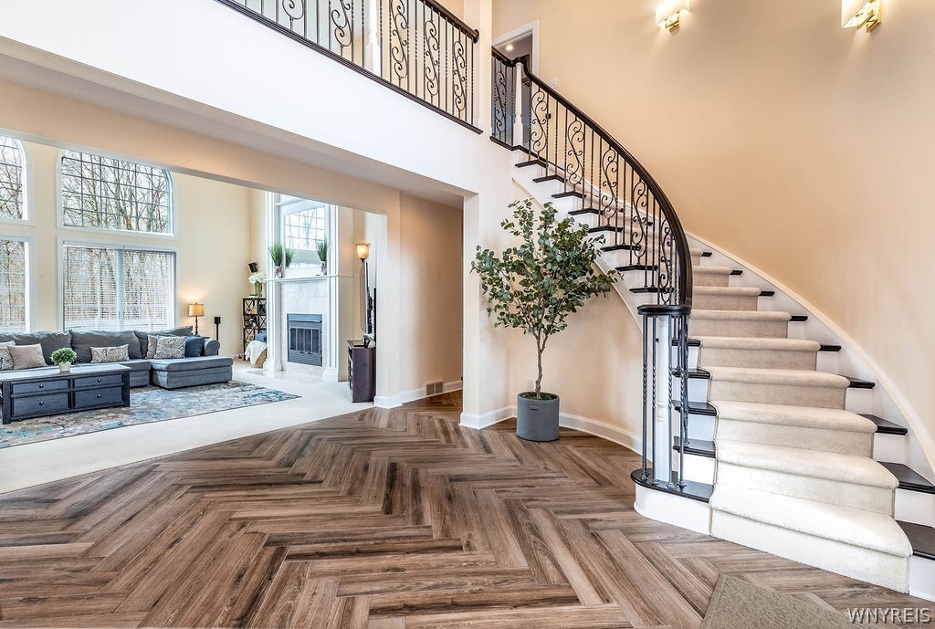 This magnificent 5-bedroom, 5.5-bath estate offers over 5700 square feet of beautifully designed living space & is sure to impress from the moment you arrive. A picturesque tree-lined driveway leads to a striking full brick exterior with a stamped concrete covered porch, setting the tone for the elegance within.Step into the grand 2-story foyer featuring porcelain flooring & a dramatic curved staircase. The soaring 2-story great room showcases a stunning wall of windows, a custom gas fireplace & recessed lighting, creating a bright yet inviting atmosphere. The formal dining room is perfect for hosting memorable gatherings, while the living room provides a cozy space to relax. The updated kitchen is a chef's dream, complete with a center island & breakfast bar, abundant cabinetry, quartz countertops, built-in gas cooktop, convection oven, microwave, walk-in pantry, coffee bar, & wine chiller. The sun-filled eating area is surrounded by windows & opens through sliding doors to a spacious deck overlooking the fully fenced yard & shed. The first floor also features a bedroom with en suite bath, a spacious office with a wall of windows & laundry room with washer & dryer included. This level offers excellent in-law potential. Upstairs, you'll find four generously sized bedrooms with dual access points. The luxurious primary suite boasts tray ceilings, two walk-in closets & spa-like bath with whirlpool tub, separate tiled shower, and dual vanities. Additional bedrooms include one with a cathedral ceiling & another with its own en suite & walk-in closet. A massive bonus room adds even more flexibility to the space. The finished basement expands the home even further, offering over 3,200 square feet of additional living space. Enjoy a private media room with screen, exercise room, bar area with wet bar, & full bath. Additional highlights: 2 furnaces, 2 A/C units, 2 hot water heaters, generator, central vac, solid wood six panel doors & custom blinds. Heated 3.5 car garage w/hot & cold water & center drain. Highly desirable area near parks & nature trails. Updates: kitchen '20, A/C & furnace units '22, hot water heaters '19 & '22. Sq ft adj per appraiser's measurements