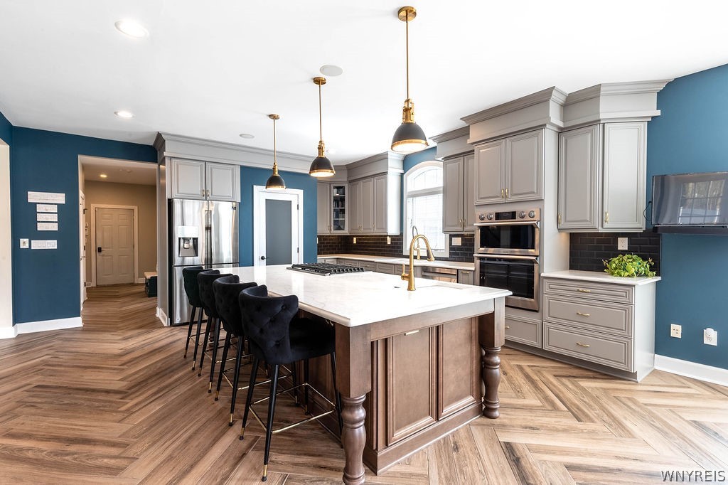 This magnificent 5-bedroom, 5.5-bath estate offers over 5700 square feet of beautifully designed living space & is sure to impress from the moment you arrive. A picturesque tree-lined driveway leads to a striking full brick exterior with a stamped concrete covered porch, setting the tone for the elegance within.
